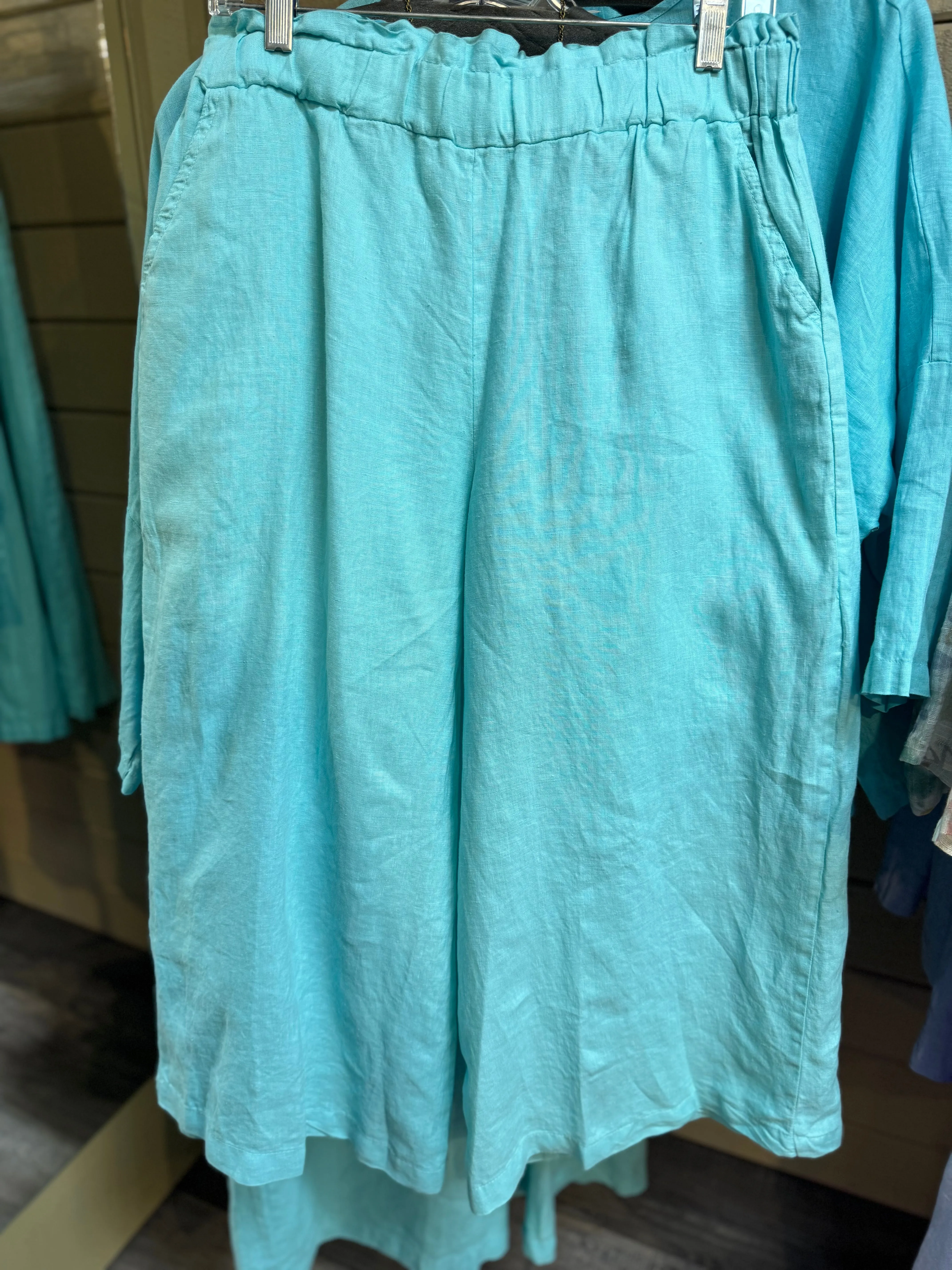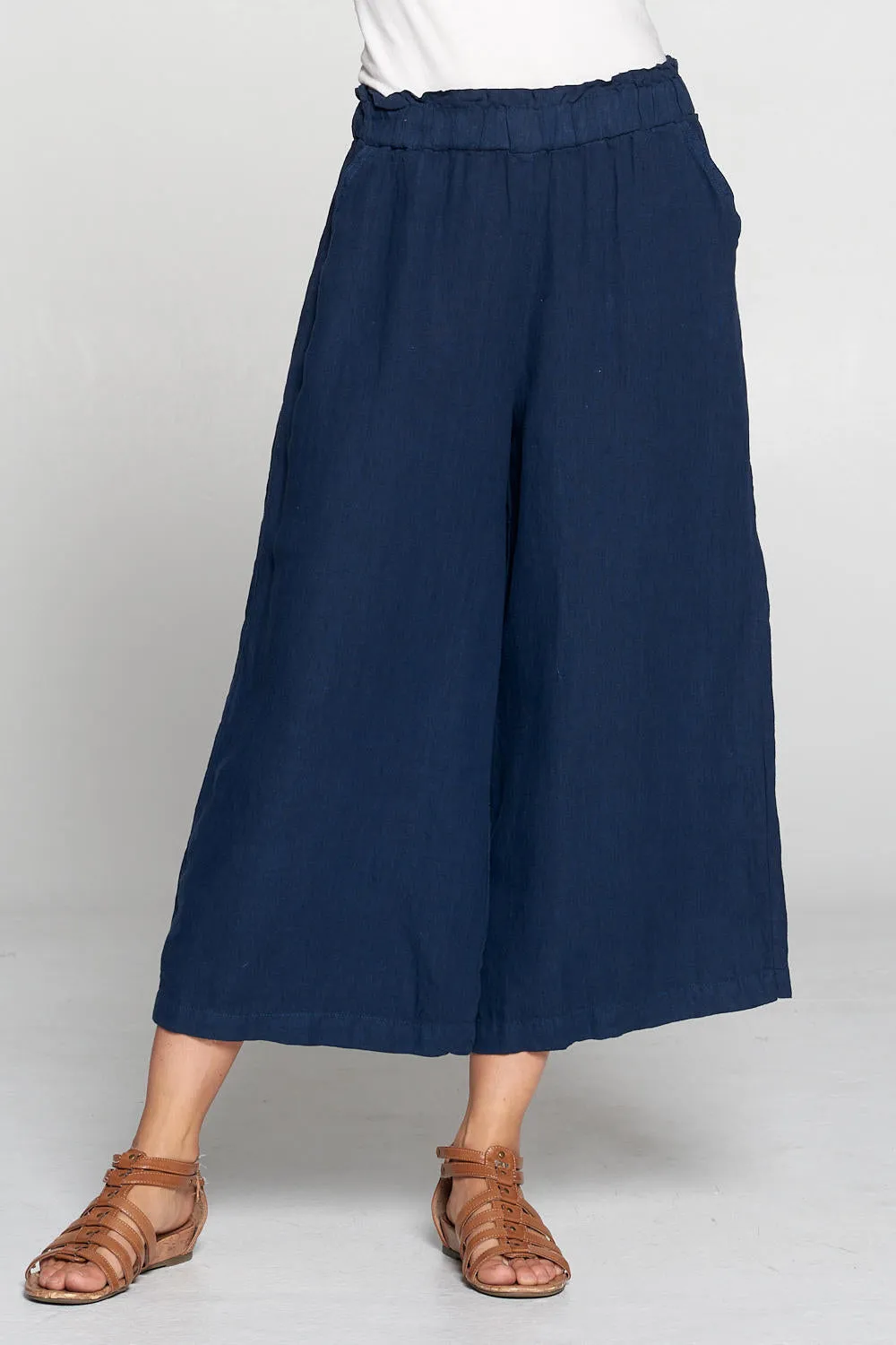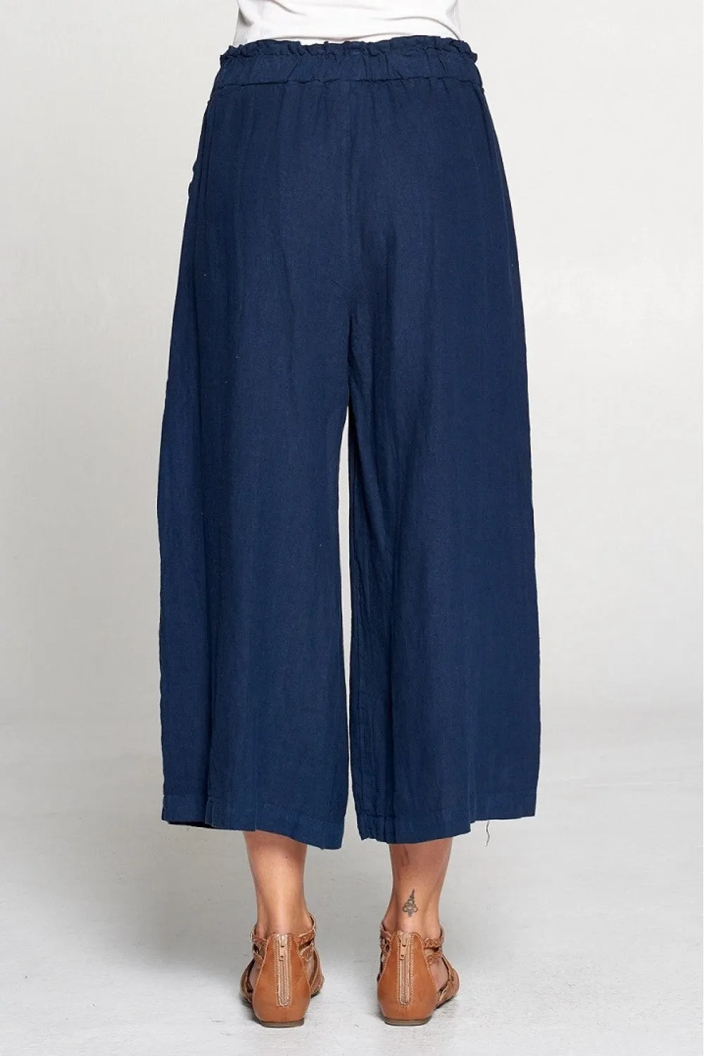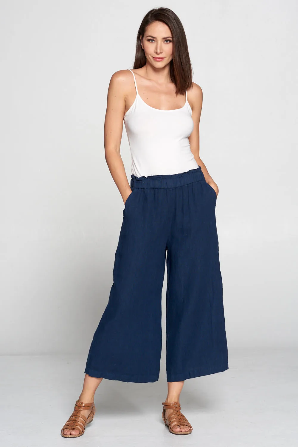 Unleash your spring and summer style with these amazingly versatile pants! The high elastic waist not only provides a comfortable fit, but also boasts a charming smocked ruffle design for a touch of fun. Made with 100% linen in the USA, these Gauchos offer both breathability and ultimate comfort all day long.