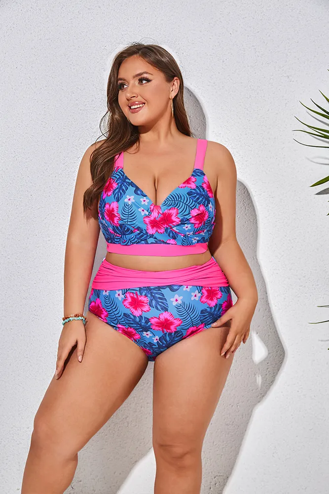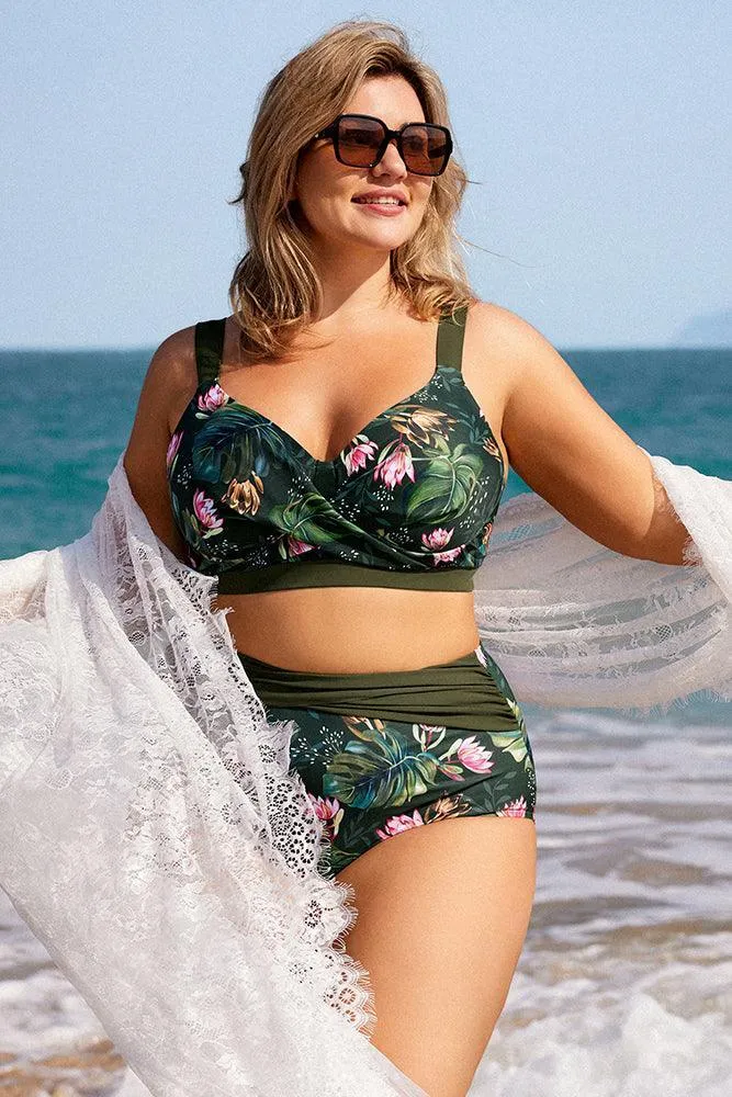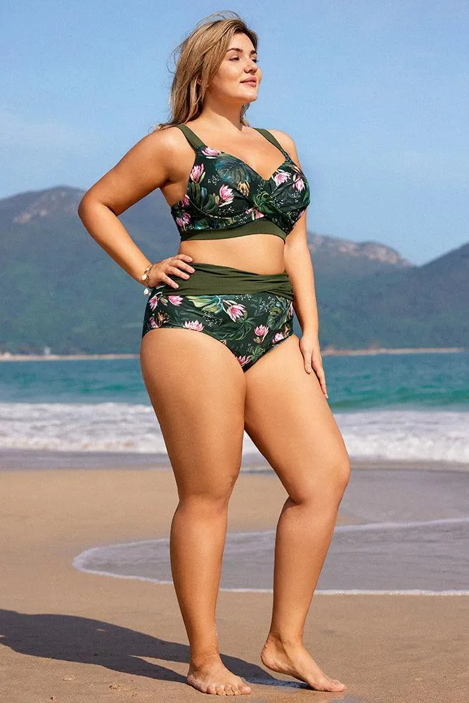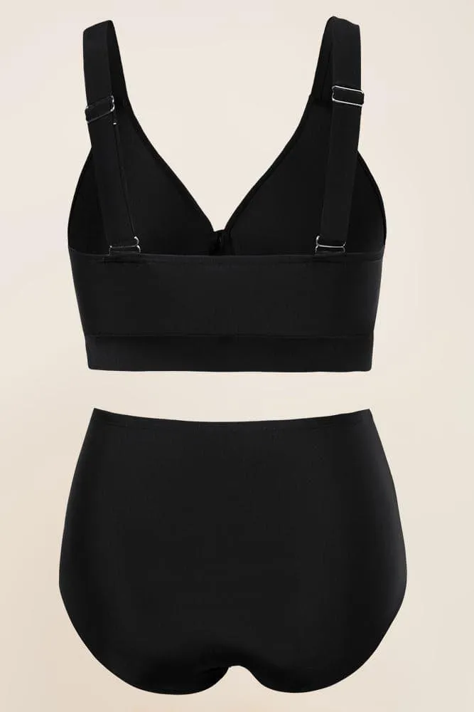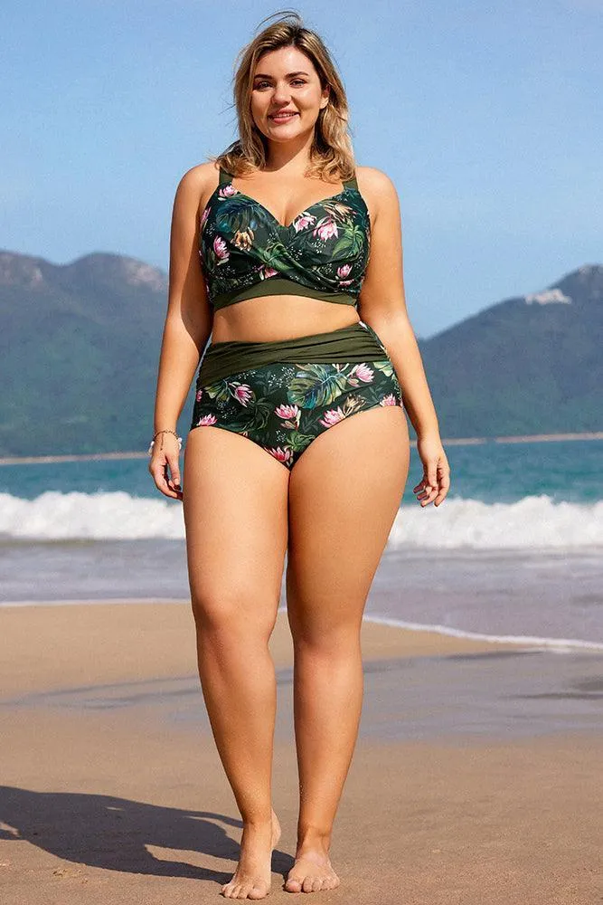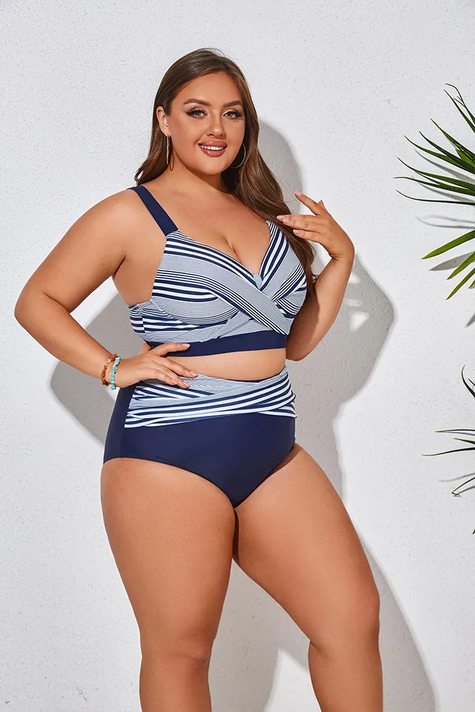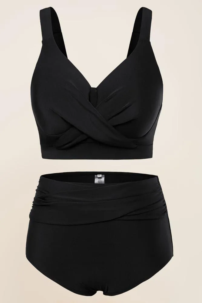 HN Women Plus Size 2pcs Set Swimsuit Cross Over Padded Tops High Waist Briefs