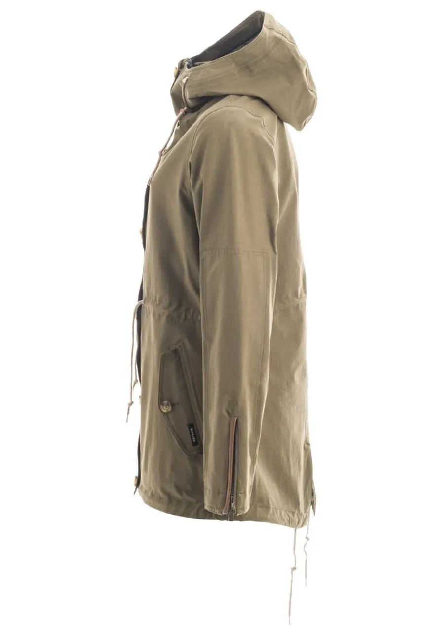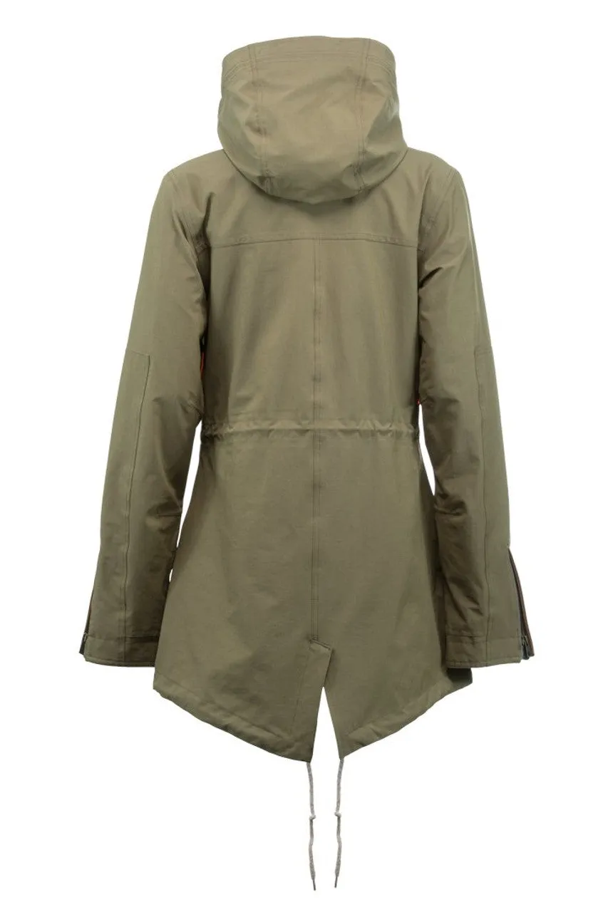 Holden Fishtail Jacket Womens Olive Longer fitting trench silhouette that pairs authentic military inspiration with performance shell function. Premium leather adds in some the high-end styling, 20K stretch fabric guarantees elemental protection and optimal mobility. Waterproof/Breathable: 20K/20K Taping: Fully taped seams Fabric: Outer shell: Stretch 94% nylon 6% spandex ripstop Lining: S.Café® fabric from upcycled coffee grounds: fast dry, anti-microbial, cool touch Features: Fishtail back hem - YKK Metaluxe® Mirror-like finish zippers - Underarm ventilation with open hole mesh - Genuine leather detailing throughout - Zippered cuff closure - 3-way adjustable hood - Draw cord waist adjuster - Interior zip pocket with headphone port - Interior mesh goggle pocket - Removable powder skirt with DWR treated embossed taffeta - Anti-element wrist gaiters Eco-friendly features: Ships in a biodegradable bag, Eco-Friendlier DWR and waterproof lamination, Back hood cord tension locks/cord adjusters made with recycled plastic