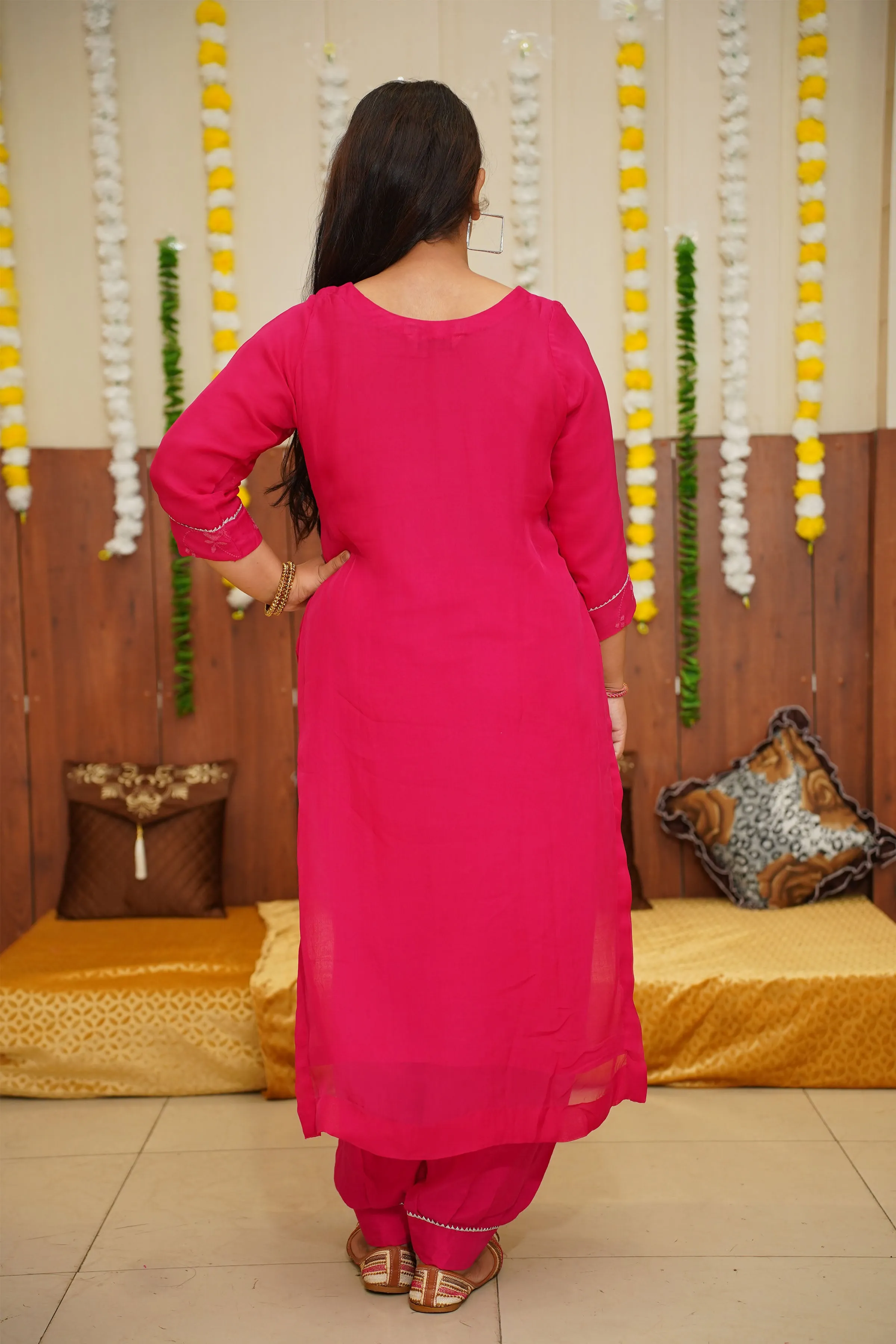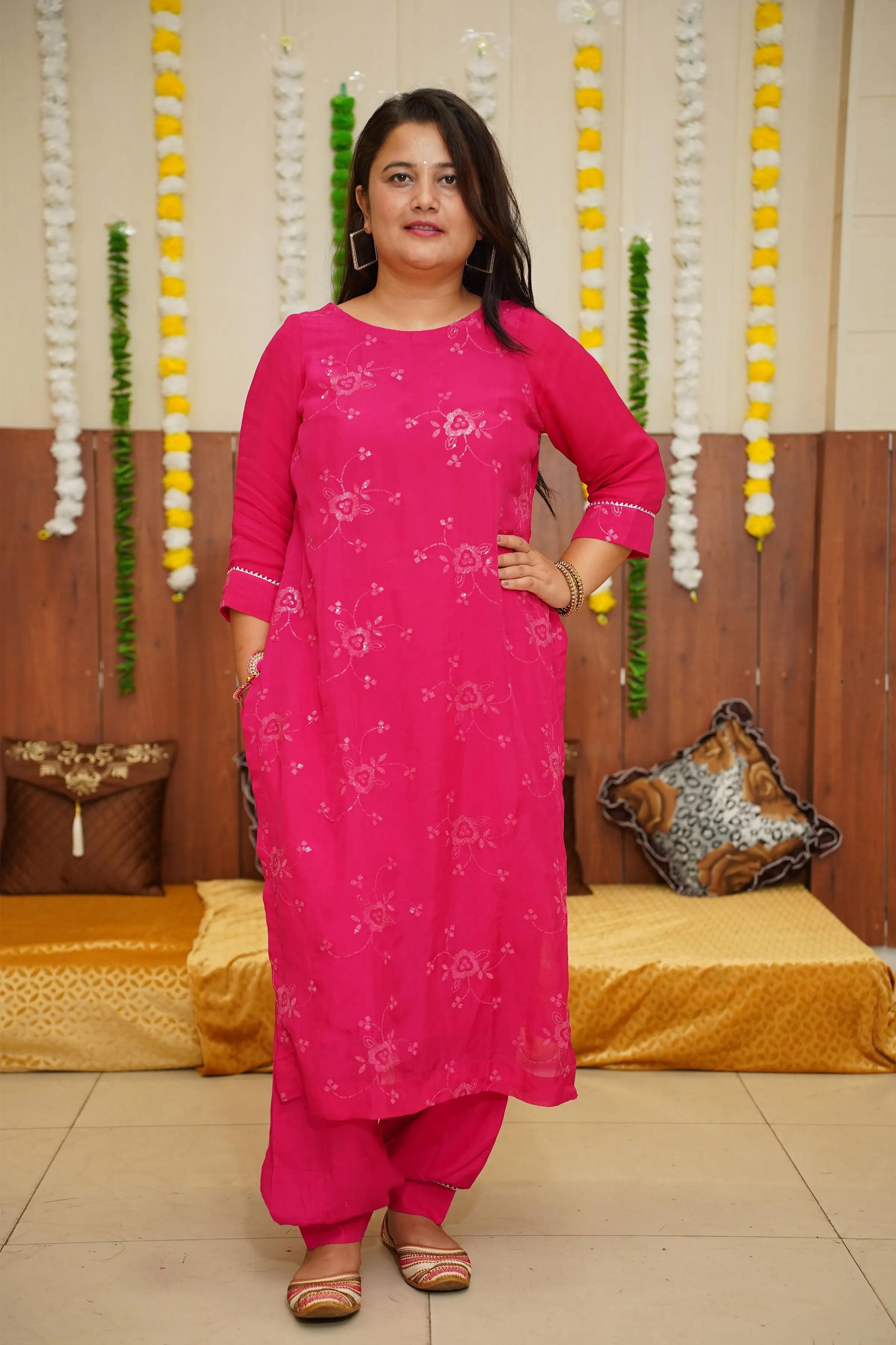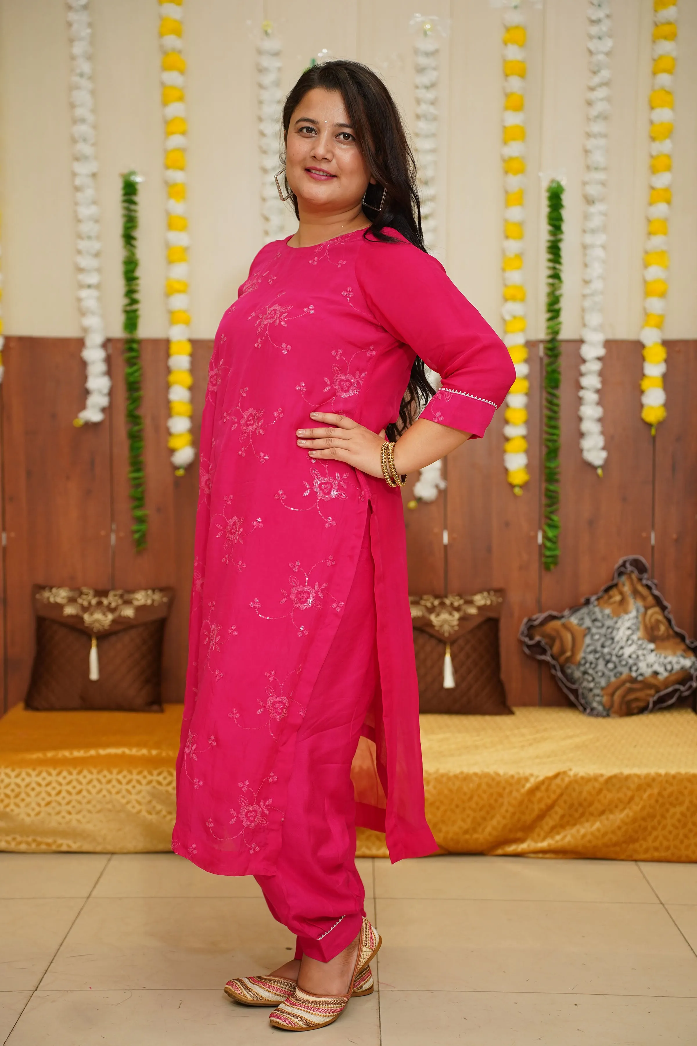 Introducing a stunning Hot Pink Sequined Organza Suit Set, perfect for any special occasion. The suit is made from delicate and sheer organza fabric, giving it a lightweight and breezy feel. The bright shade is a beautiful and feminine color that is sure to make you stand out. The suit is elevated with intricate handwork, adding a touch of elegance and sophistication.