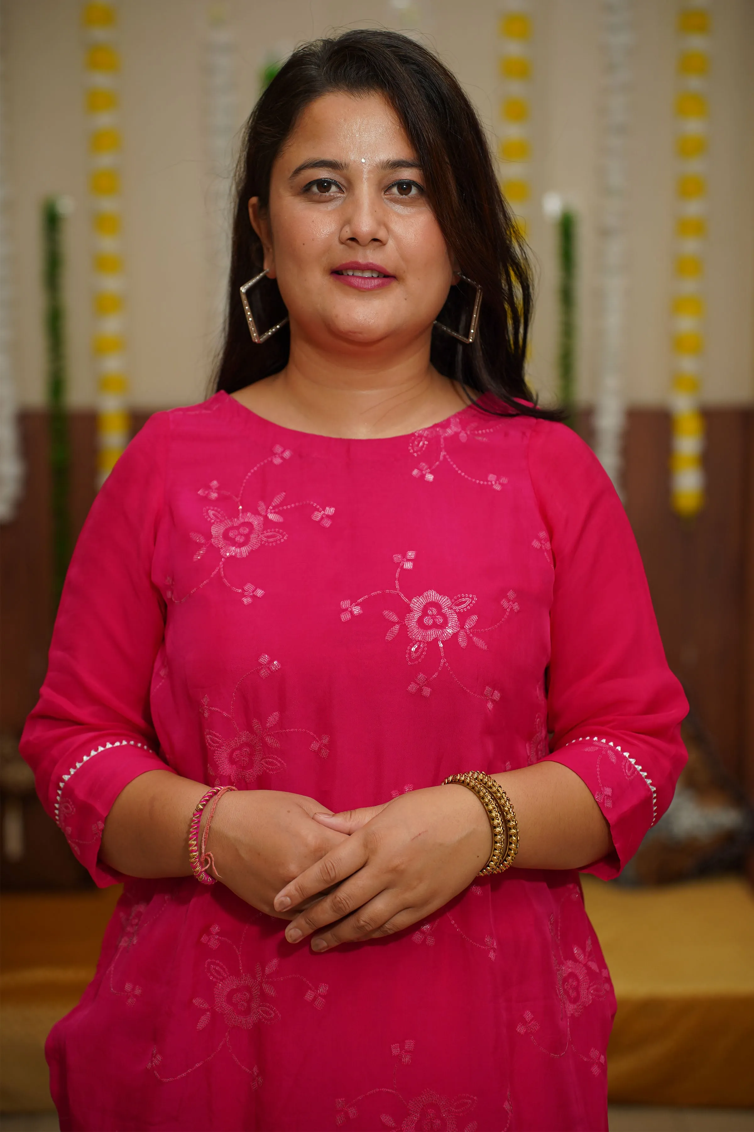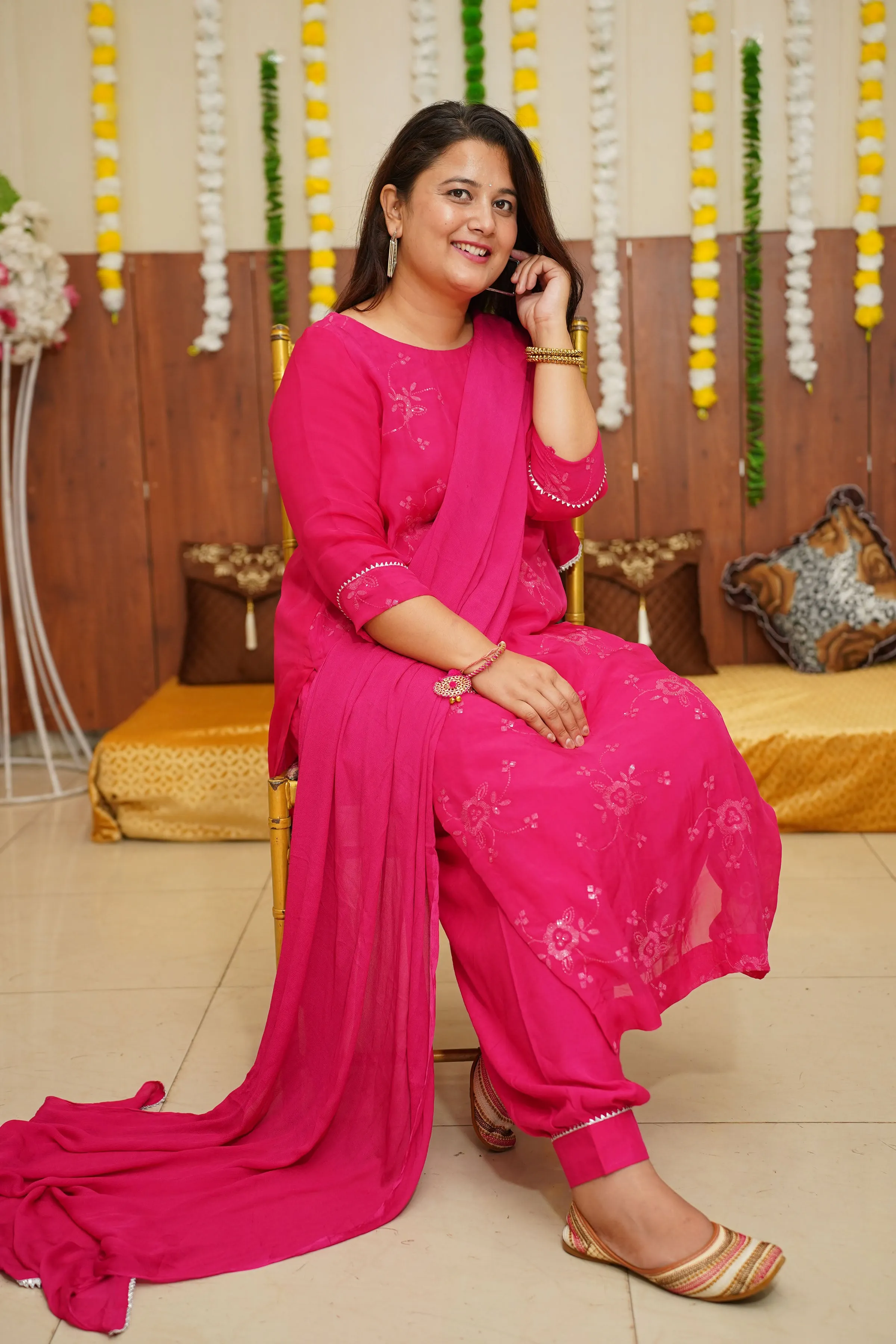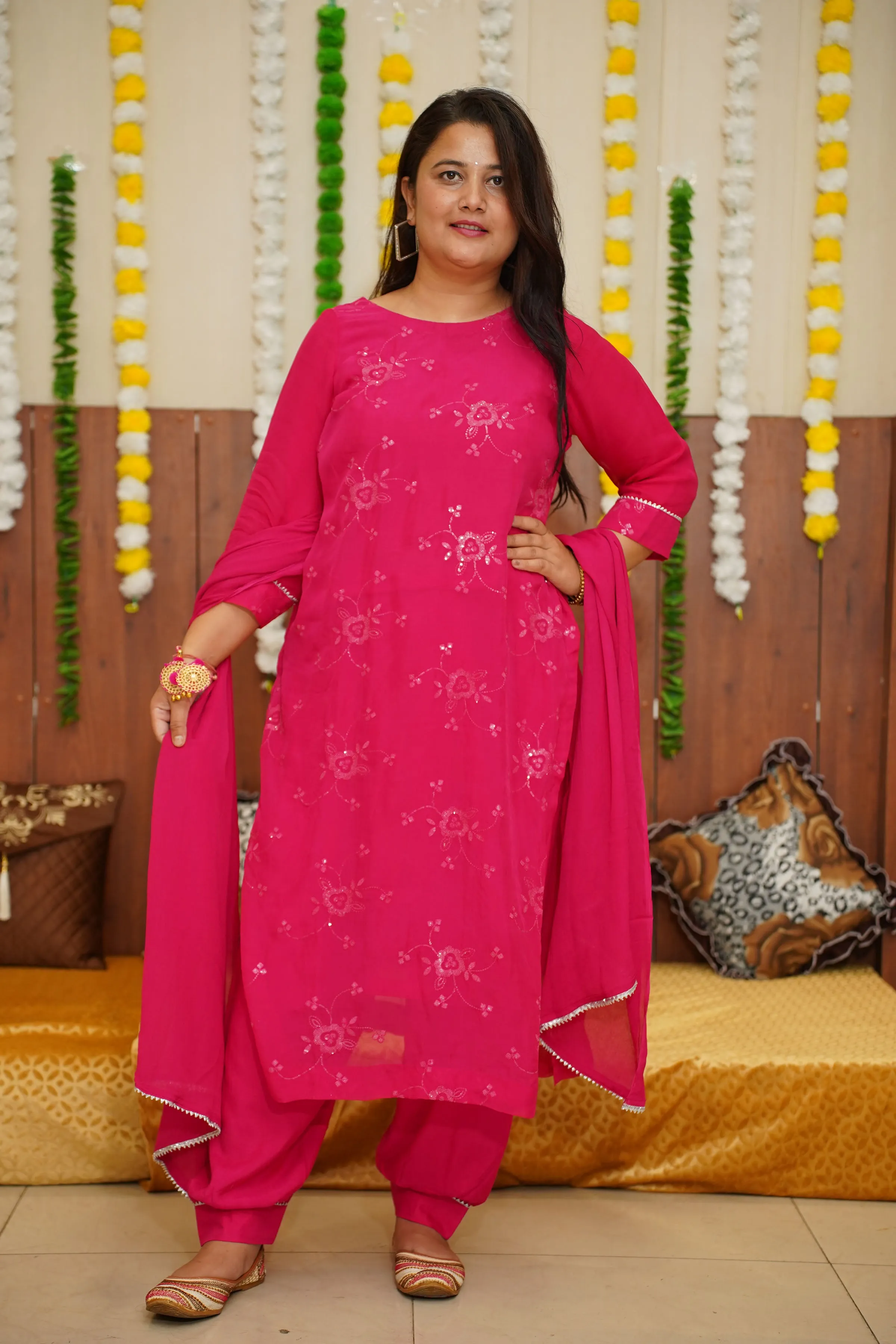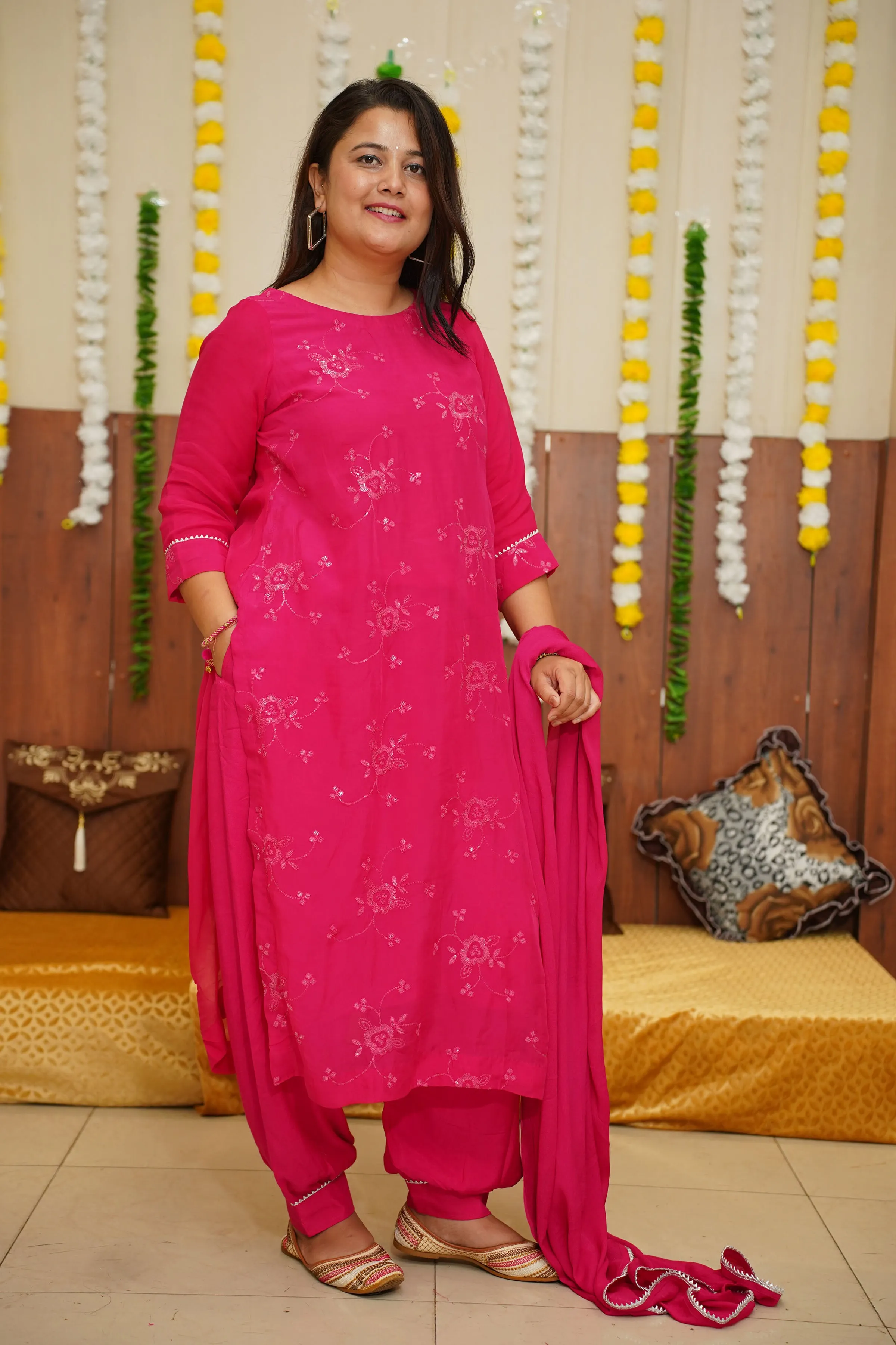 Introducing a stunning Hot Pink Sequined Organza Suit Set, perfect for any special occasion. The suit is made from delicate and sheer organza fabric, giving it a lightweight and breezy feel. The bright shade is a beautiful and feminine color that is sure to make you stand out. The suit is elevated with intricate handwork, adding a touch of elegance and sophistication.