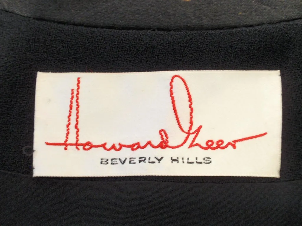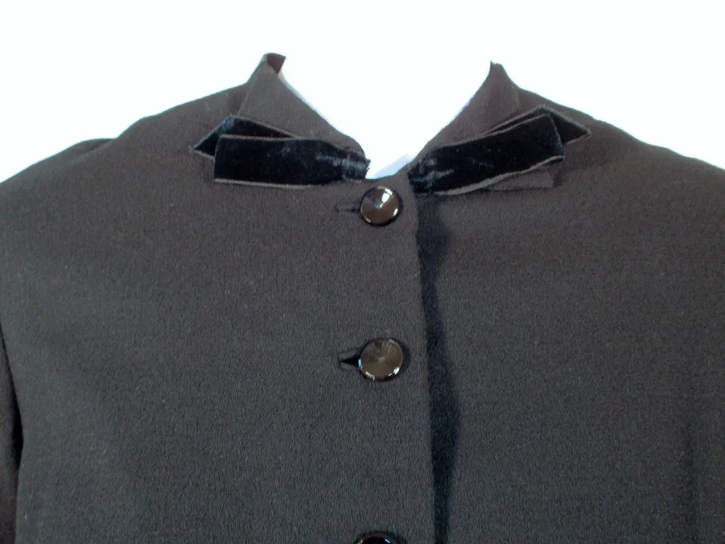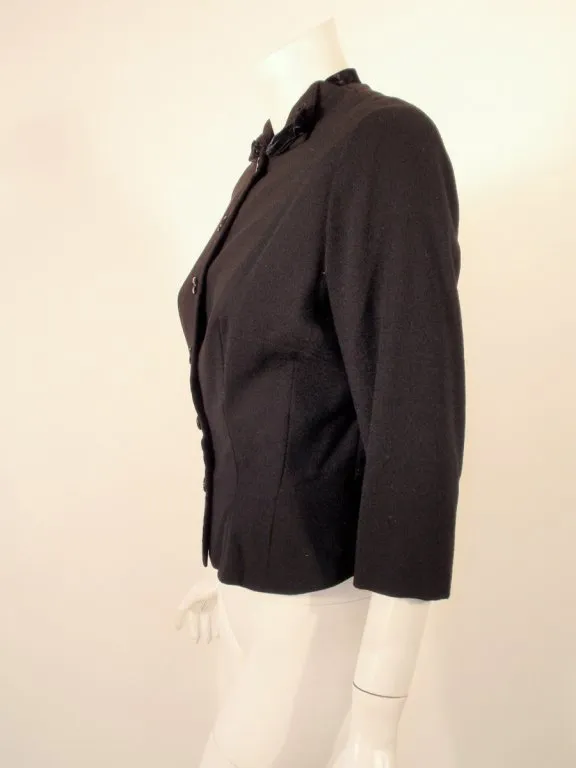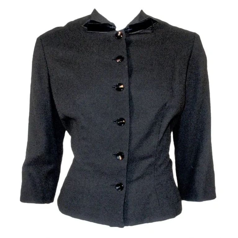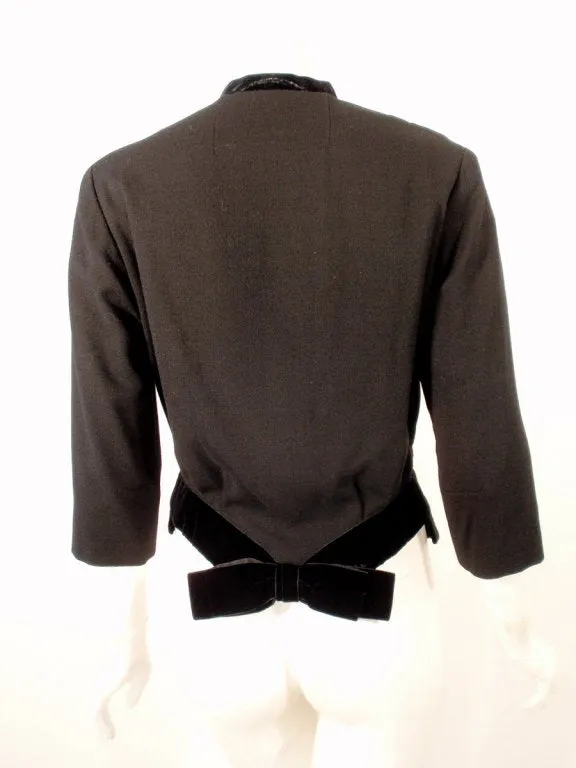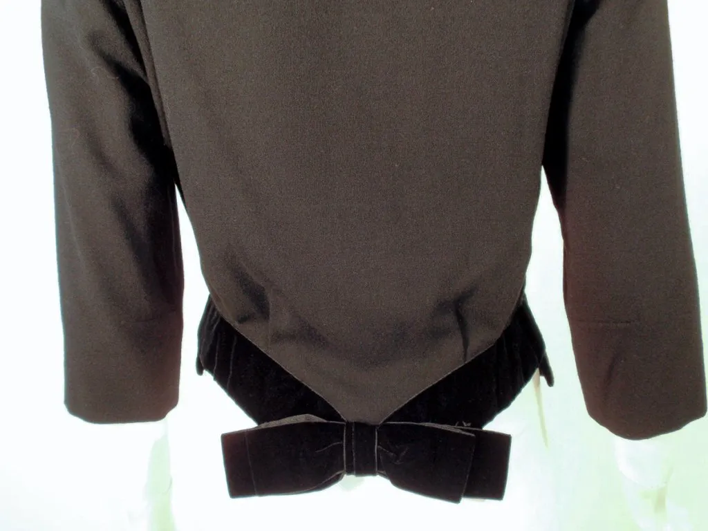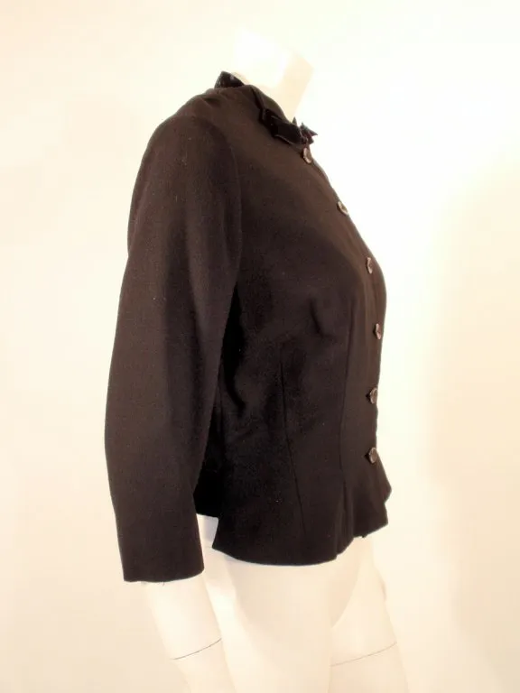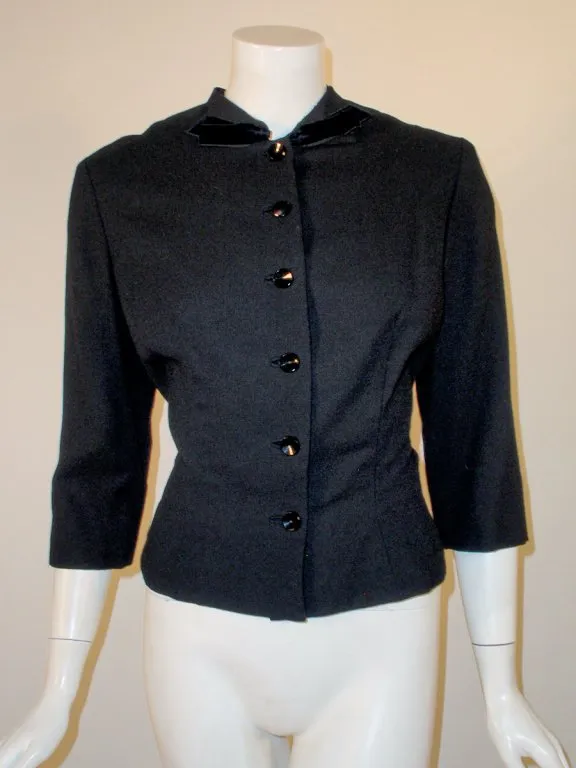 This is a charming vintage fitted jacket from designer Howard Greer. it is made of a light weight black wool, with black velvet trim on the collar and a bow at the back. Fully lined in black silk. Vintage