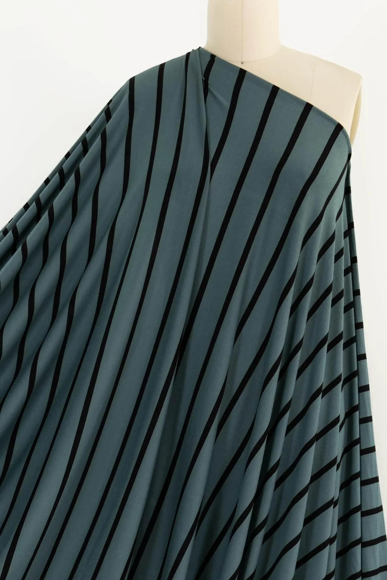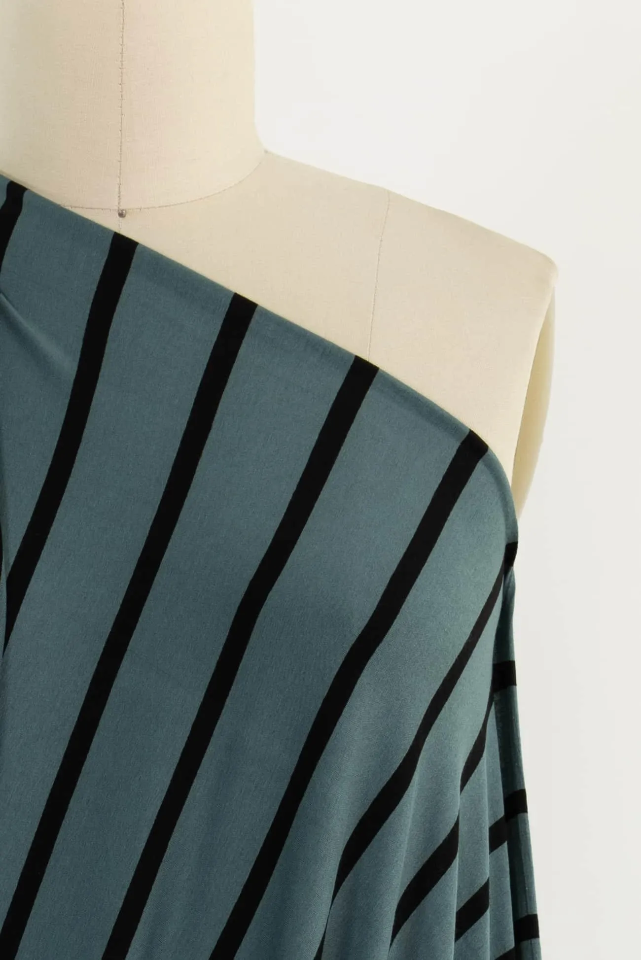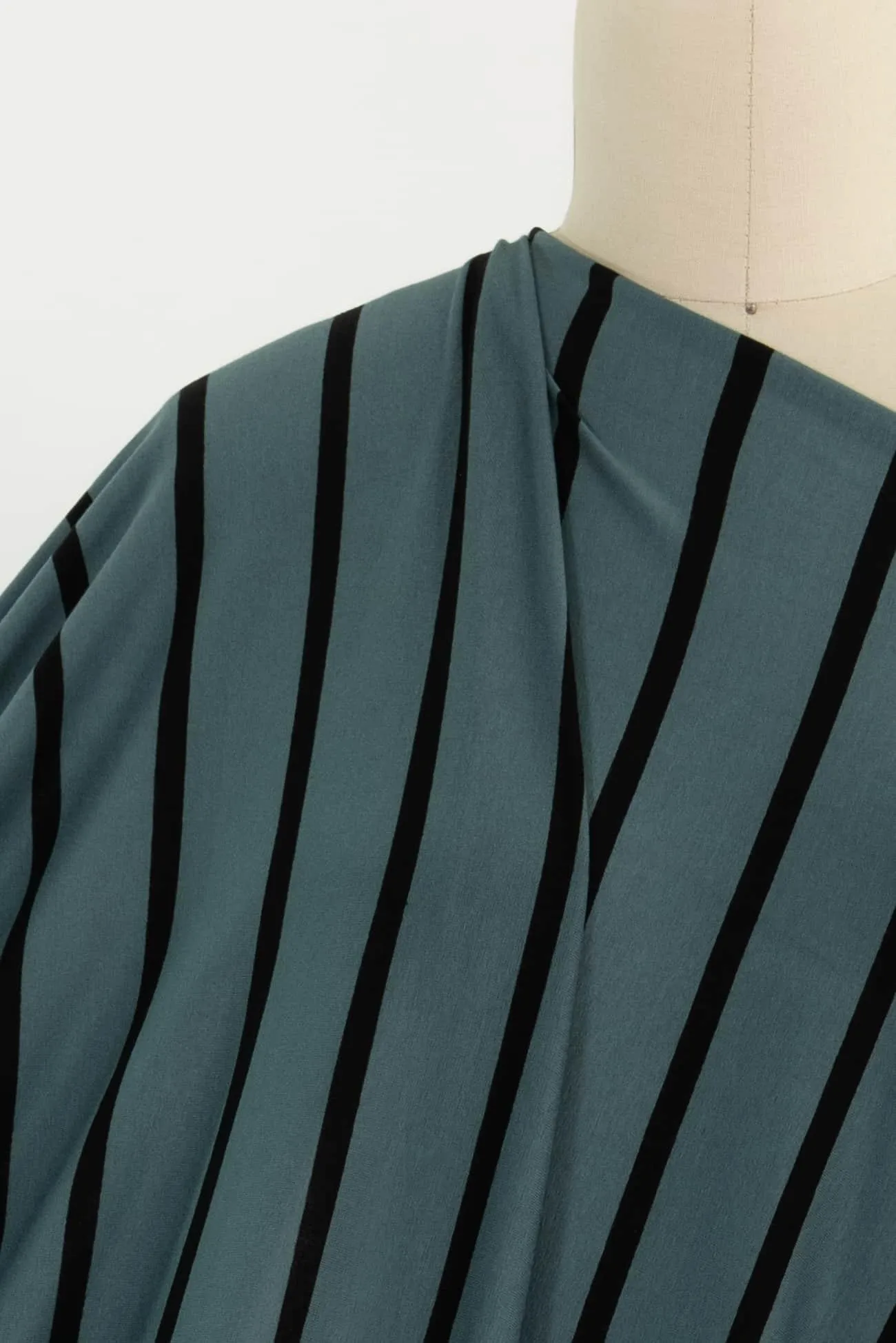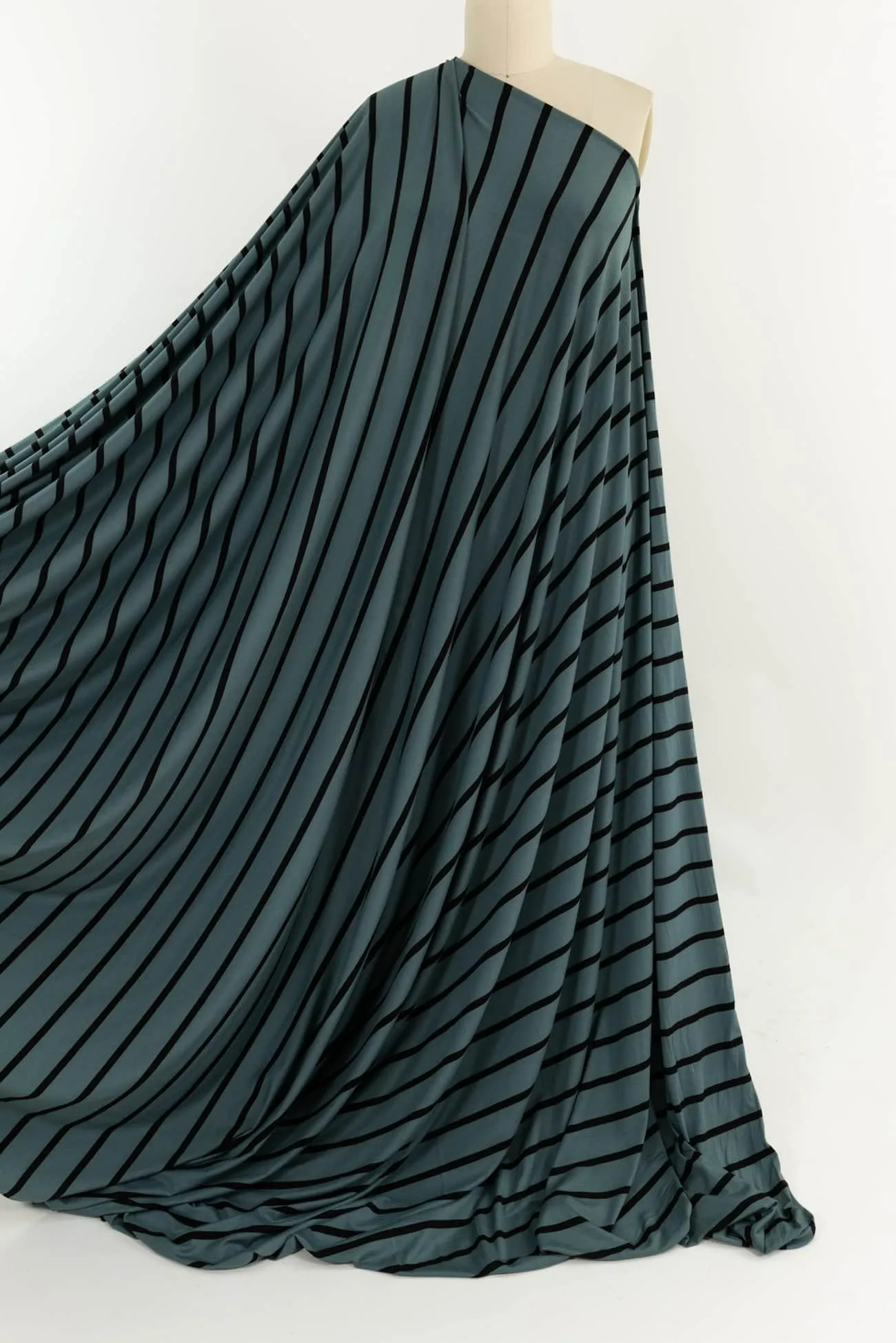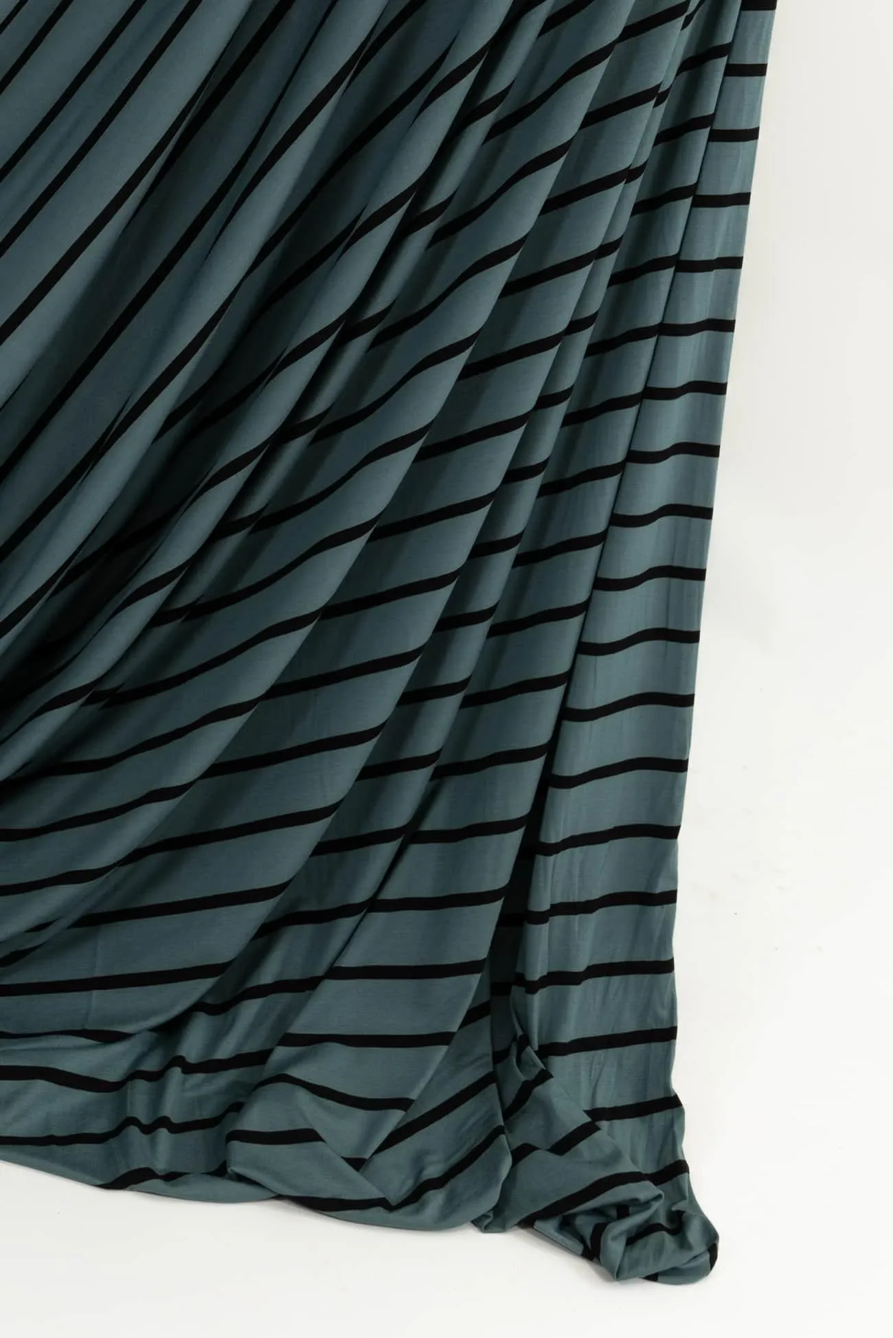 Dusty blue and black horizontal stripes, (1 ⅞" repeat), in a beautiful quality jersey knit. Manufactured in the USA, this is a perfect light/mid weight with enough substance and stability to skim the body in the most flattering way. Opaque, 4-way stretch and some rolling at the cut edge. A beautiful knit with a soft hand, fluid drape and a smooth matte finish. Just right for t-shirts, tunics, dresses, soft pants, leggings, a cardi, skirt or mens. Also great for trims, bindings and contrast pieces.