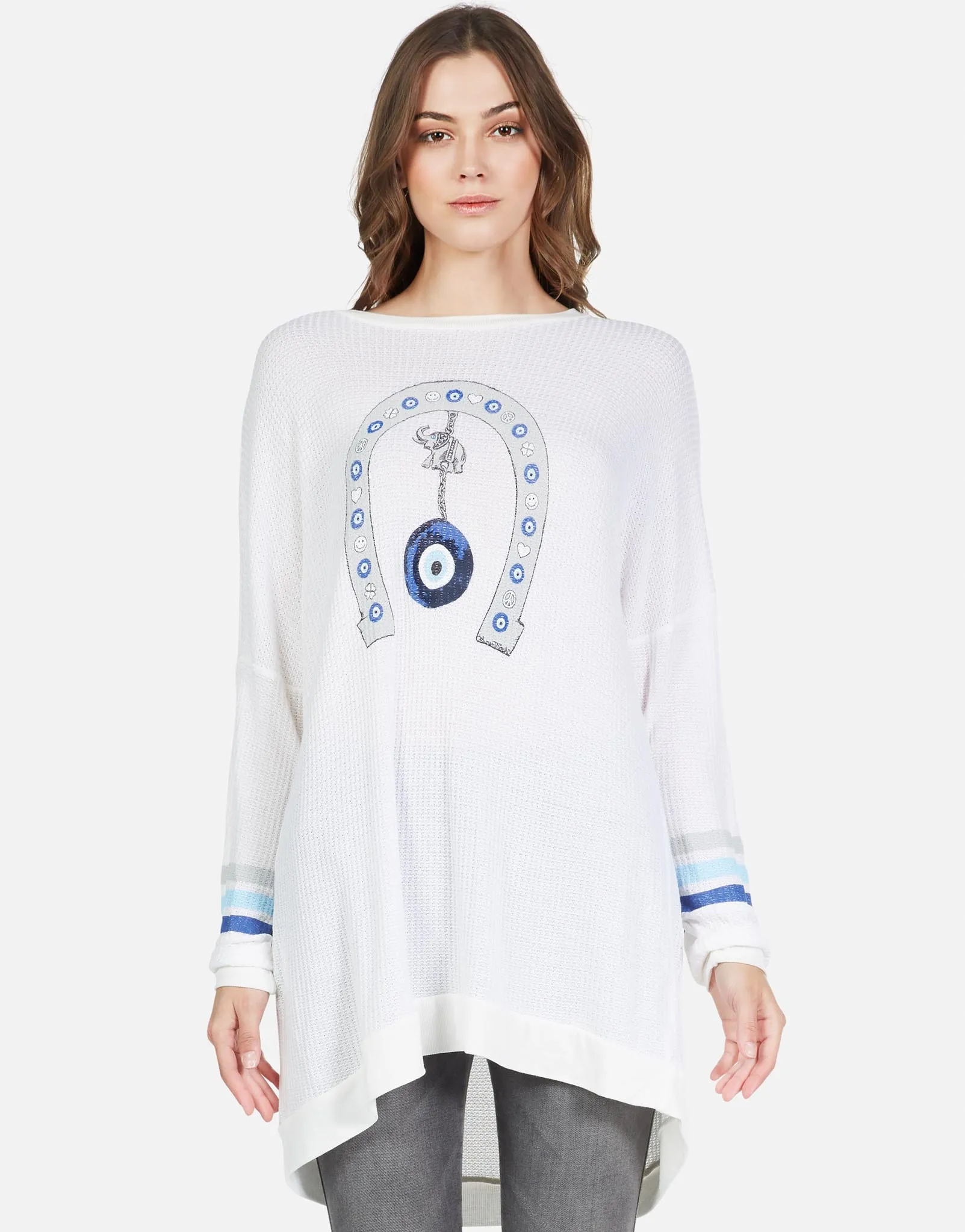 Lucky Eye Horseshoe Printed on Ultra Soft Lightweight Pullover in White by Lauren Moshi.