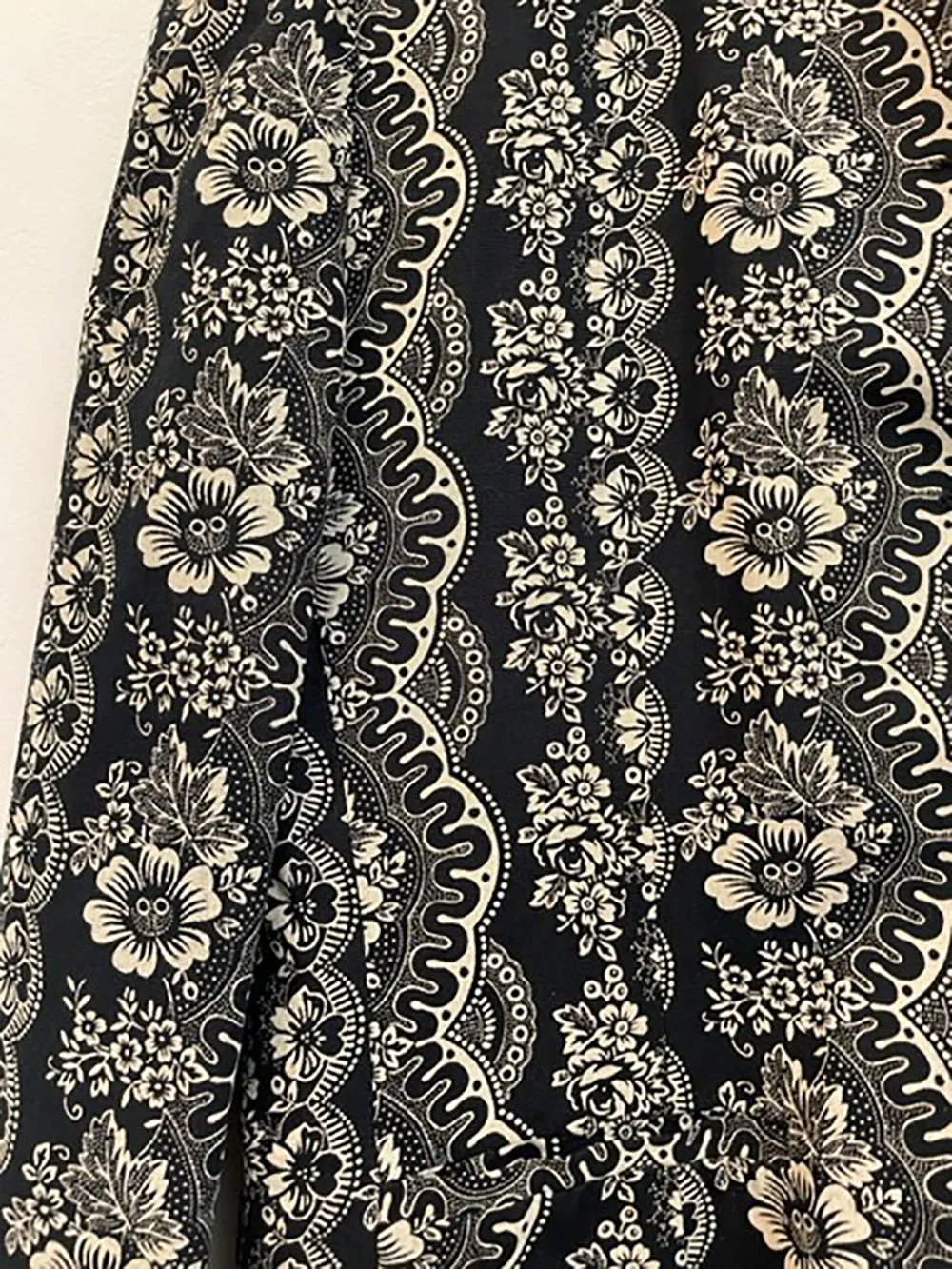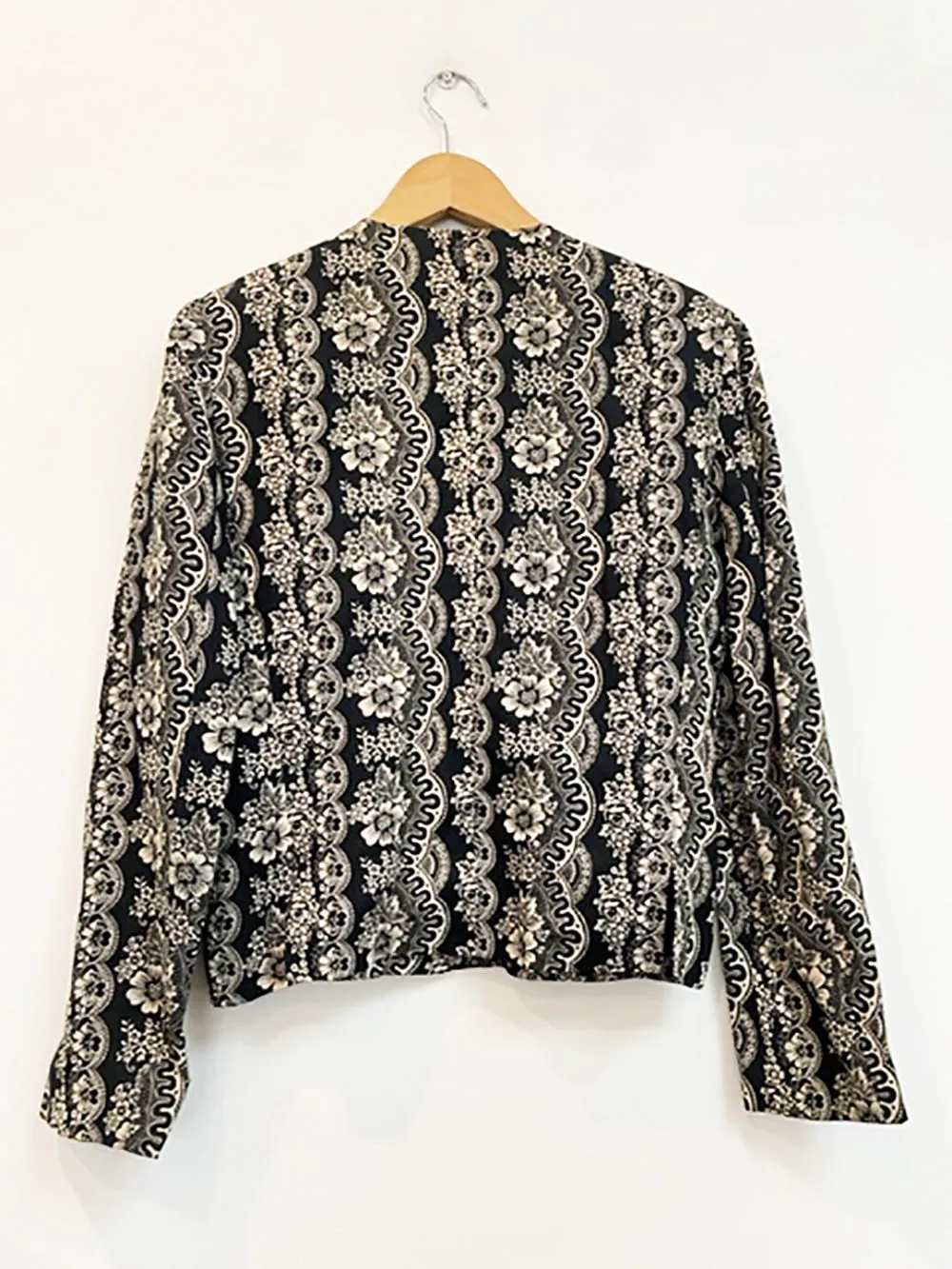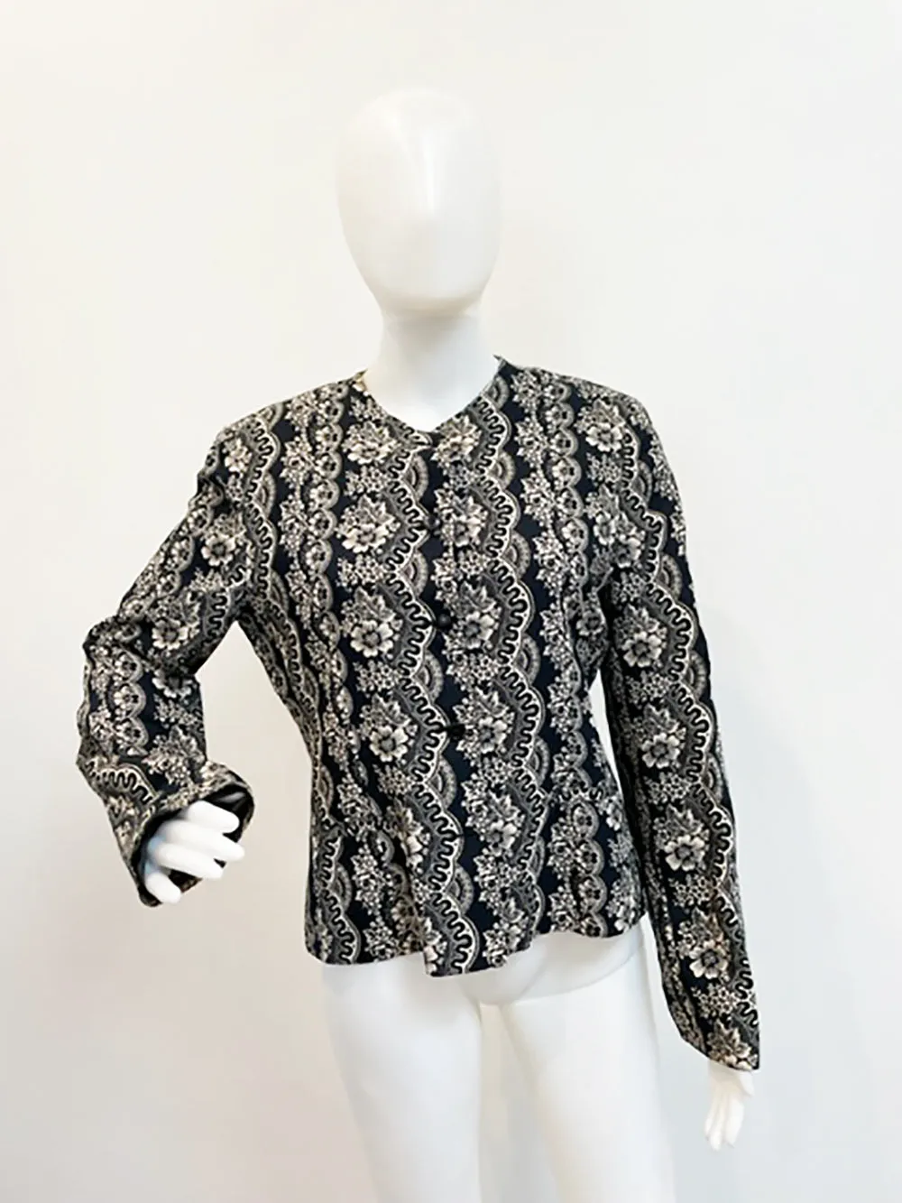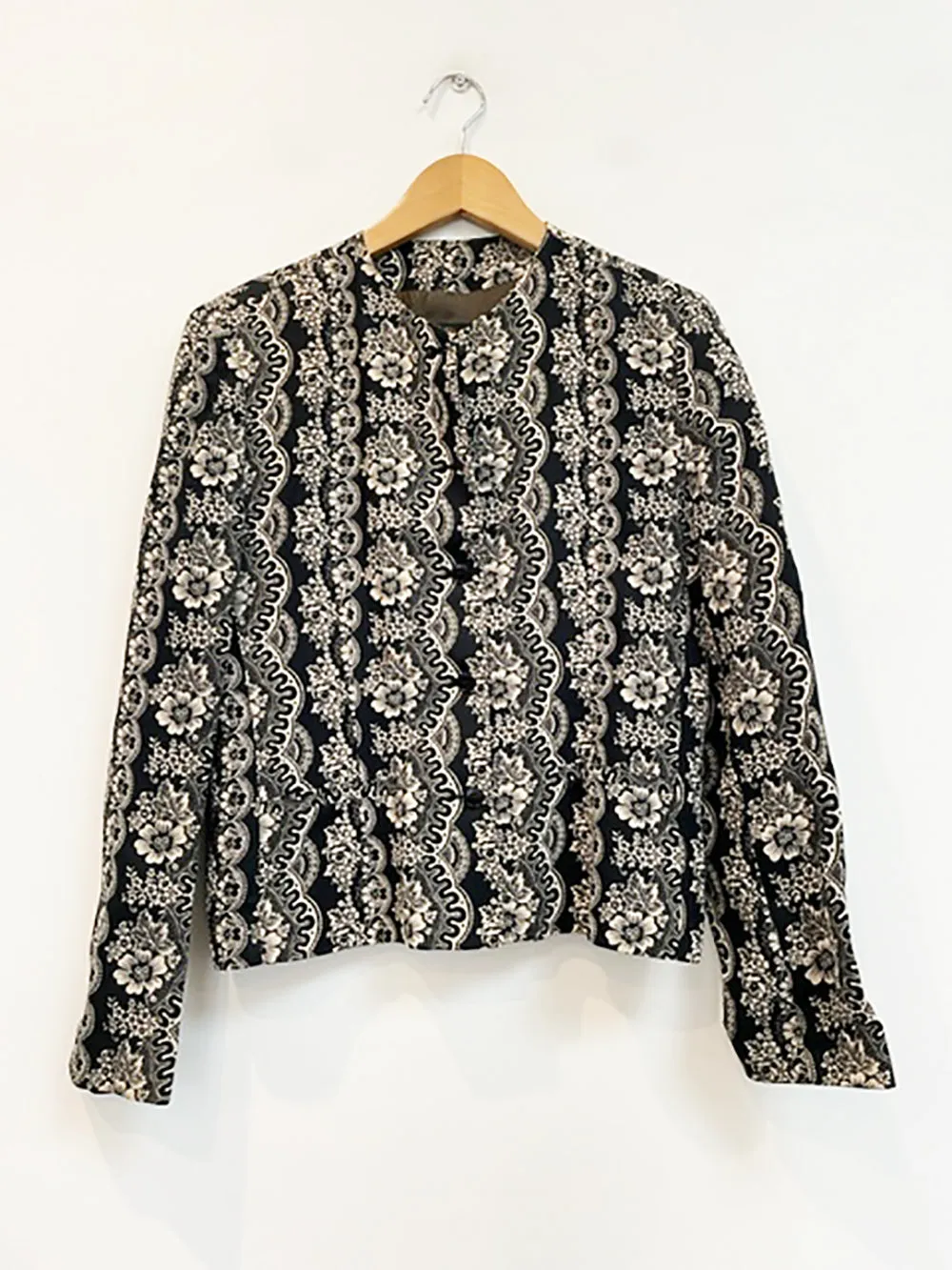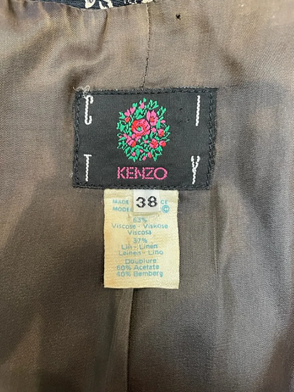 How about this find from France! A chic 80s designer Kenzo floral jacket. has a cool almost Ganni look to the print the flowers are almost smiling! Navy and almost white print with button front and fully lined. A lovely linen blend fabric. This is an amazing vintage piece in perfect vintage condition, no flaws! There is a tiny hole in the lining inside near the tag where a shop label was attached.