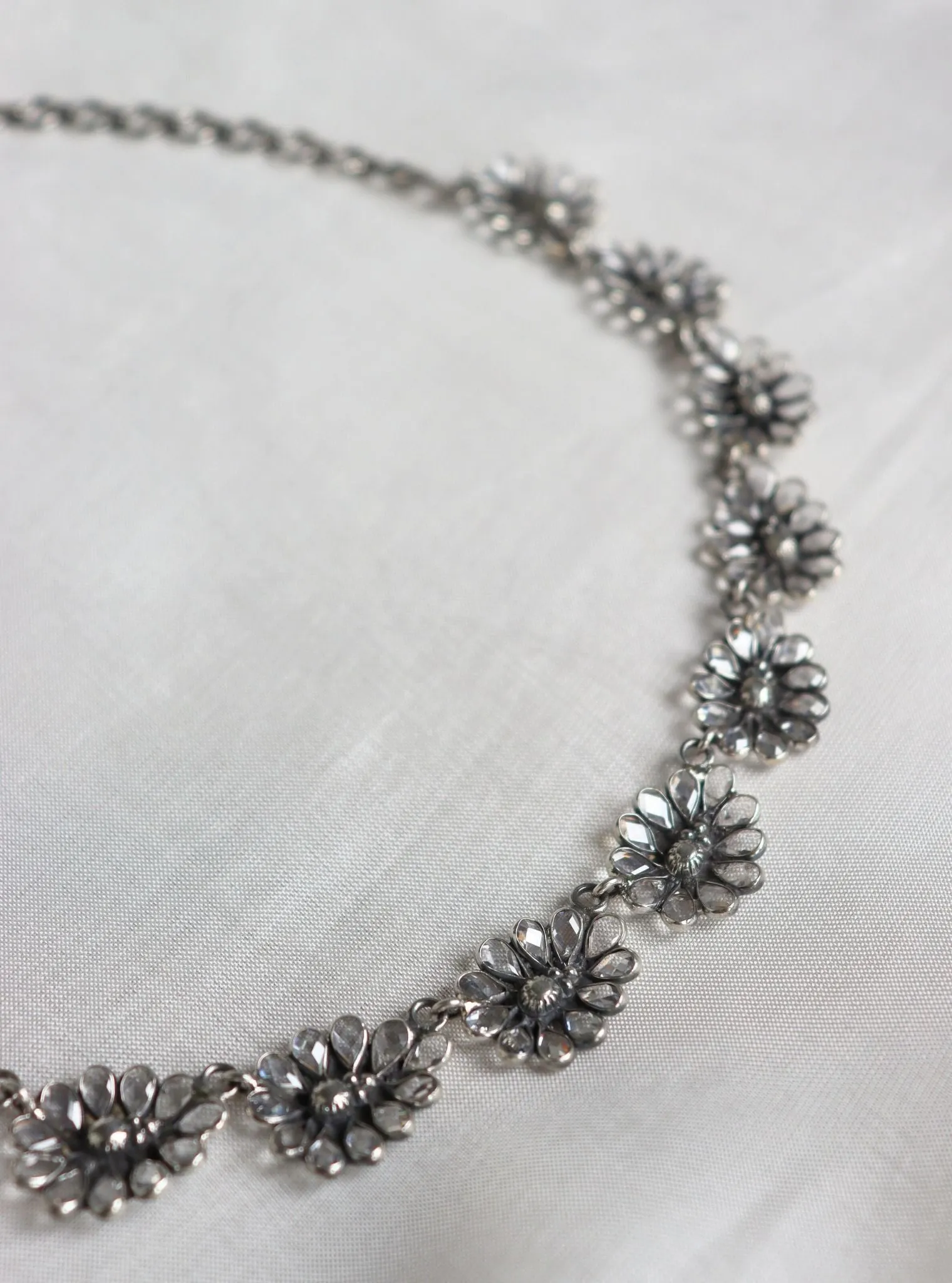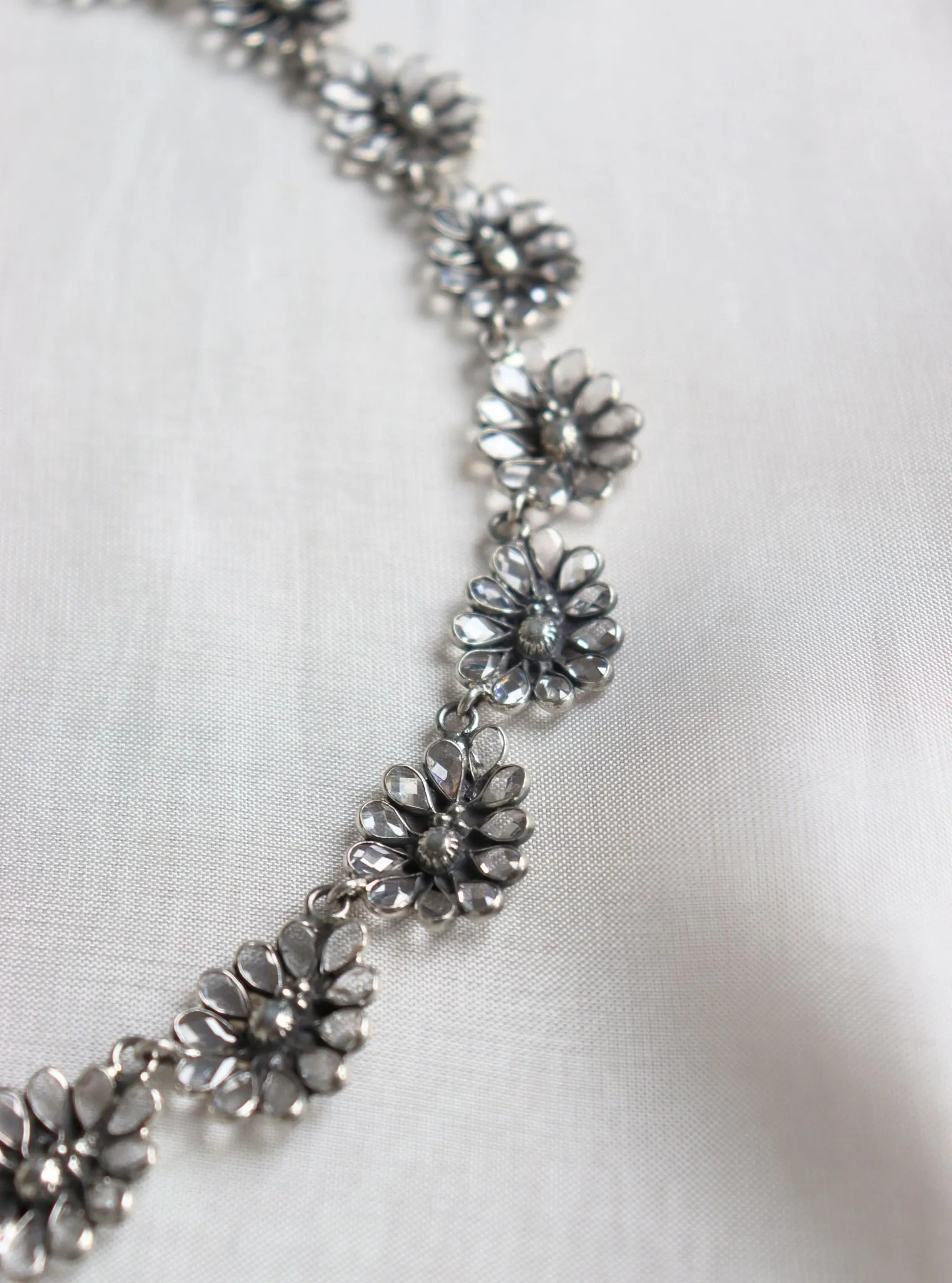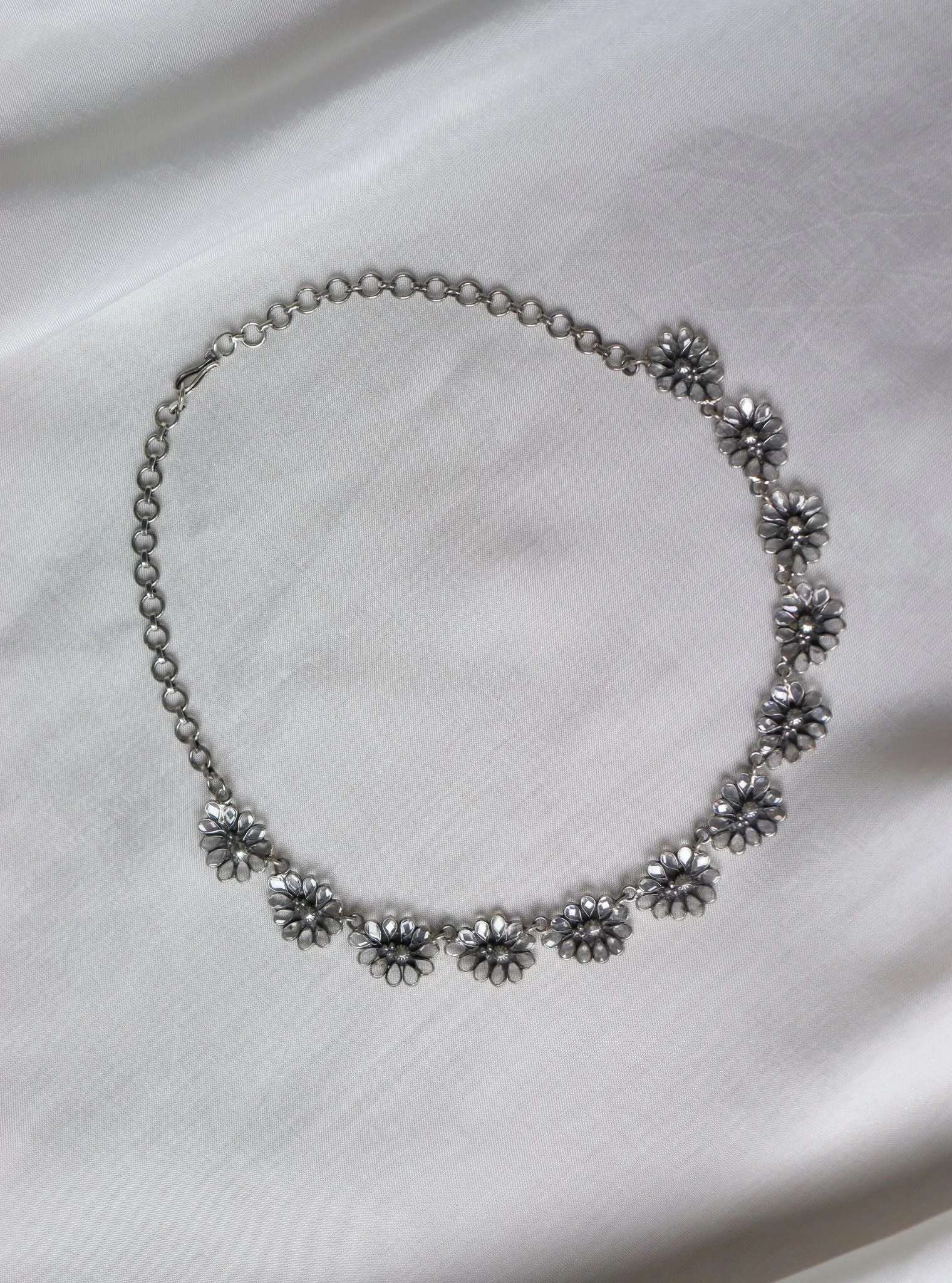 This exquisite pure silver necklace showcases a beautifully intricate design featuring a series of ornate silver flowers, encrusted with tiny translucent stones. The flowers are meticulously arranged to highlight the craftsmanship of the piece. The necklace is secured with an elegant clasp that seamlessly integrates into the design. Perfect for special occasions, this necklace adds a touch of timeless elegance and sophistication to any outfit.