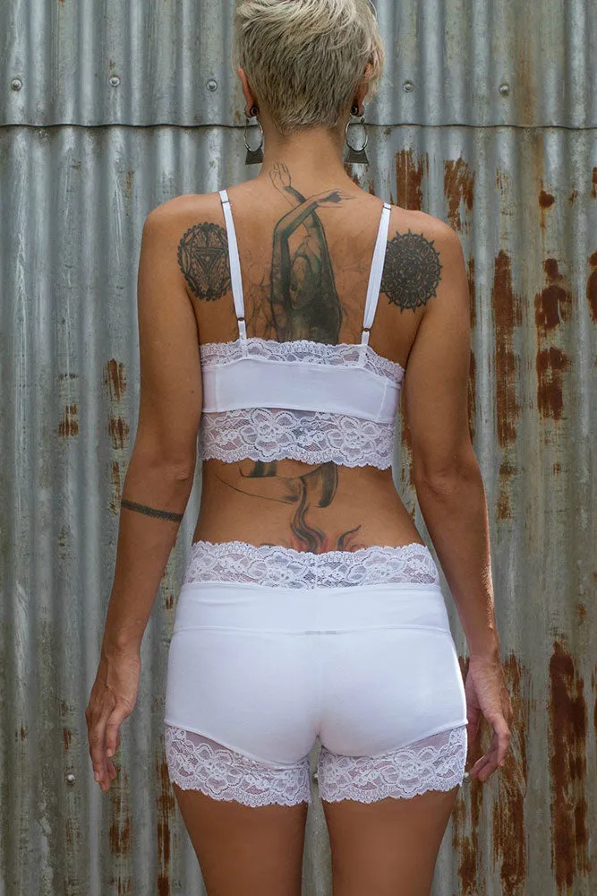 Made From a medium weight cotton lycra with soft touch stretch lace and adjustable straps.