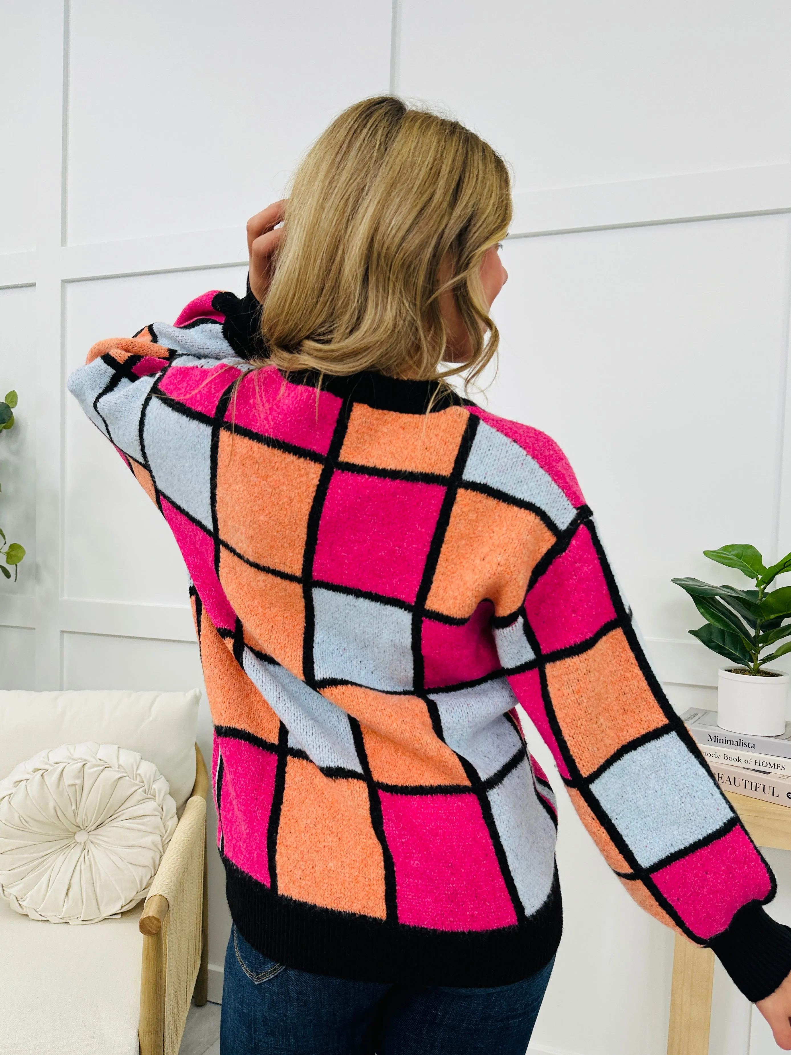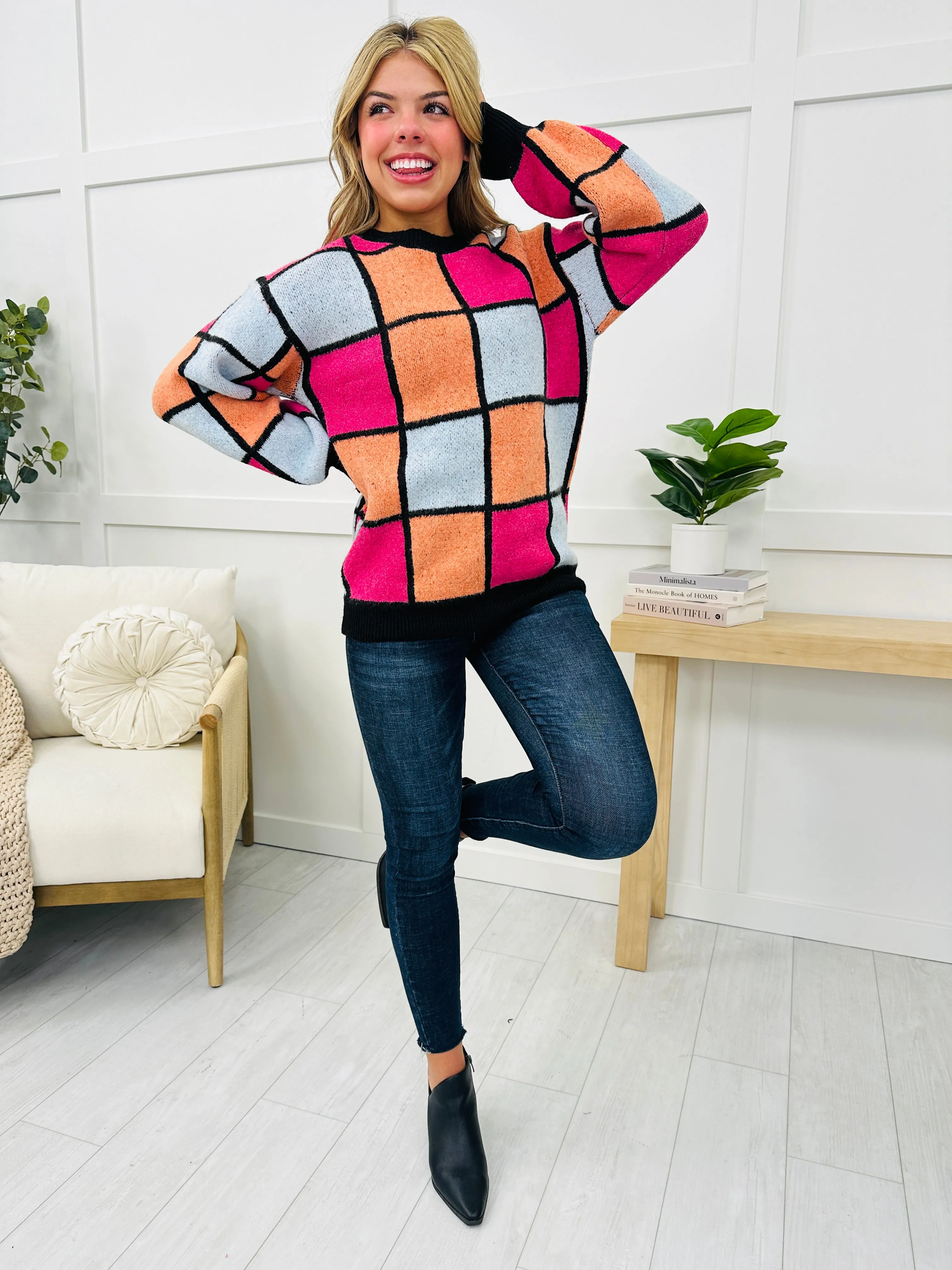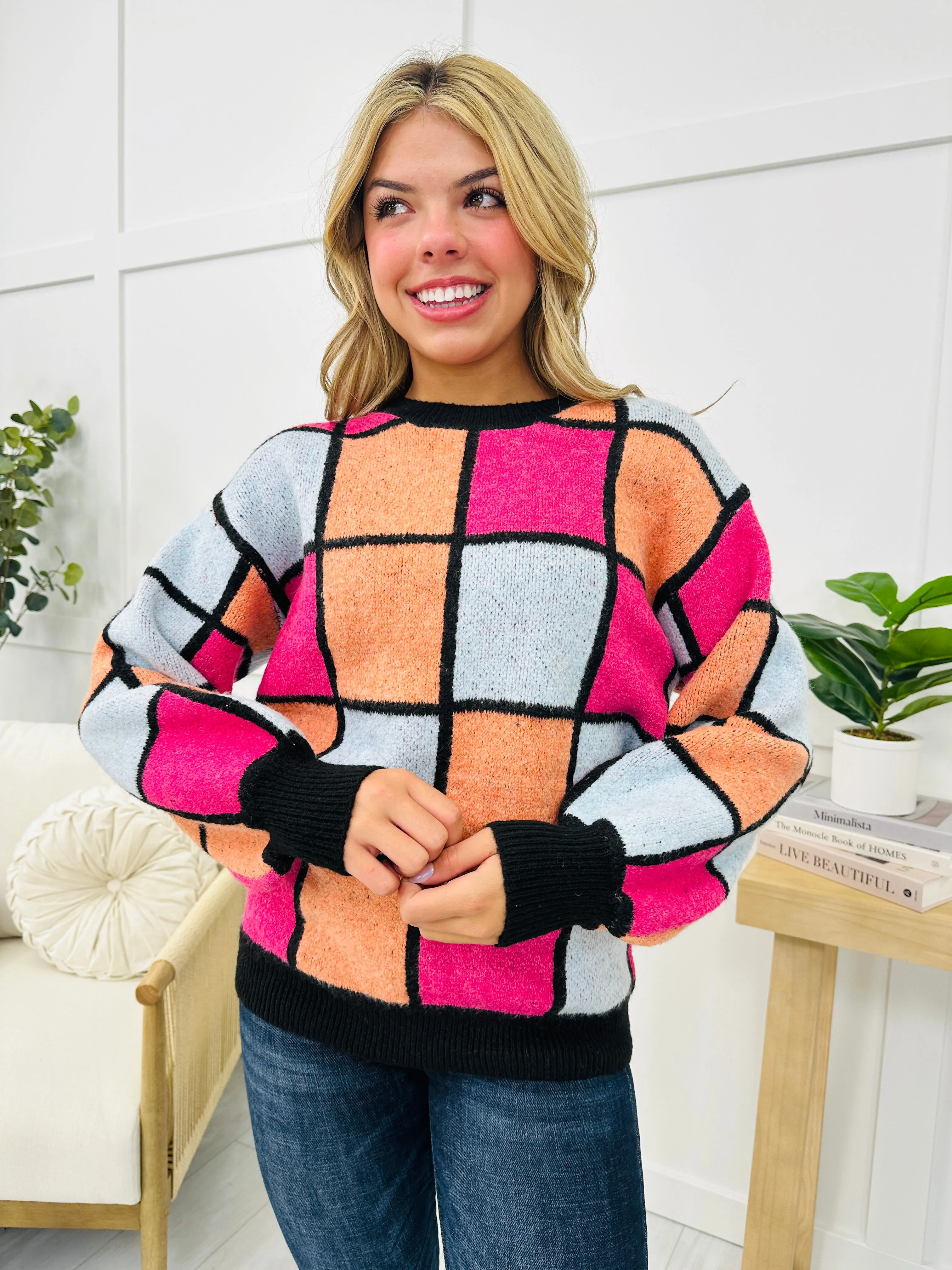 This soft and colorful sweater is perfect for any occasion! The orange, pink, and denim colorblock with bold black trim adds a pop of pastel to your wardrobe that you'll love. Plus, its relaxed fit and comfortable fabric will leave you feeling cozy and cute all day long.