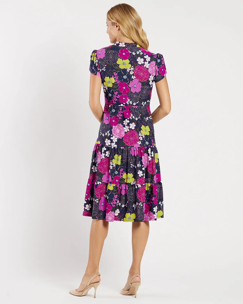 Our Libby dress is one of our best sellers for a reason! It is a midi-length dress with a flattering tiered silhouette, short sleeves with a subtle puff, and feminine flounce details. Complete with a classic V-neckline, this dress is so versatile, offering both elegance and ease for every occasion.