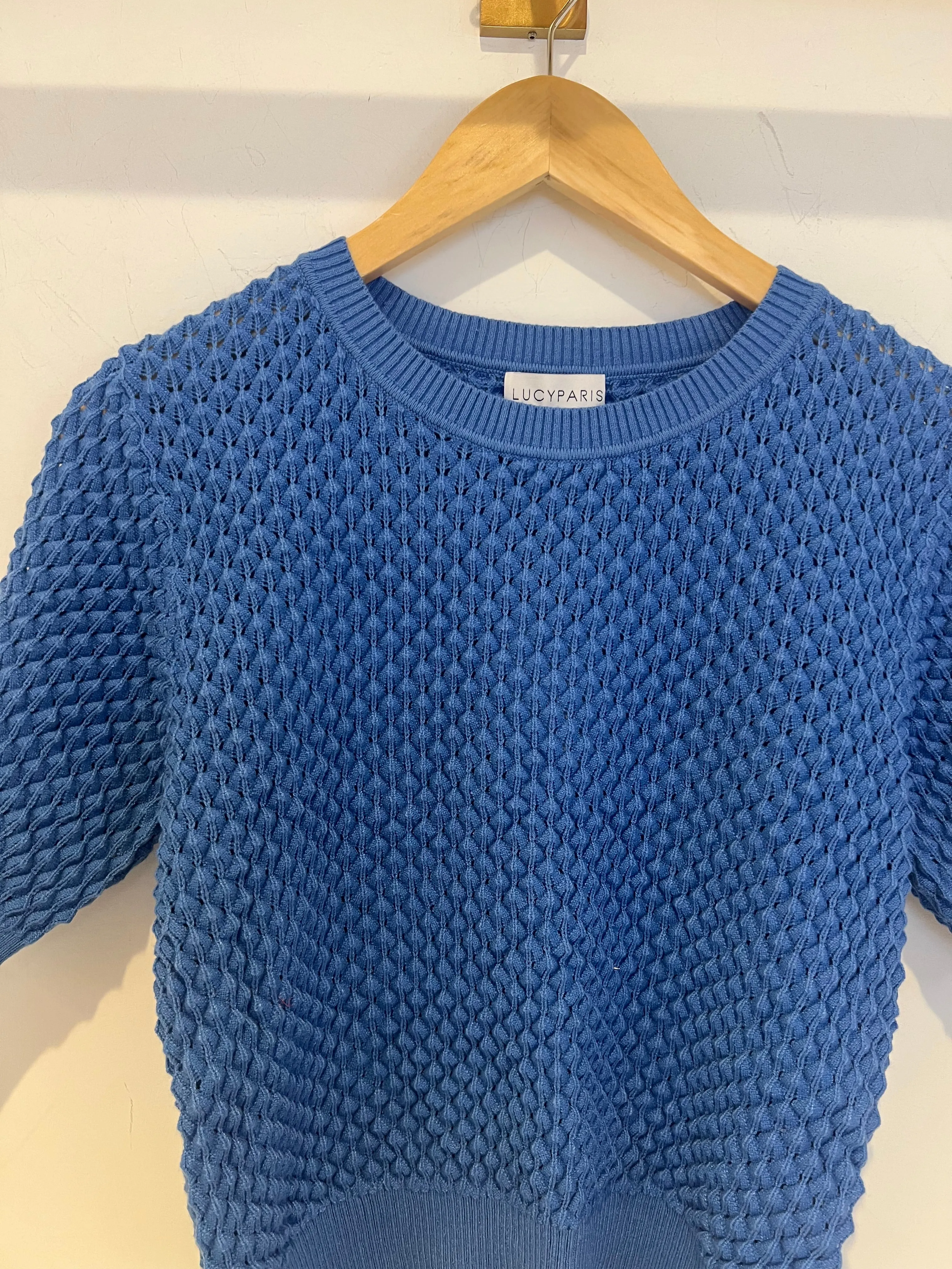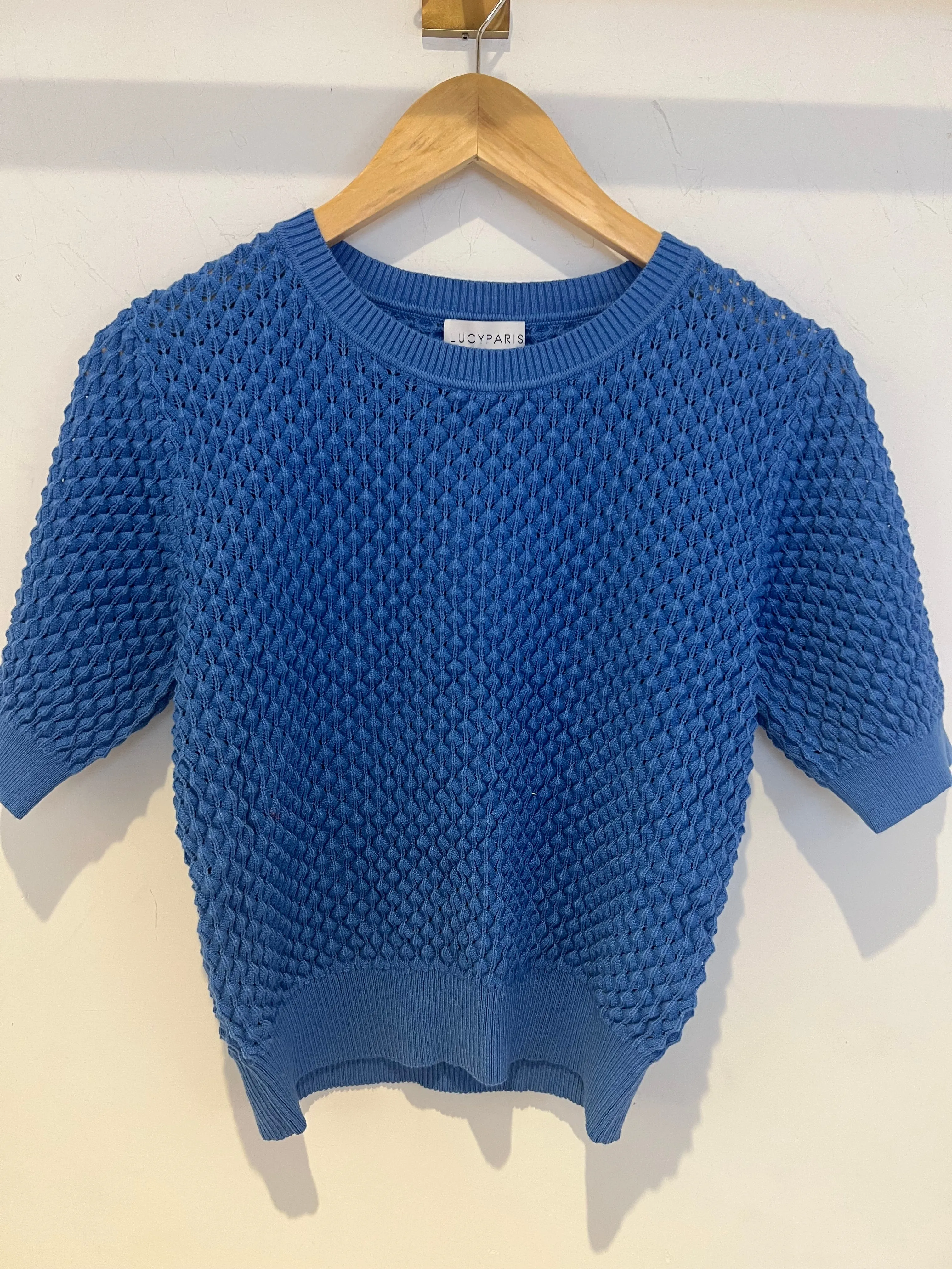 Indulge in the elegance and exclusivity of the LUCY PARIS ELISE KNIT TOP. This short sleeve light sweater boasts a playful blue hue, making it the perfect transitional piece for spring and summer. Stay chic and comfortable with this luxurious addition to your wardrobe.