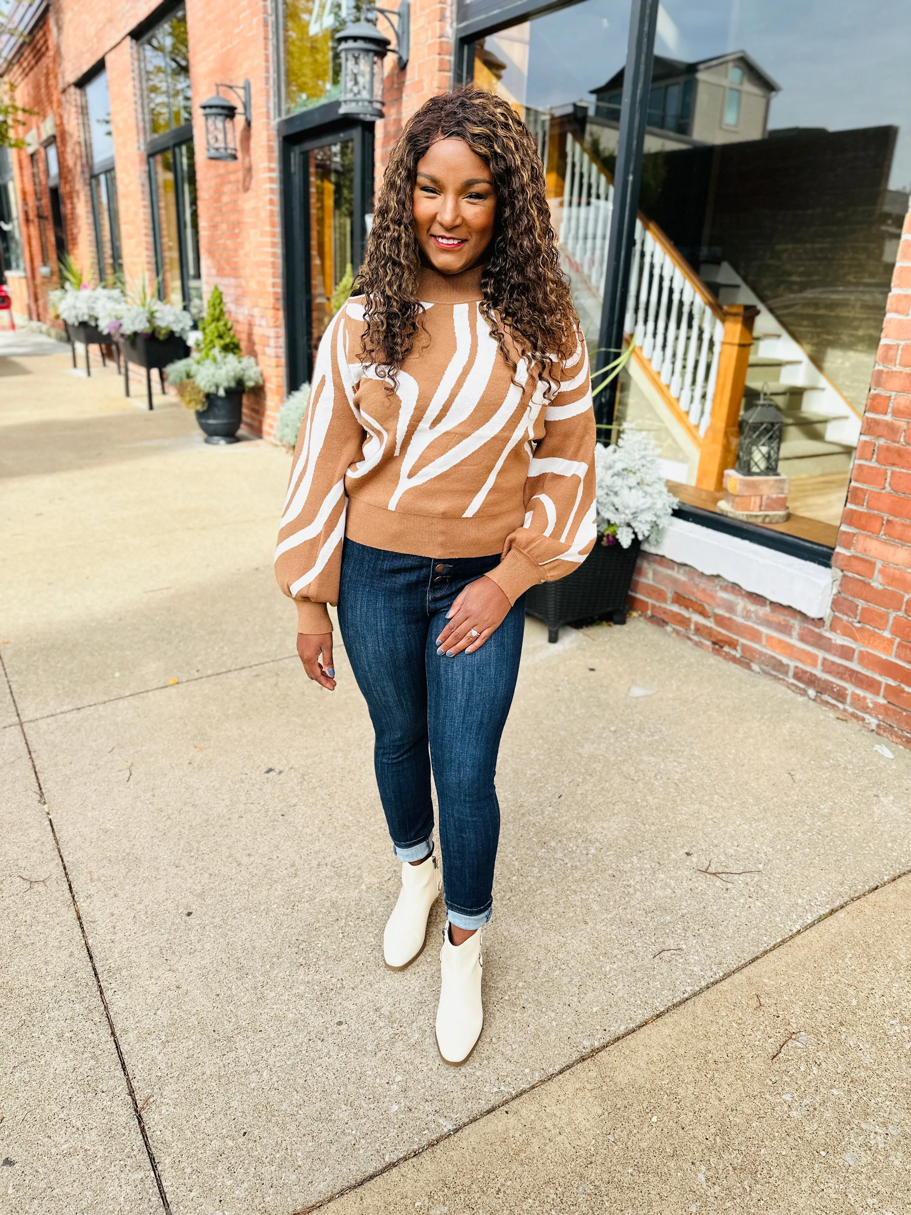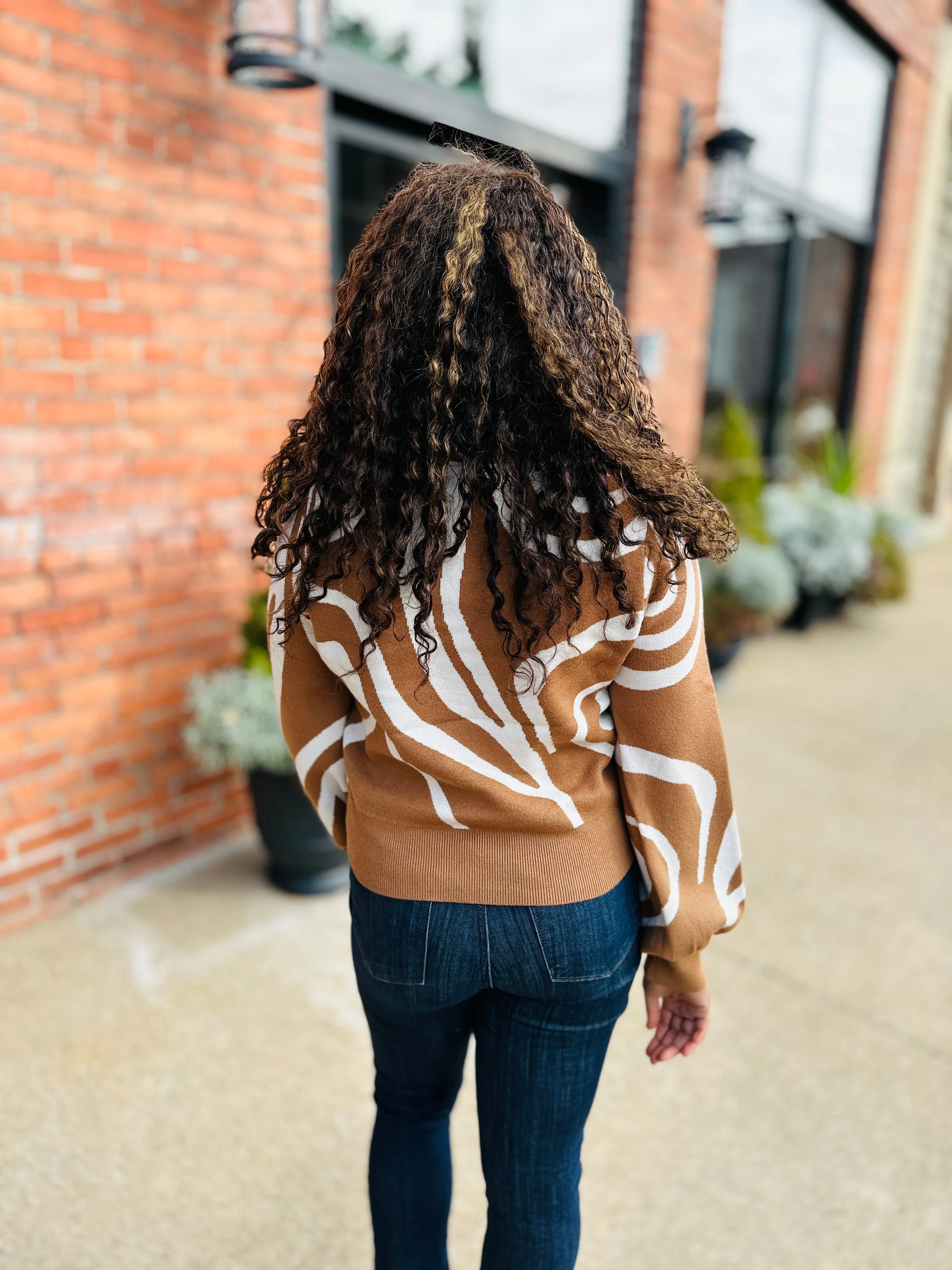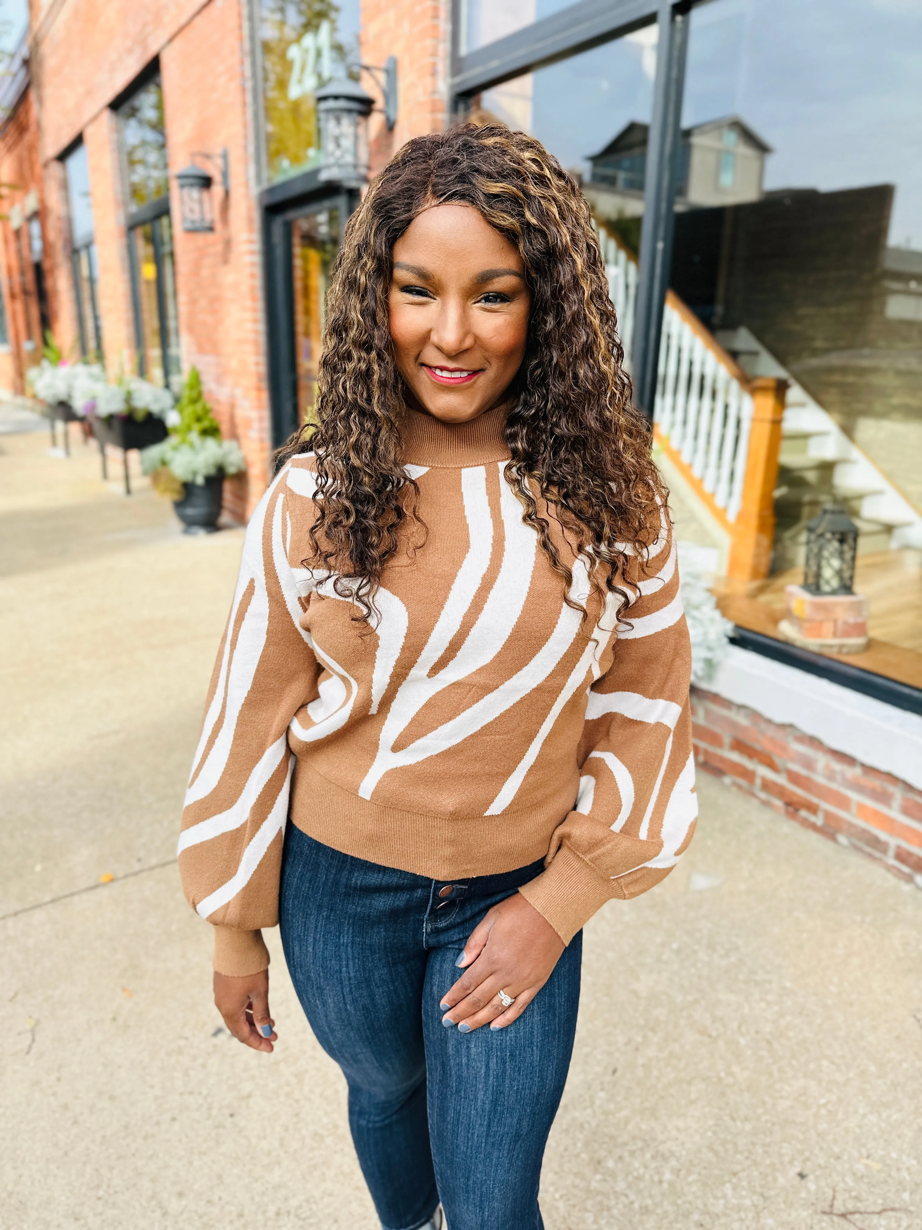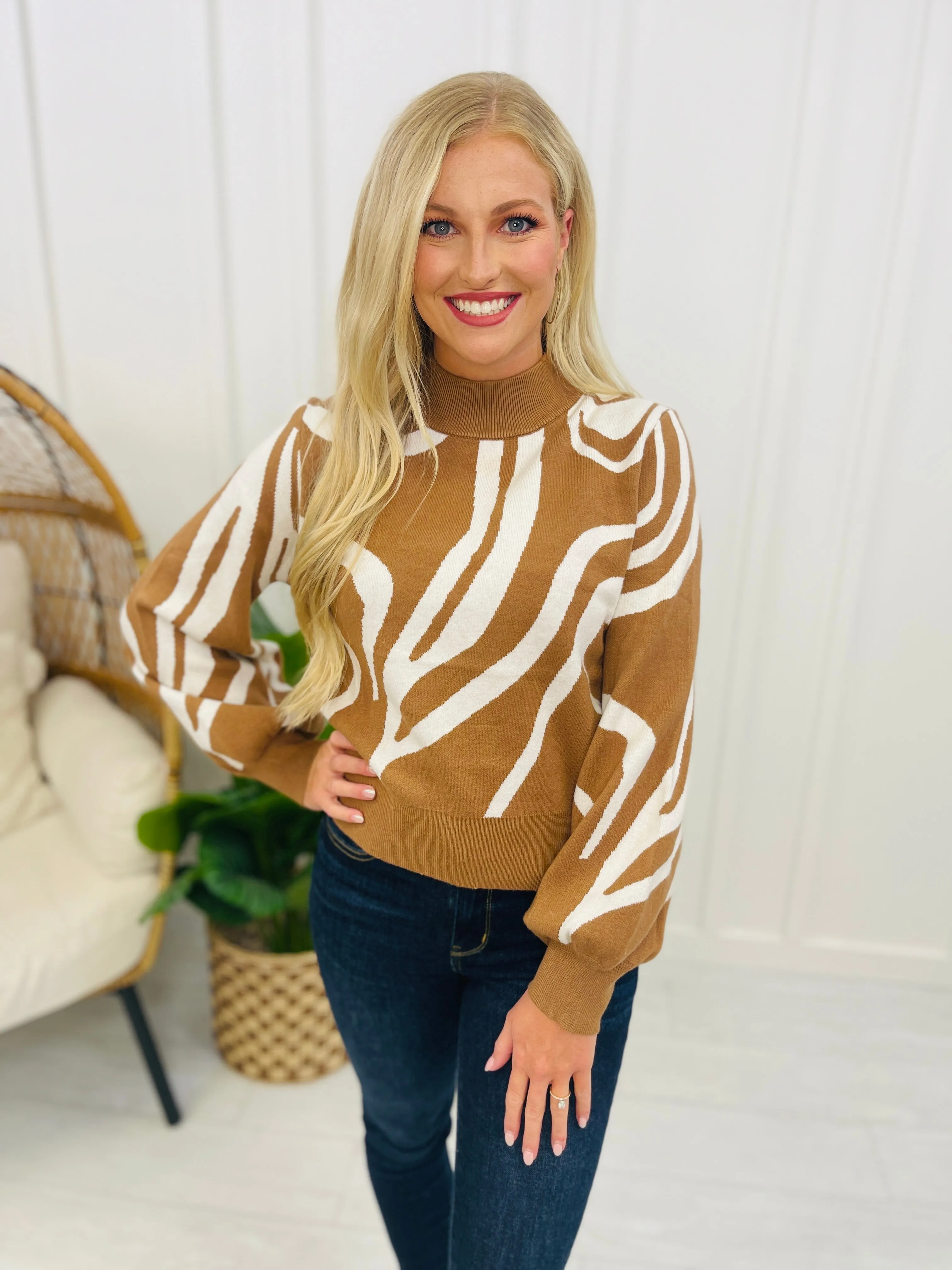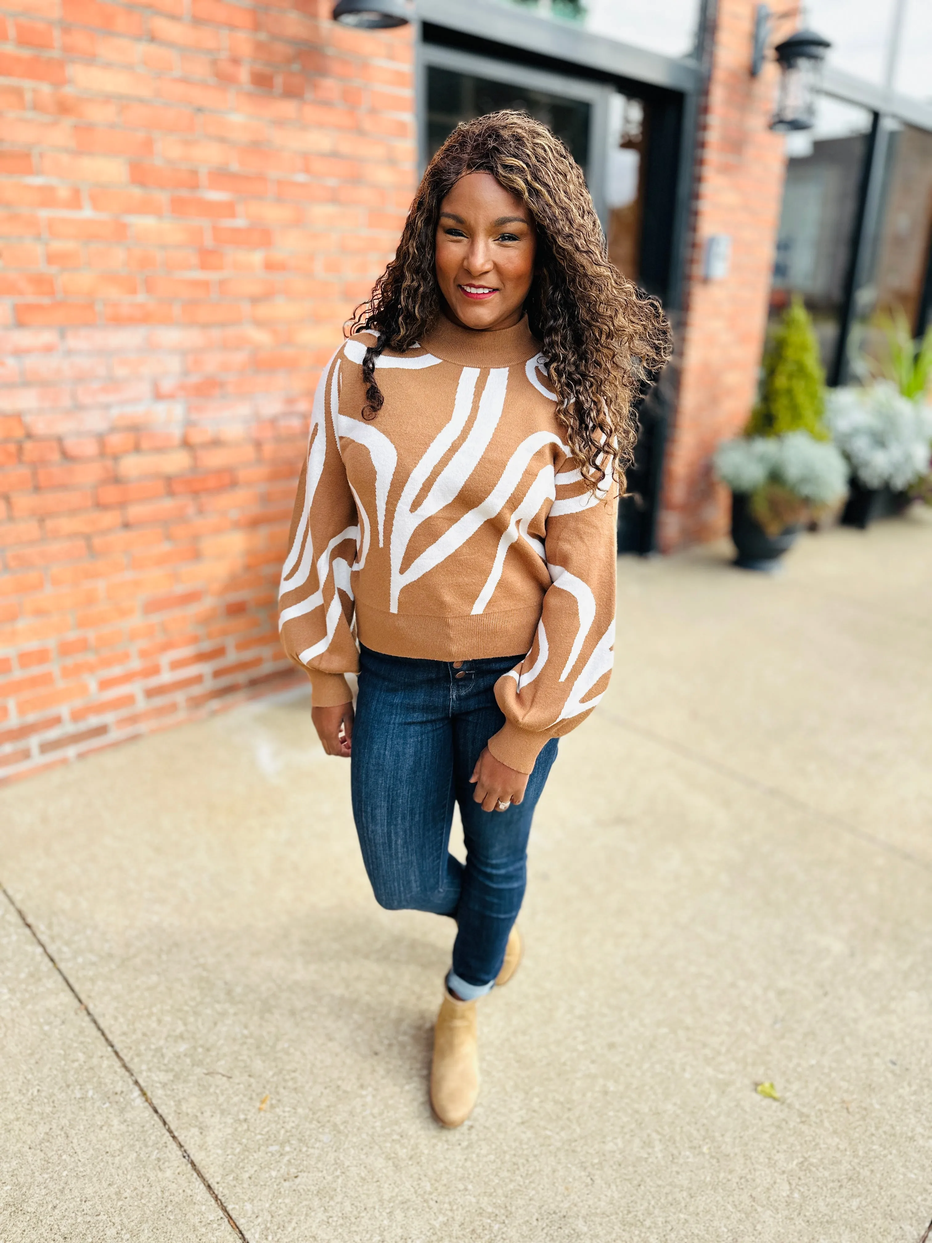 Fashion meets comfort with this stunning new sweater. We love how its beautiful camel hue and light, neutral swirls make it perfect for any occasion. With its mock neck, lantern sleeves, and stretchy fabric, you can be sure to move with ease and style.