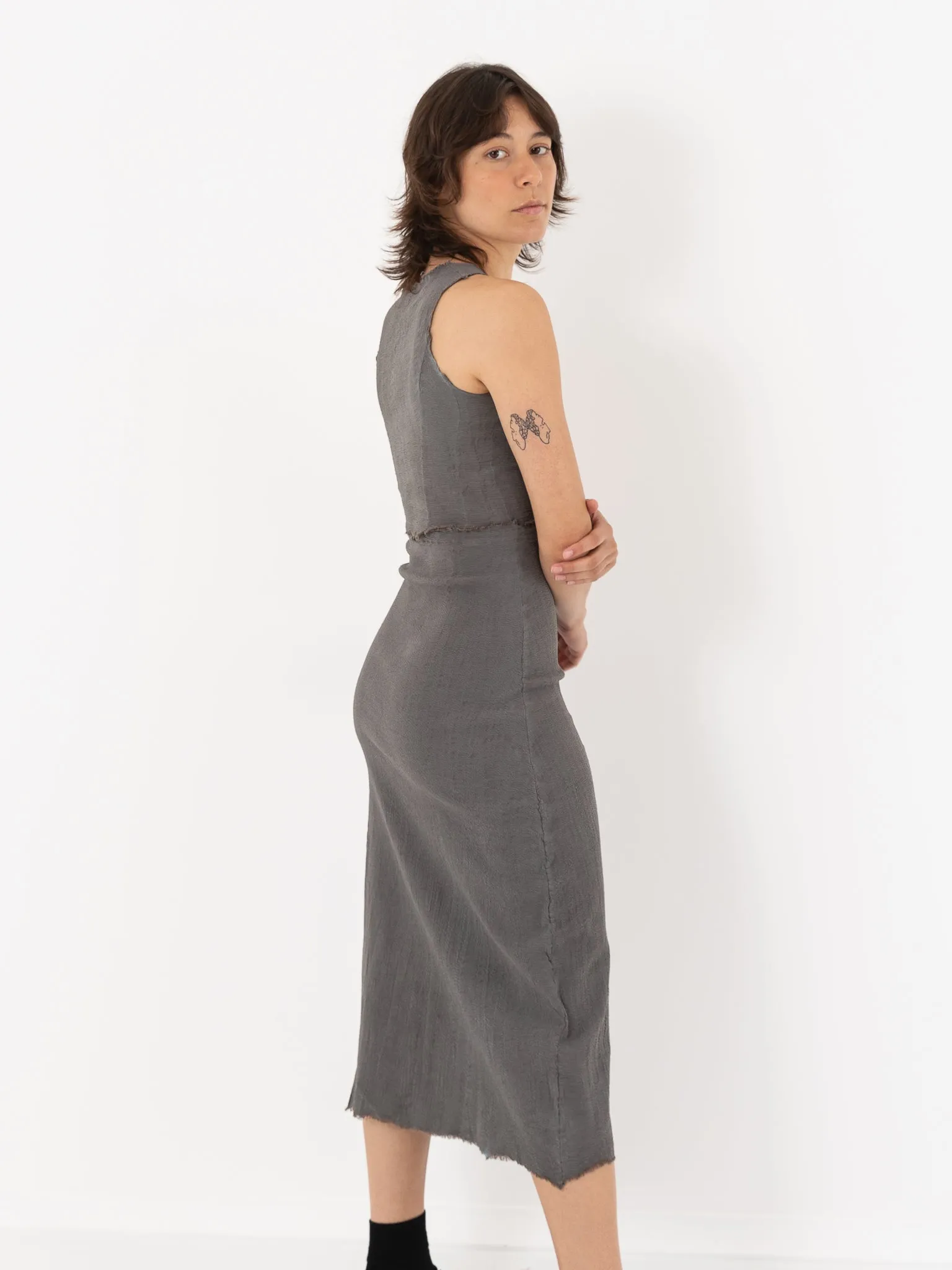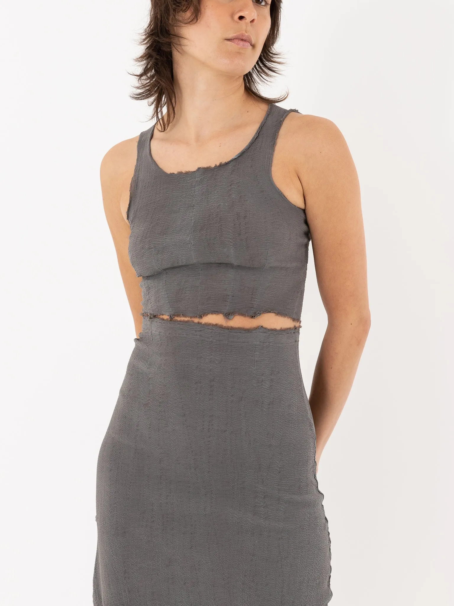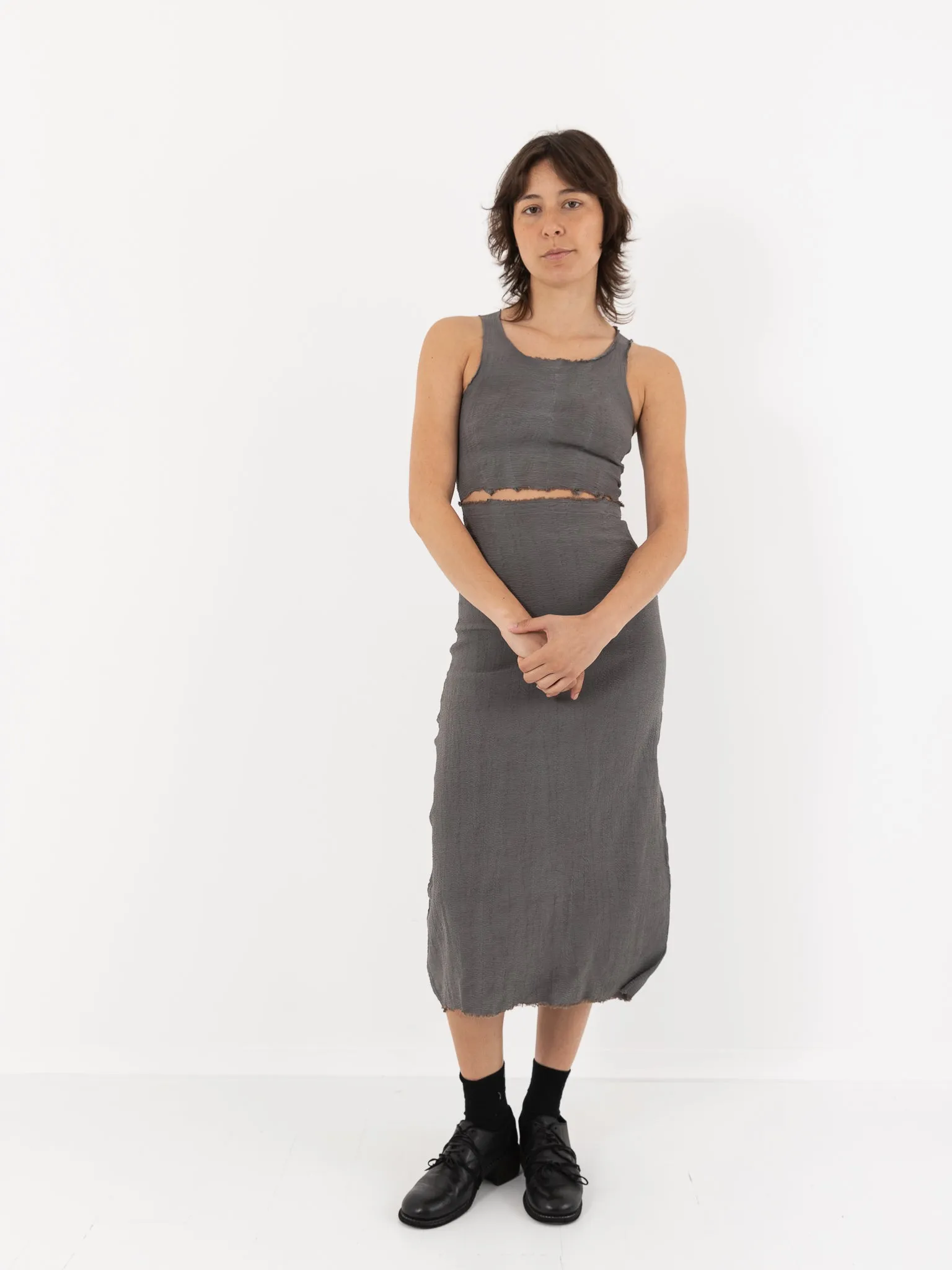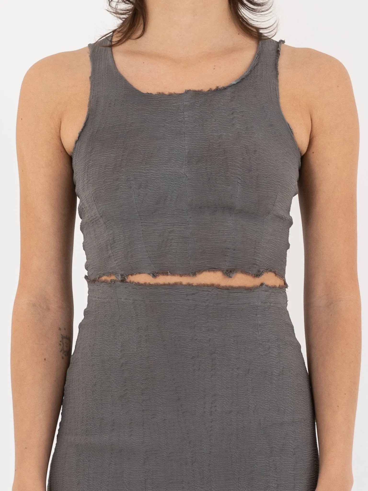 Marc LeBihan Stretch Silk Crop Top in Rose Grey. A staple Marc LeBihan piece, this textured silk uber-stretch fabric is both flattering and comfortable. Hand-dyed with raw edges. Made in France.
