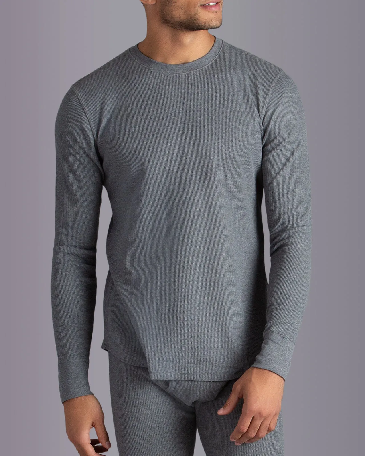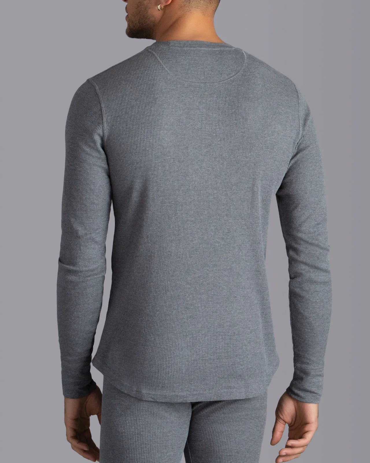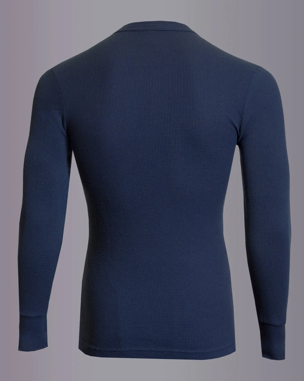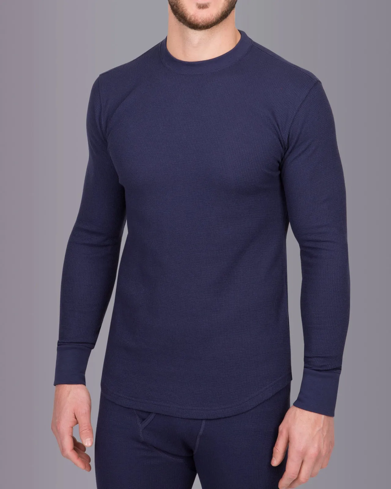 The perfect go-to when snow starts to fall and the weather starts to cool down. Designed to keep you warm by trapping and retaining your own body heat. This navy long sleeve waffle knit has an elastic neck tape with contrast color, rounded hem and cuffed writs. Ideal for both indoor and outdoor activities.