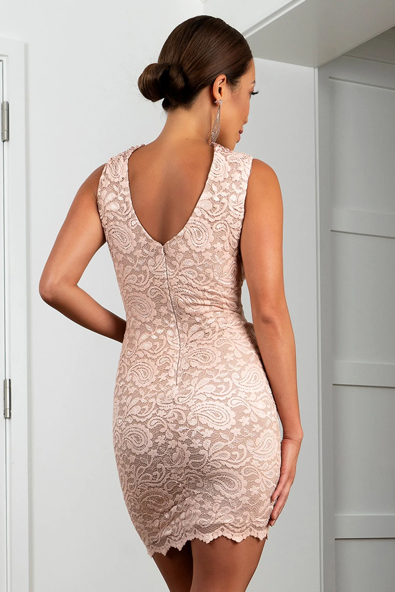 A Romance hue, this is a lace cocktail dress that is hand painted with metallic silicone and crystallized with caviar glass. The Swarovski elements on a Cream canvas descend delicately as a vine from the shoulders to the bust. An embroidered expression of chaste sensuality.