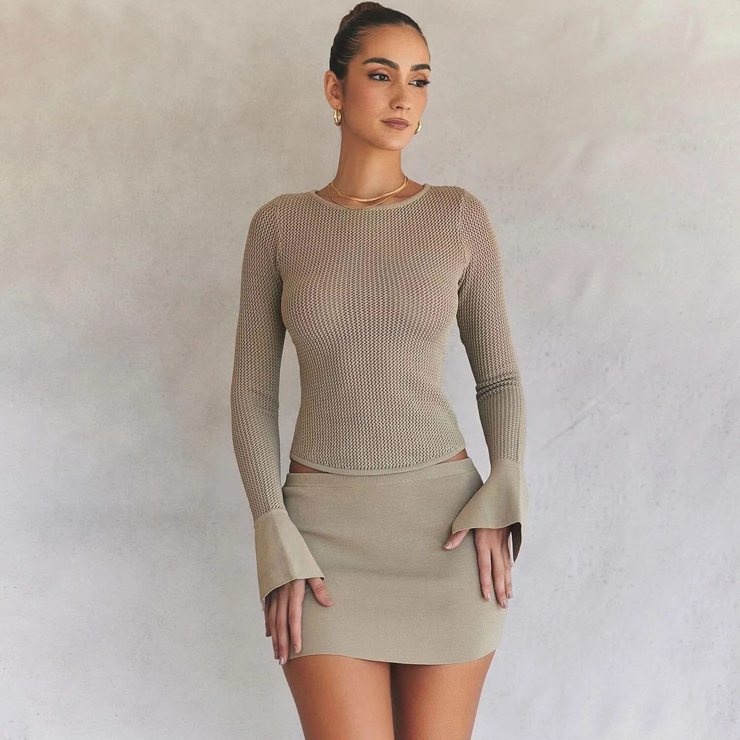 Minimalist femininity is the definition of this knitwear. Made in a fall-appropriate khaki hue, this knit top showcases a simple minimalist style with a modern open stitching technique to give you a unique textured handle that could be found in our knit collection. Cut in a slim sculpting silhouette, the acrylic knit offers the right amount of stretch to give you a comfy touch. We love it's round neck, long bell sleeves that split at the cuff, adding a hint of female maturity. Easy to wear and easy to style. Wear yours with the matching knit skirt and a pair of boots for the early autumn look.