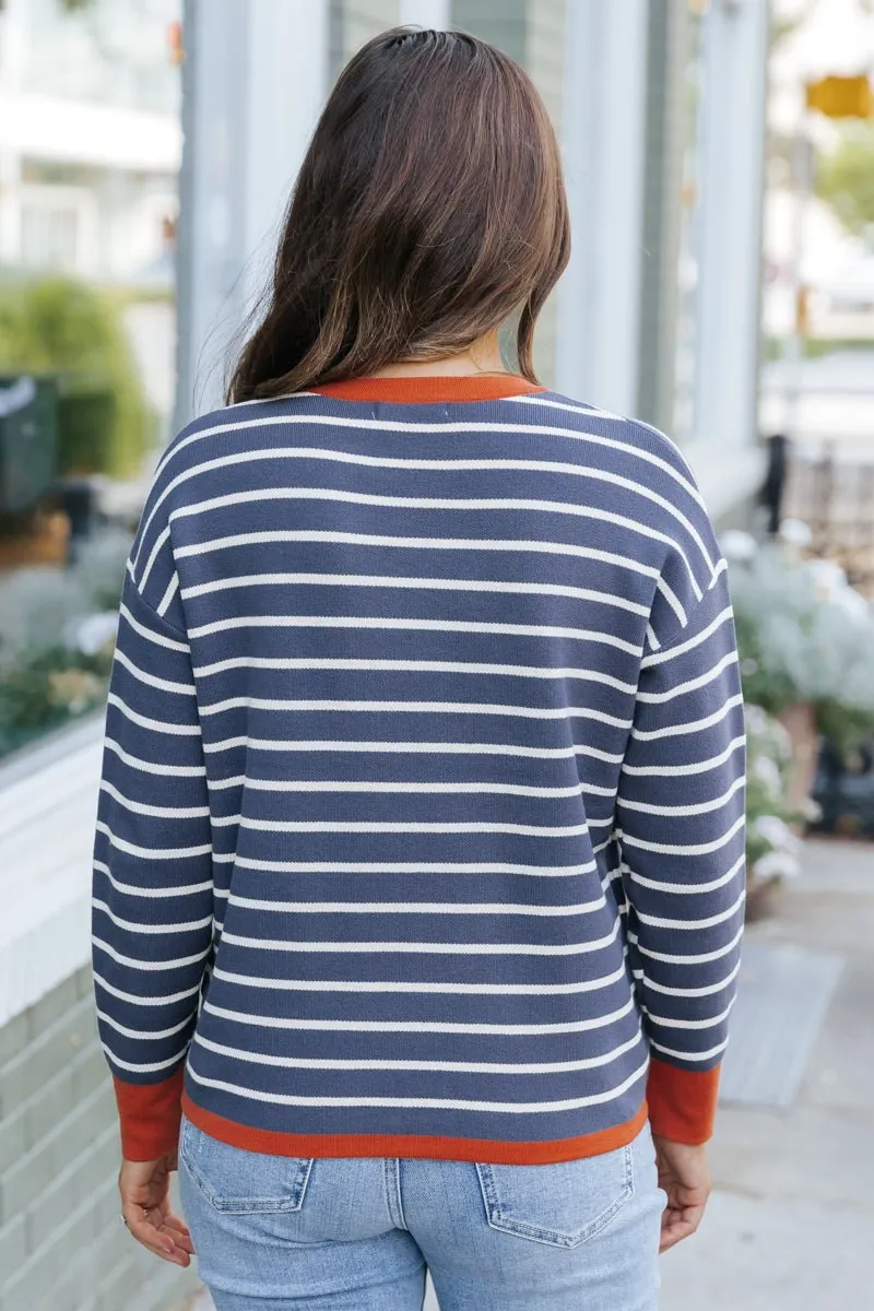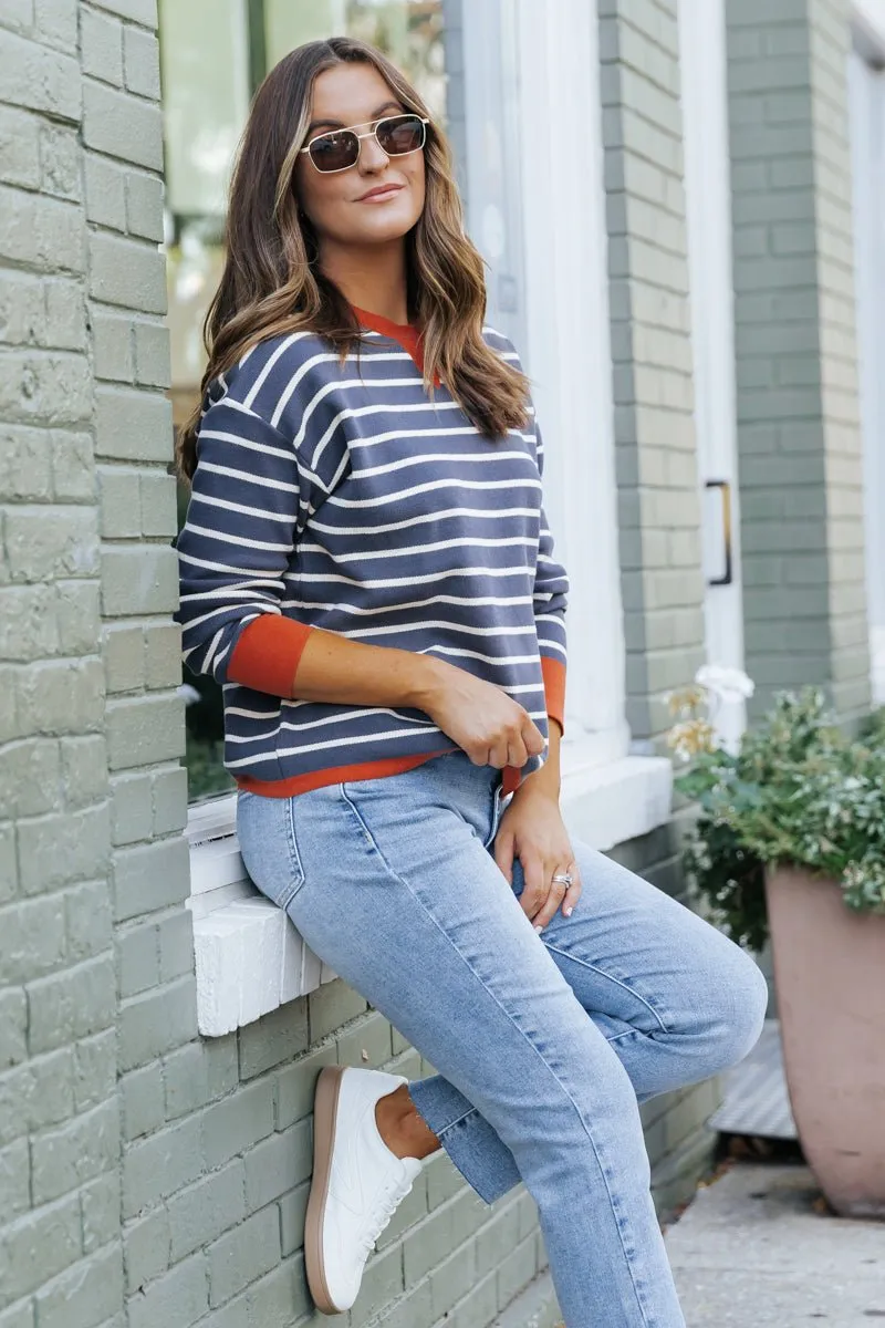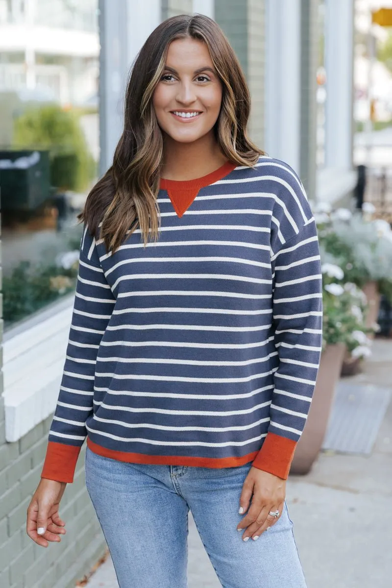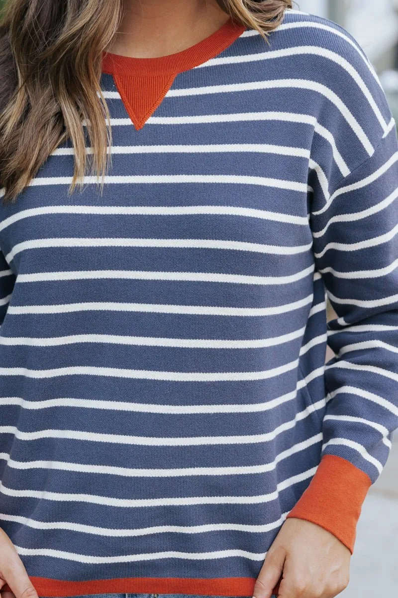 This stylish and versatile piece features a subtle orange contrast detail at the neckline and cuffs, adding a pop of color to your outfit. Made with a comfortable crew neckline, stay cozy and chic all season long. Style with your favorite , , and simple for a chic everyday outfit.