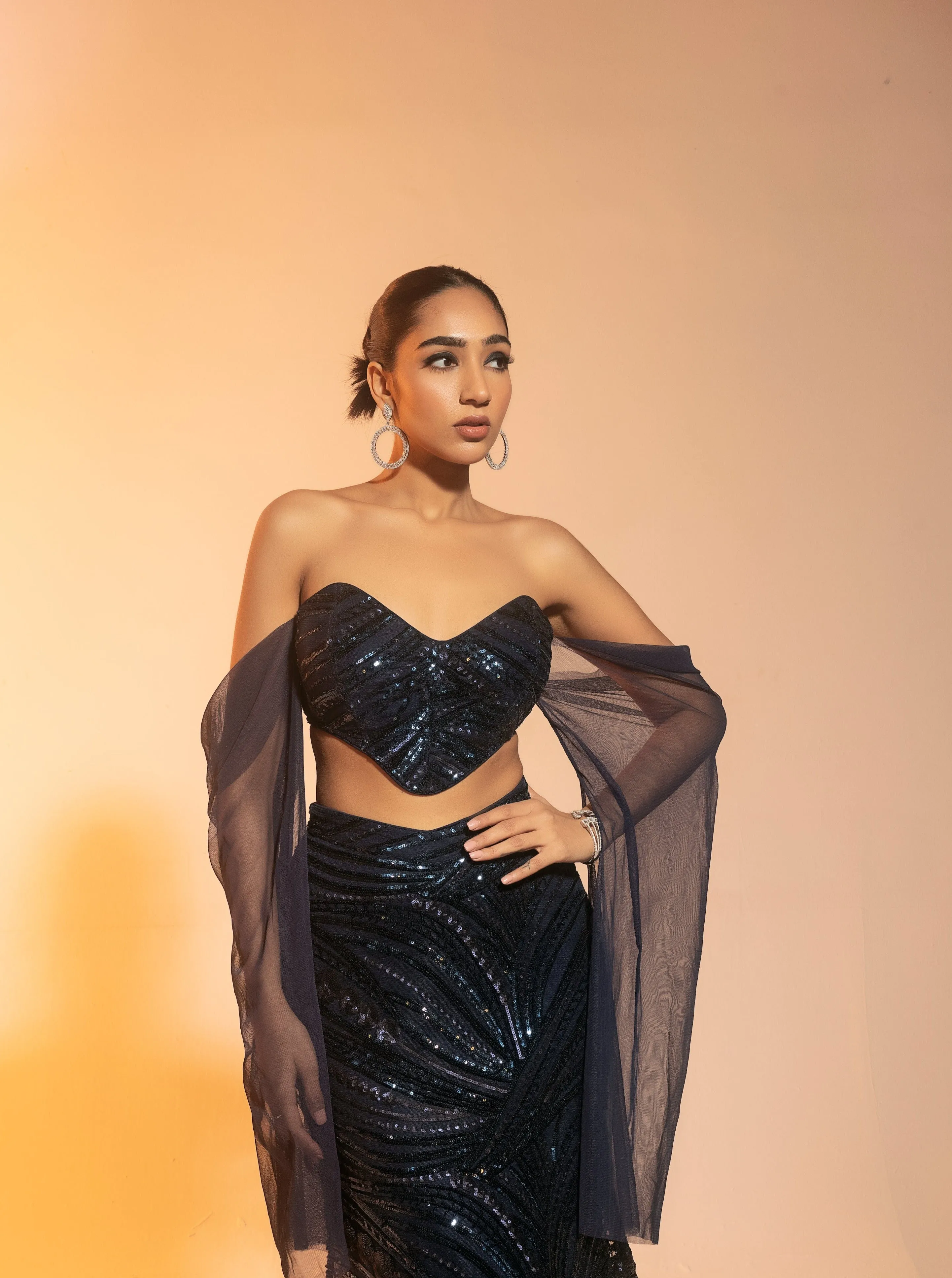 The cocktail outfit of your dreams is here with our Netra Sapphire Embroidered Mermaid Lehenga Set. Made with a dazzling, sapphire embroidered fabric, our Netra comes with a blouse featuring our signature boned corsetry, with an exaggerated sweetheart neckline, a flattering asymmetrical hemline, and romantic, off-shoulder cowl mesh long sleeves. A matching, high-waisted lehenga skirt in a gorgeous mermaid silhouette delivers a spell-bounding look that is meant to make the absolute most of your curves!