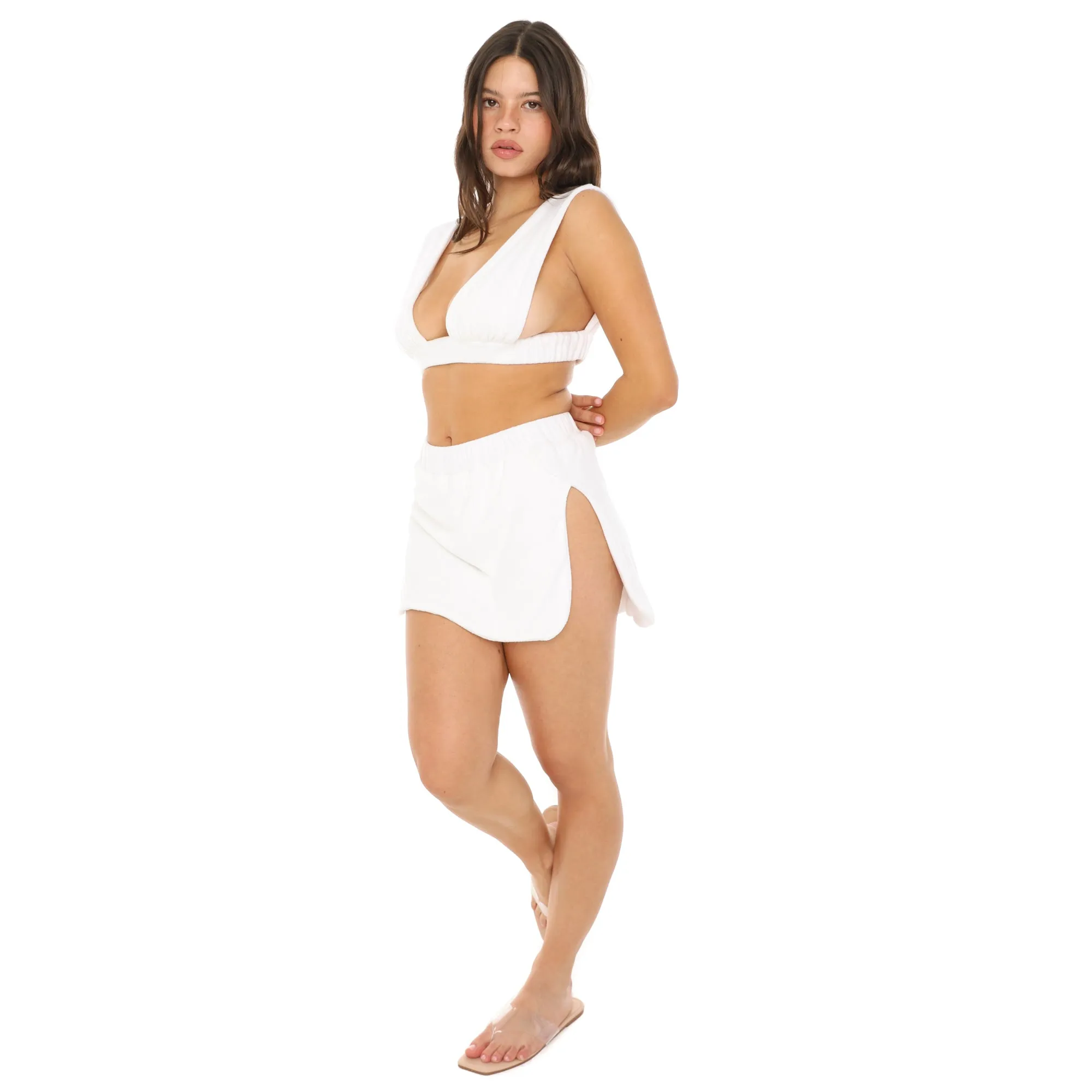 A terry skirt for tennis, fated beyond. Nicia is sworn to endless summer moments with hip-high slits and a built in bikini. Wash with like colors only.