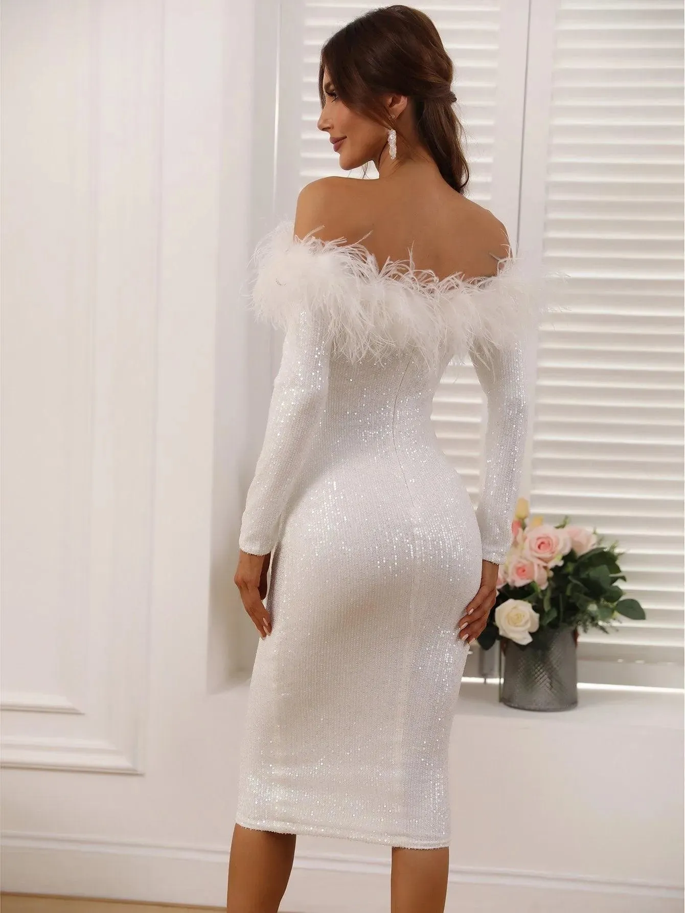 This dress is a winter fantasy brought to life, combining the sparkle of sequins with the softness of feathers. Its off-the-shoulder neckline is adorned with a delicate feather trim, adding a touch of whimsical elegance. The bodycon silhouette, crafted with thousands of tiny sequins, hugs the figure in a shimmering cascade, culminating in a sophisticated midi-length hem. Long sleeves make it a stylish choice for cooler evenings, while the sequin dazzle ensures it's a showstopper at any festive gathering. A dress that's as much a piece of art as it is a statement of fashion.