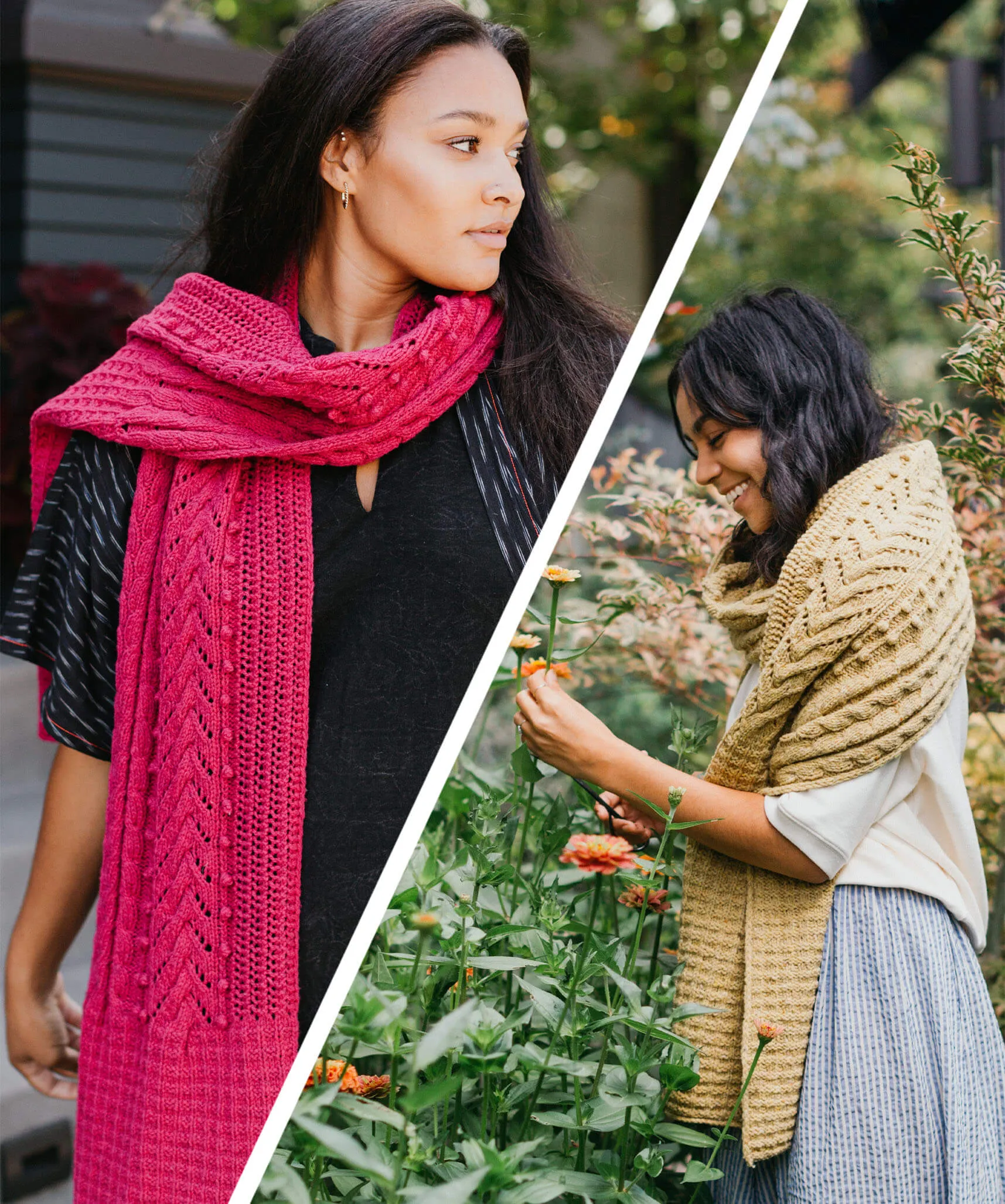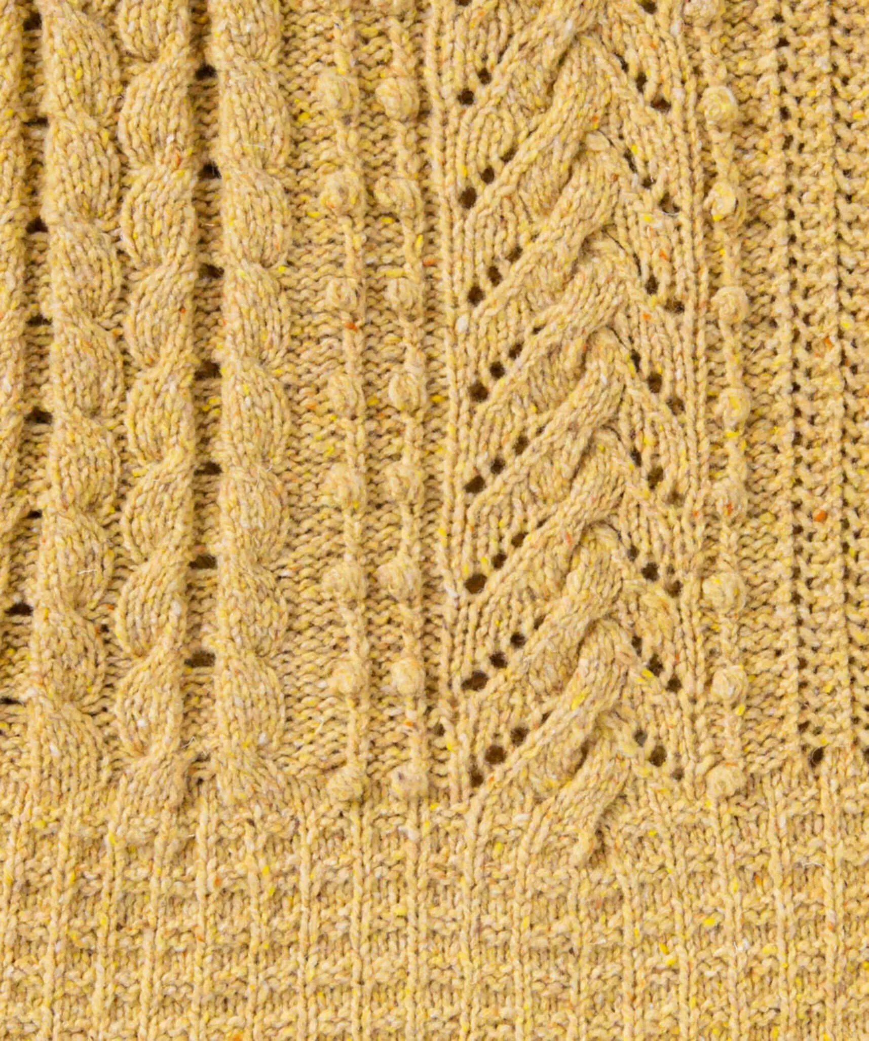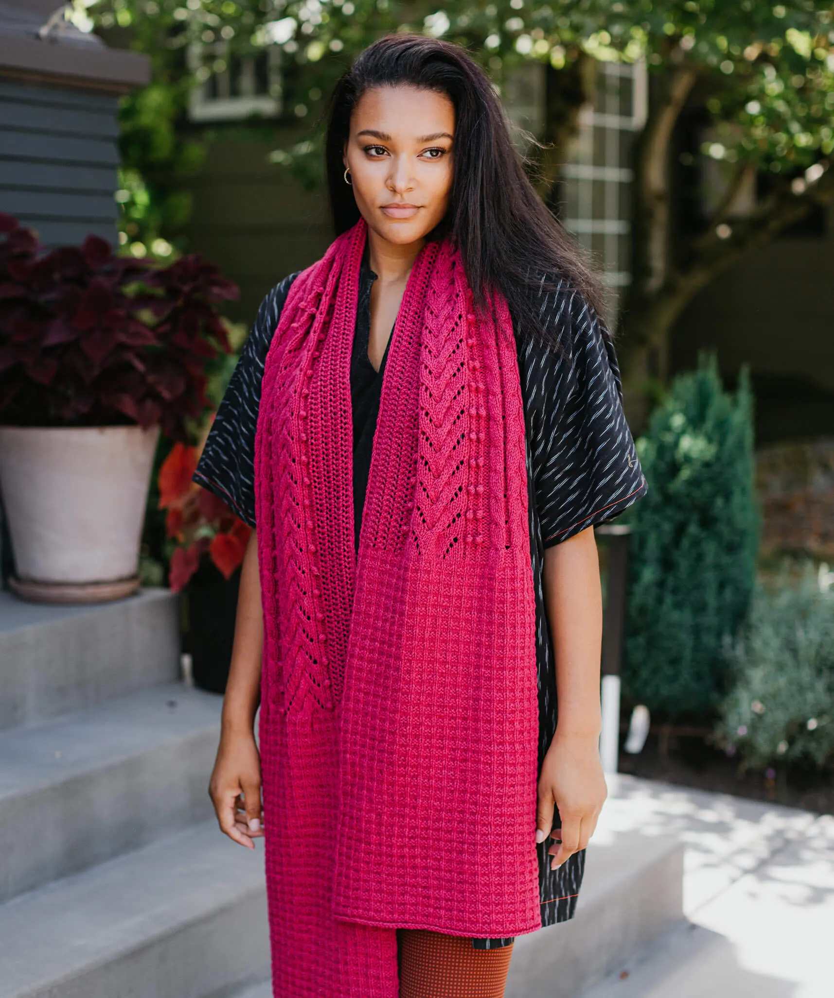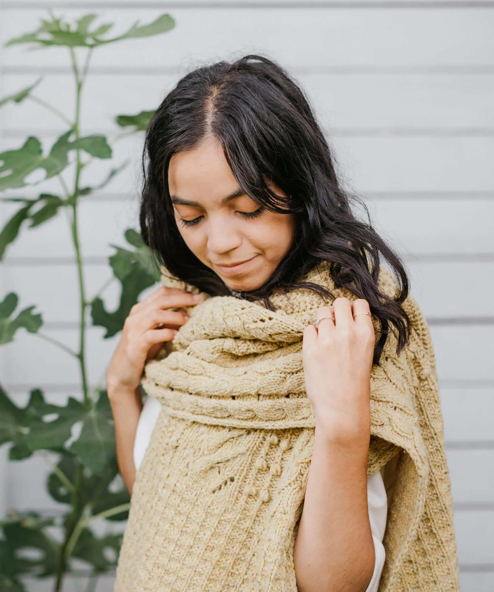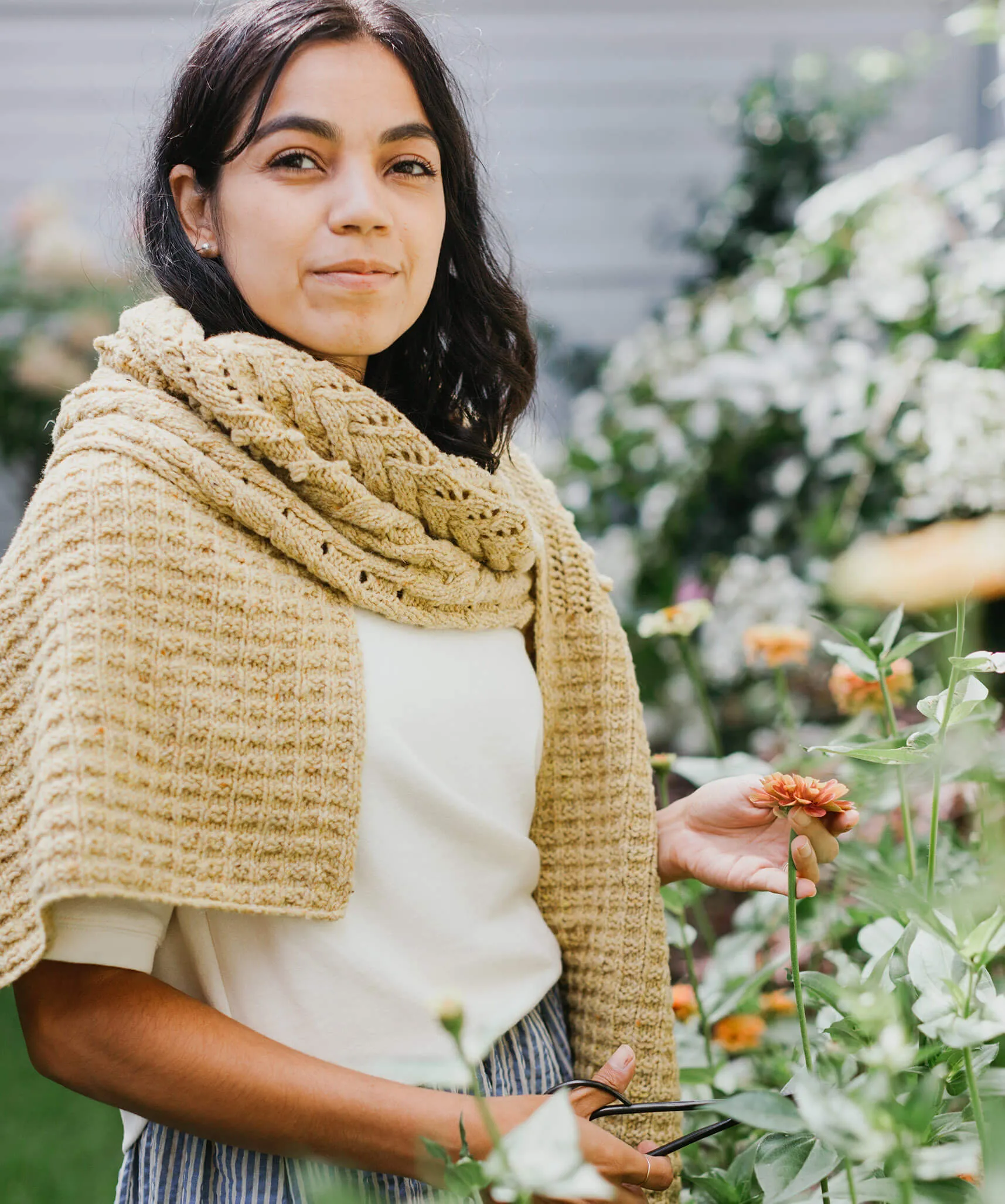 Often it’s the journey that makes us appreciate home even more. Inspired by the intricate details of flora and fauna discovered on woodland walks, Oiva’s cascading cables, bobbles, and lace present a captivating adventure in texture. Woolen-spun Shelter or Tones work up into a delightfully plush yet lightweight fabric, plentifully proportioned to offer protection from chilly winds while you’re out and about.
