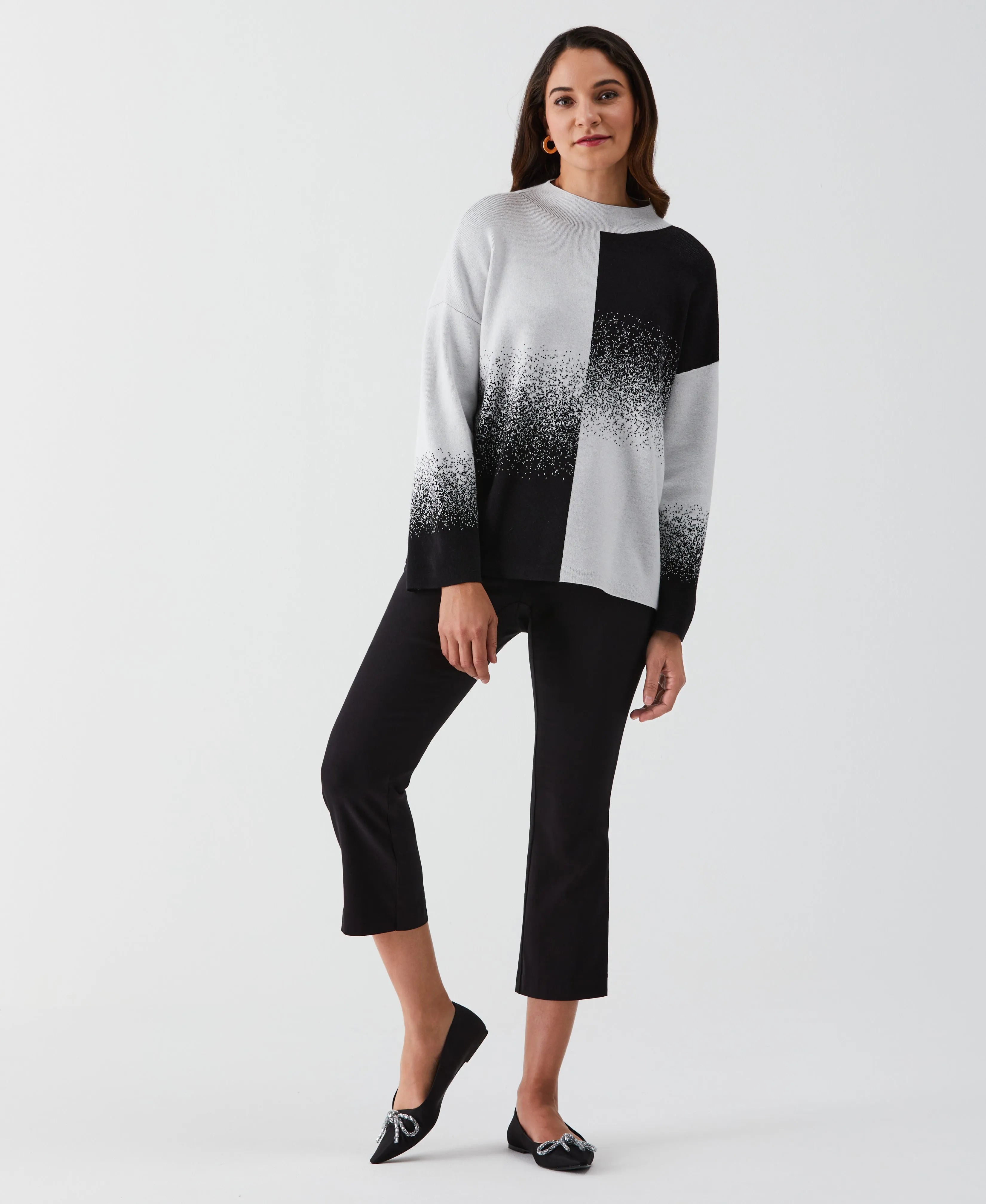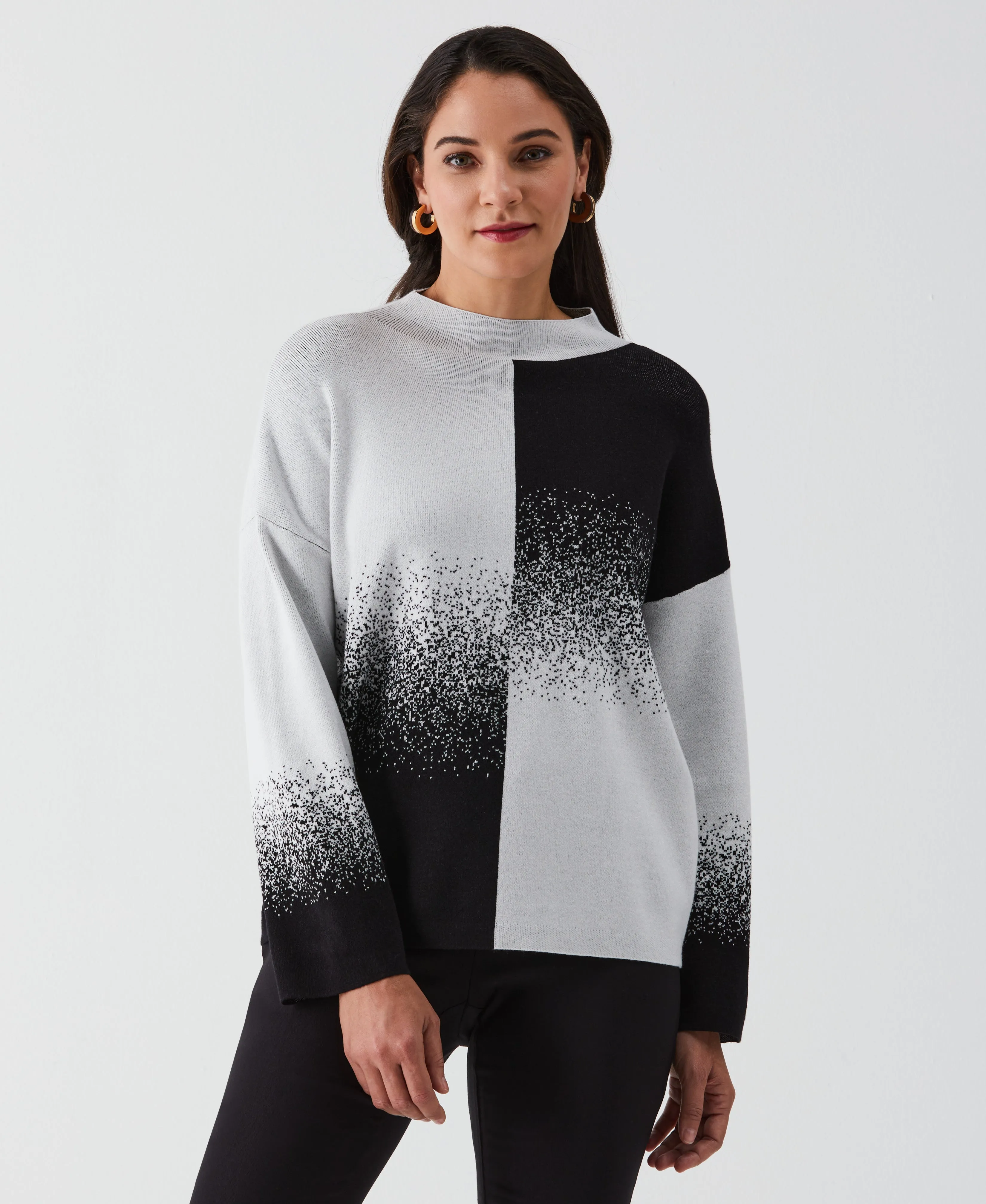 Heat things up when the weather cools with this fashionable Ella Rafaella ombre sweater. This hip-length women's pullover sweater exudes everyday sophistication with a classic turtleneck design and stylish drop shoulders. The ombre pattern transitions subtly, creating a unique visual appeal. Made from sweater knit fabric, it provides cozy warmth while the jacquard fabrication introduces a delicate two-color geometric pattern into the material.