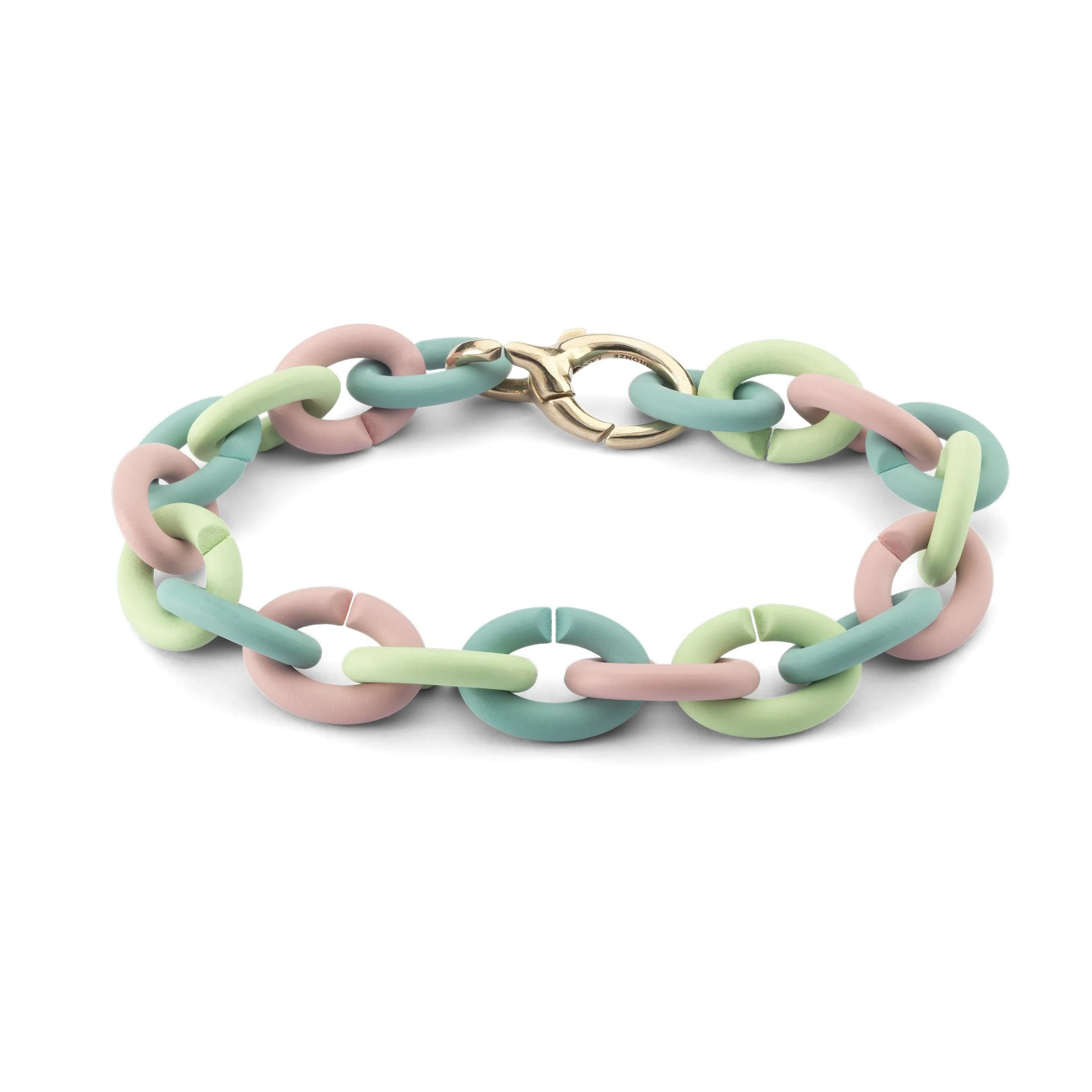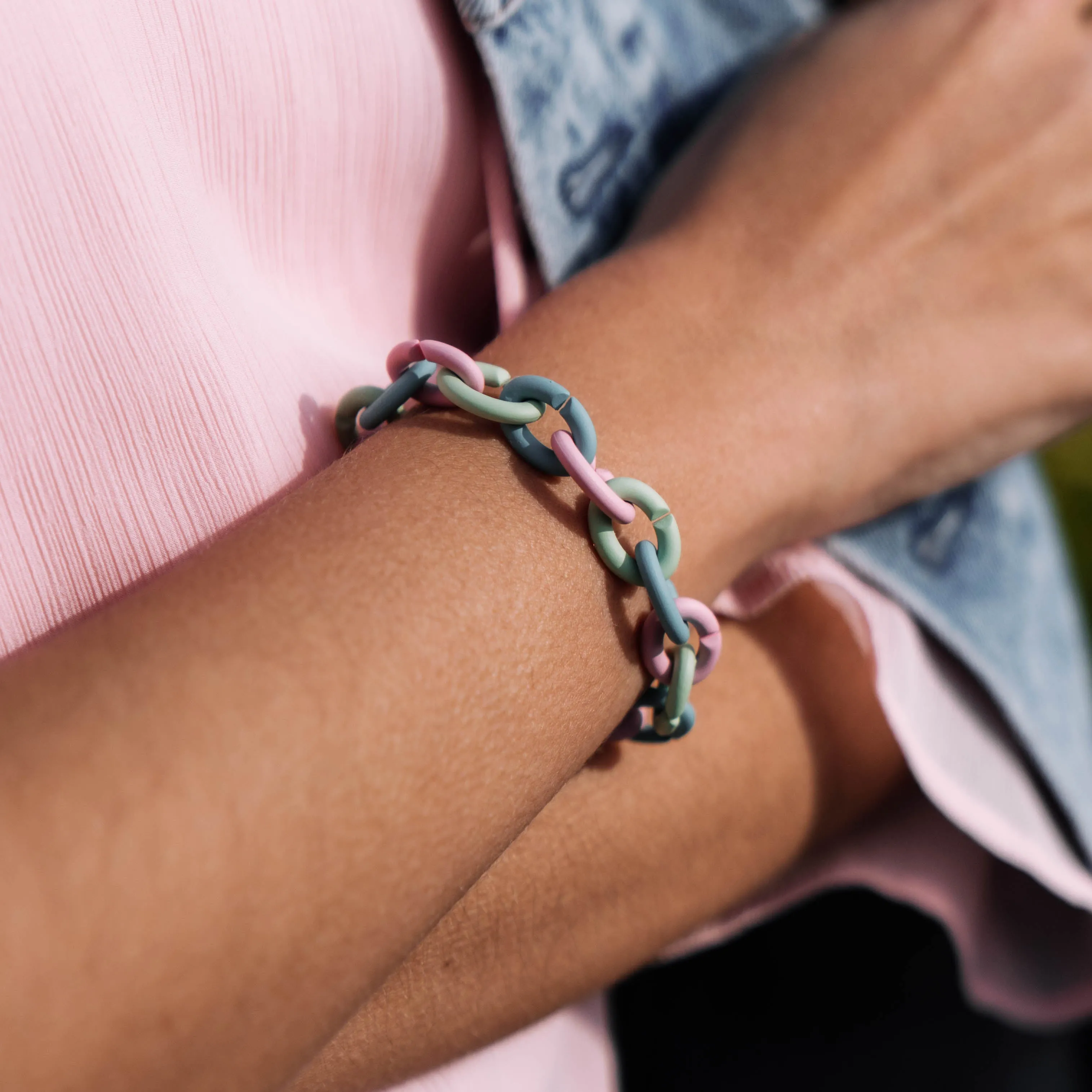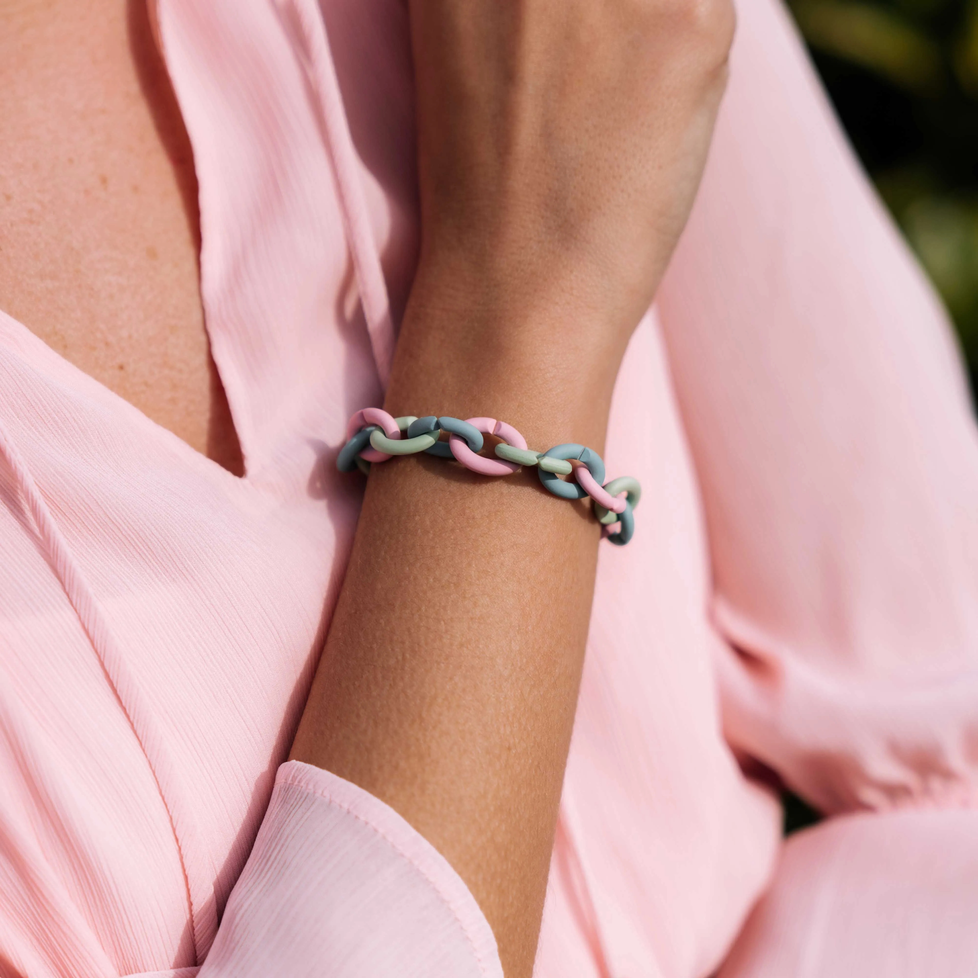 A pastel dream that never ends, that's what you get from this bracelet. A representation of all the beautiful colors in the spring. The bracelet consists of six Mint Green, seven Sky Blue, and six Lush Blush Rubber X links combined with a Basic Bronze Lock.