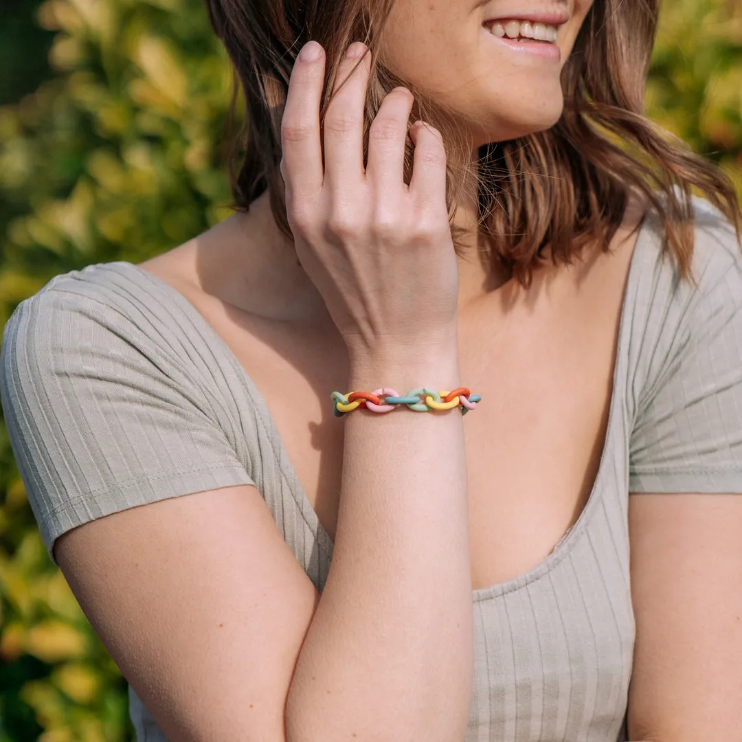 A soft and bright rainbow bracelet that spreads joy when wearing it. This bracelet consists of four Mint Green, Light Lemon, Soft Apricot, Lush Blush and three Sky Blue Rubber X links combined with a Basic Silver Lock made of 100% sterling silver.
