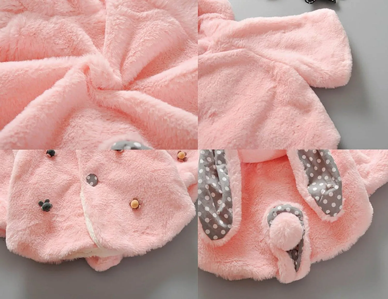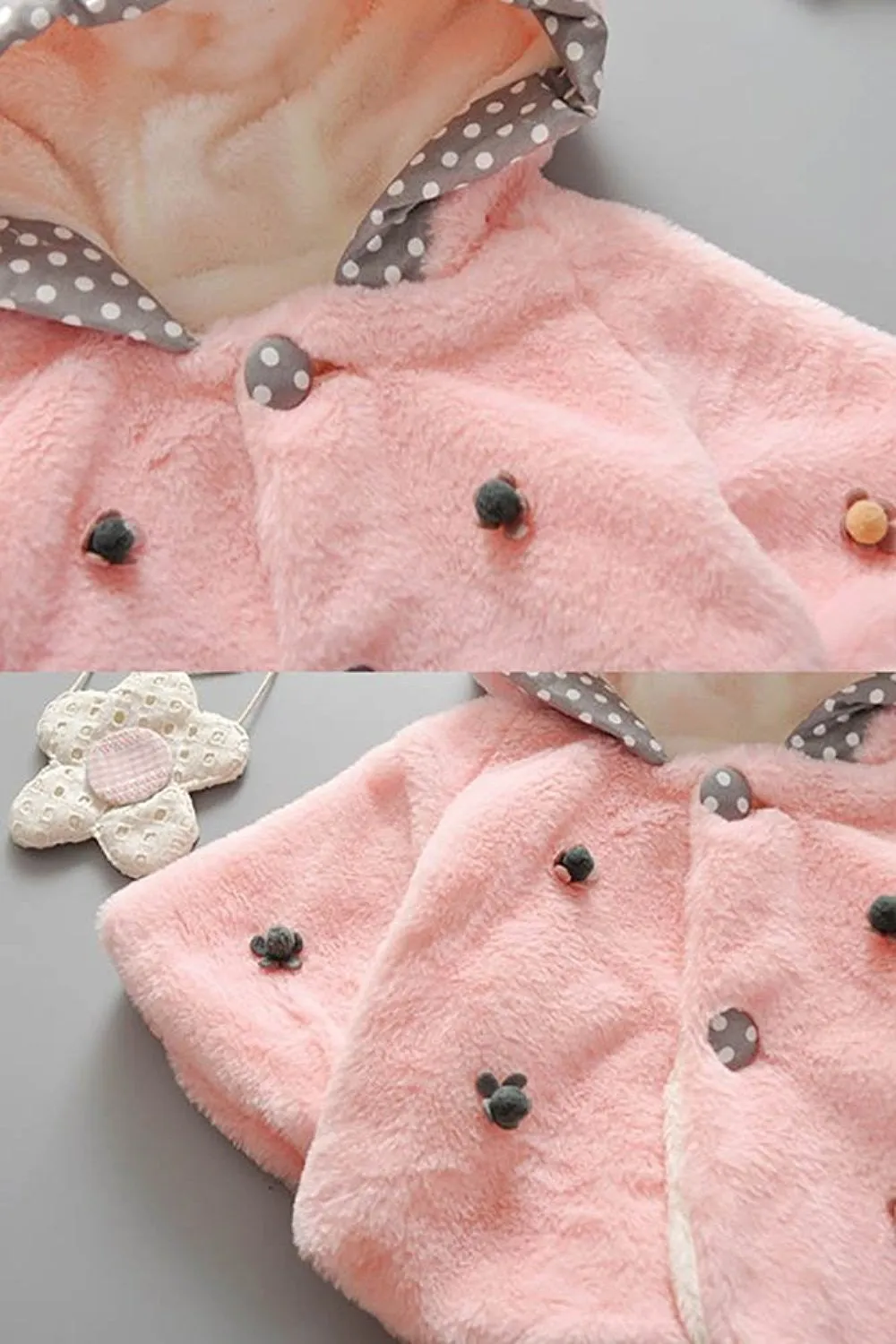 Snow bunny sweet! Your little Diva will shine so bright when she dons this adorable faux fur jacket! It features adorable Bunny ears on the hood, a bunny tail, polka dot fabric buttons and tiny floral details throughout. With a faux fur vegan interior lining, She will stay warm as ever as she plays in the snow! Great as a gift or for Holiday Portraits!