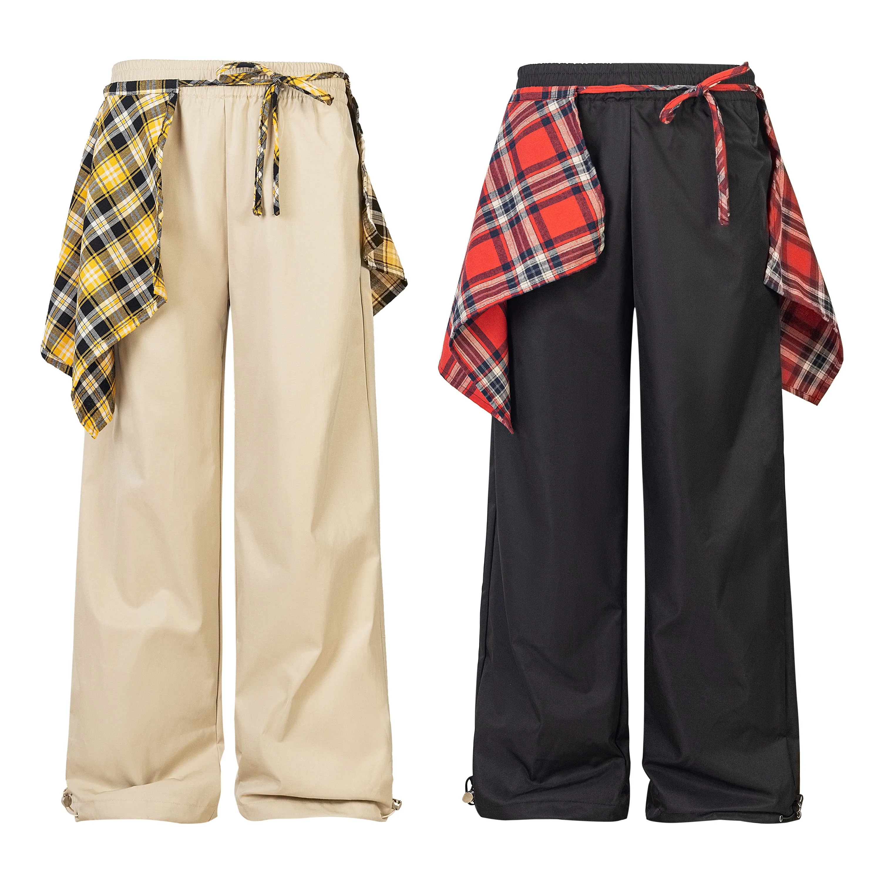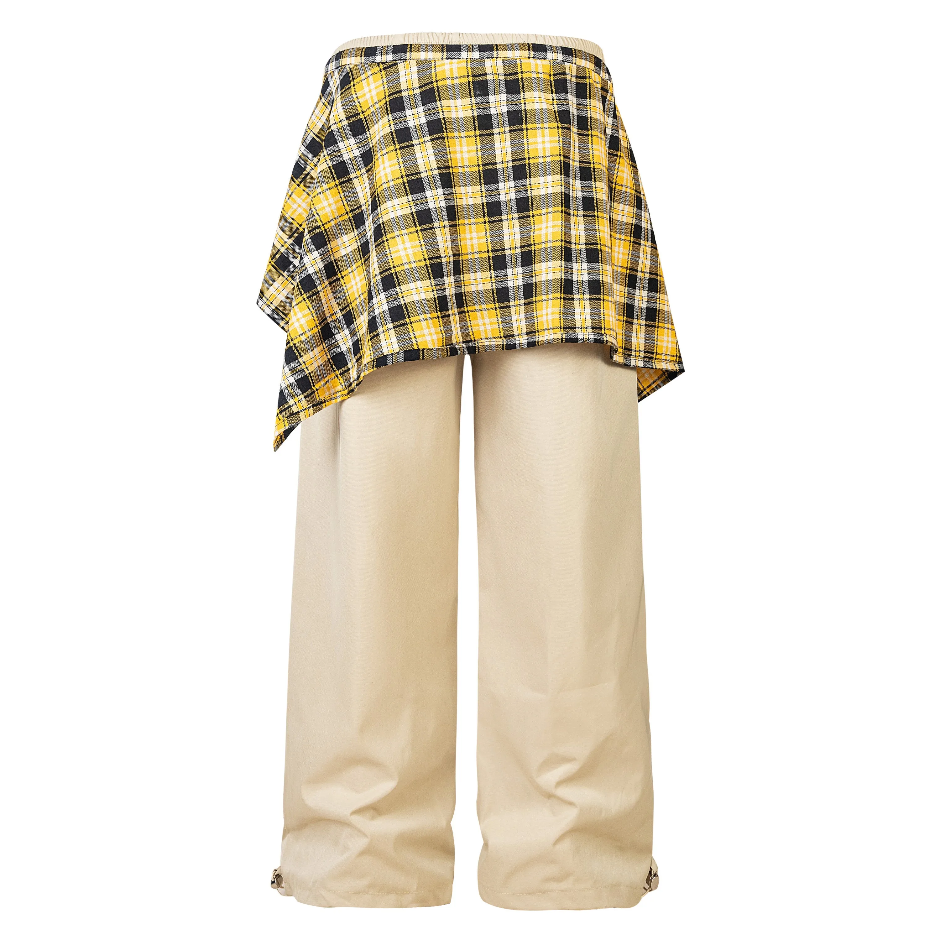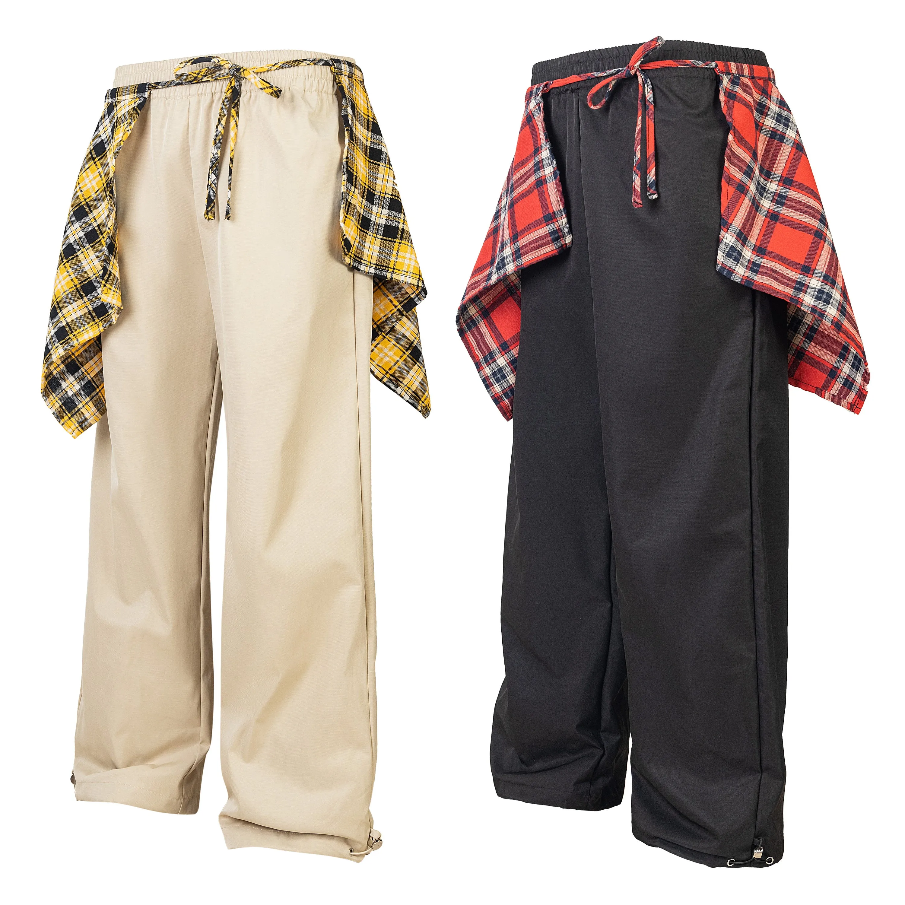 These cargos, available in beige with yellow plaid and black with red plaid, offer a striking layered look for standout streetwear.