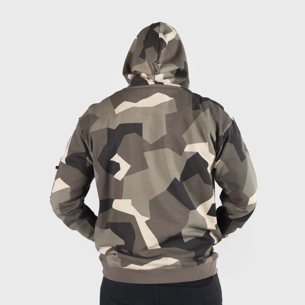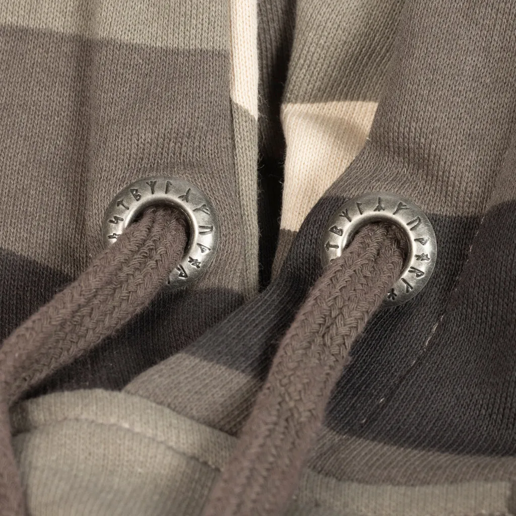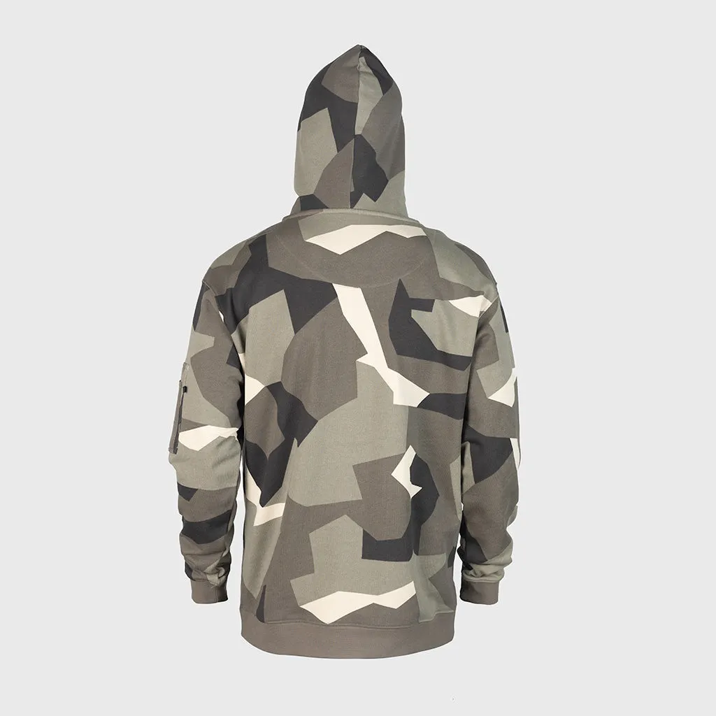 Premium pullover hoodie in the famous M90 camo pattern used by the Swedish Armed Forces. It is custom-made for Grimfrost in soft, luxurious organic cotton. Even the dyeing and printing processes are fully organic, which is good for both You and Mother Earth. The hoodie comes with a zipped utility pocket on the left arm and spacious kangaroo pouch pockets. To top things off, we have given the drawstring eyelets a Younger Futhark runic circle.