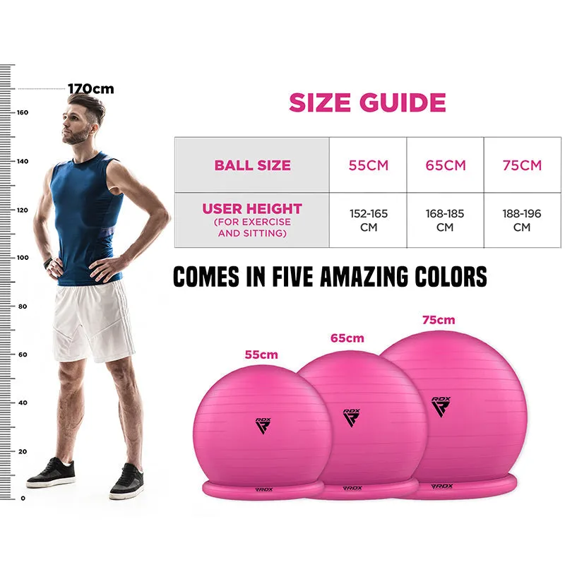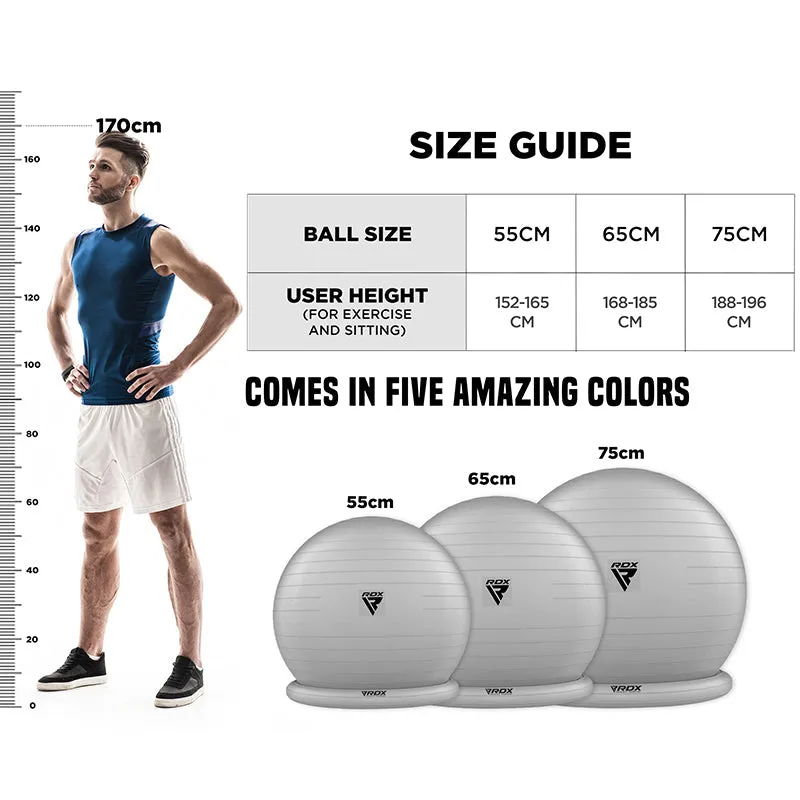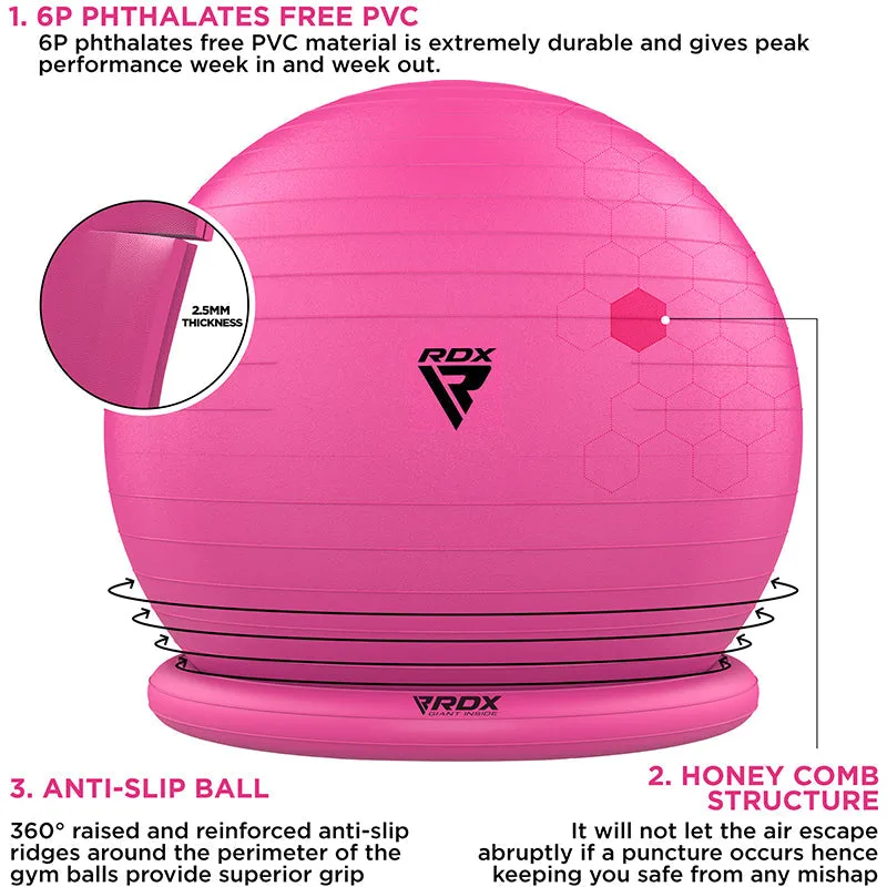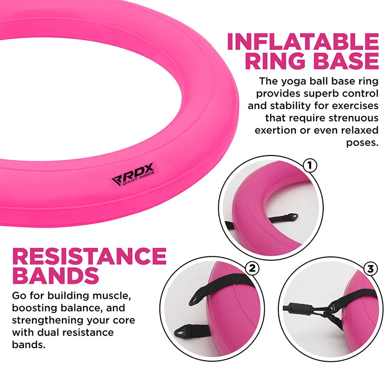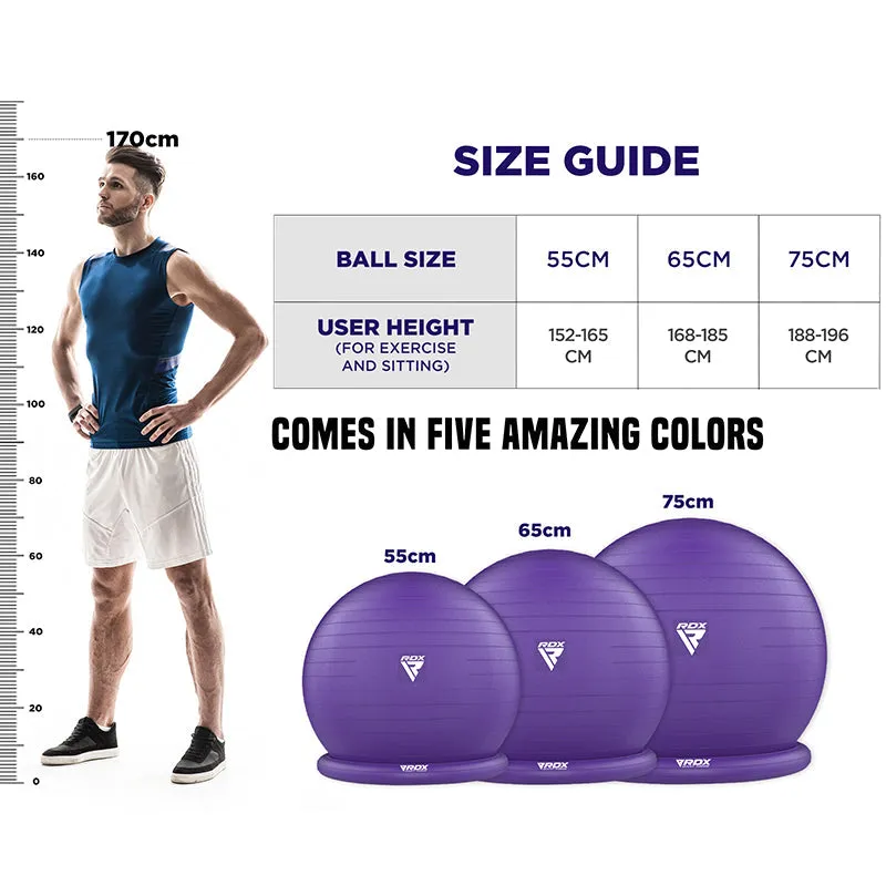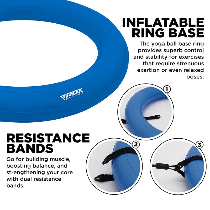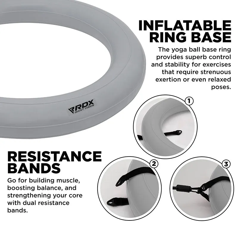 Give your exercises an equally creative and functional makeover by adding the fitness ball with base into your workouts. Step up your calisthenics, yoga, cardio and even strength training routines with RDX's yoga ball and Balance Ring Base. Manufactured from anti-burst, premium quality PVC to sustain weight (up to 250kg) while retaining smooth elasticity and slowly deflate when punctured instead of exploding into pieces. Water-resistant and free from toxins to provide a wholesome workout experience. The yoga ball base ring provides superb control and stability for exercises that require strenuous exertion or even relaxed poses. The removable inflatable ring base (weighing 800g) allows you to perform ball-only routines “ including aerobics, yoga and physio ball exercises. Soft, anti-slip surface with 360° slip-resistant lines pattern deliver superior grip to prevent unwanted slipping and sliding of the gym ball. Ideal fitness ball for home gym to achieve whole body exercises, improve balance and relieve pain. Recommended for use during pregnancy by providing a comfortable sitting surface for correcting posture and relieving pressure off the spine. Great for birthing exercises to prepare for delivery.Easy to inflate stability ball and base set includes a quick inflation Foot Pump, 2 Air Stopper, 1 Stopper Remover, comprehensive exercise manual and resistance tubes set for an immediate upper body and core-strengthening workouts. Available in 5 different colours including red, blue, grey, pink and purple. Choose from 3 sizes “ 55cm (900g), 65cm (1100g), 75cm (1300g) for the perfect yoga ball and base set according to your height.