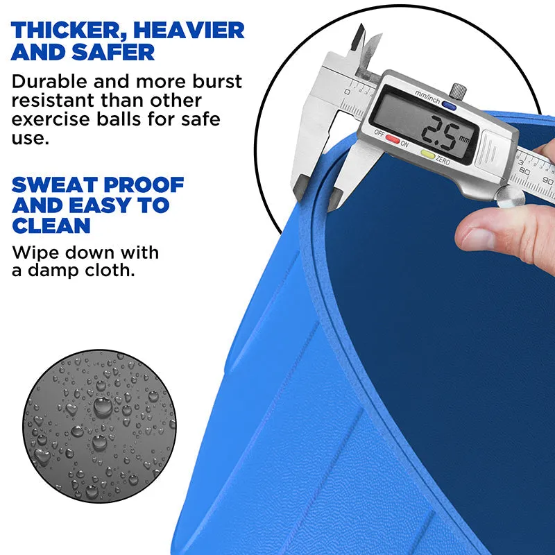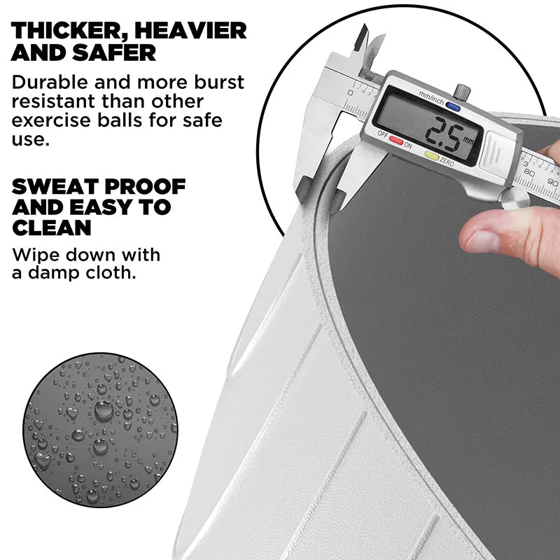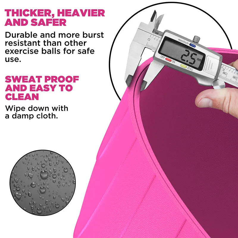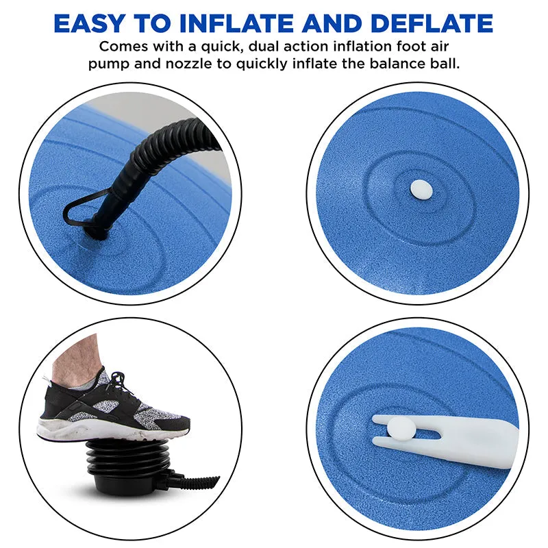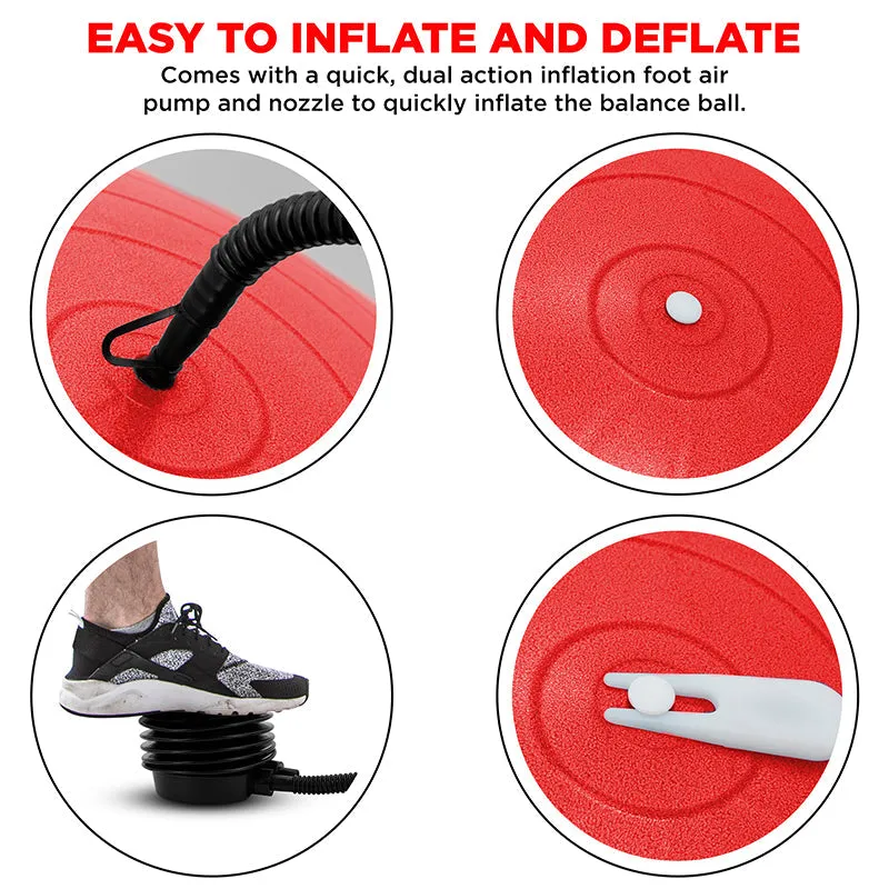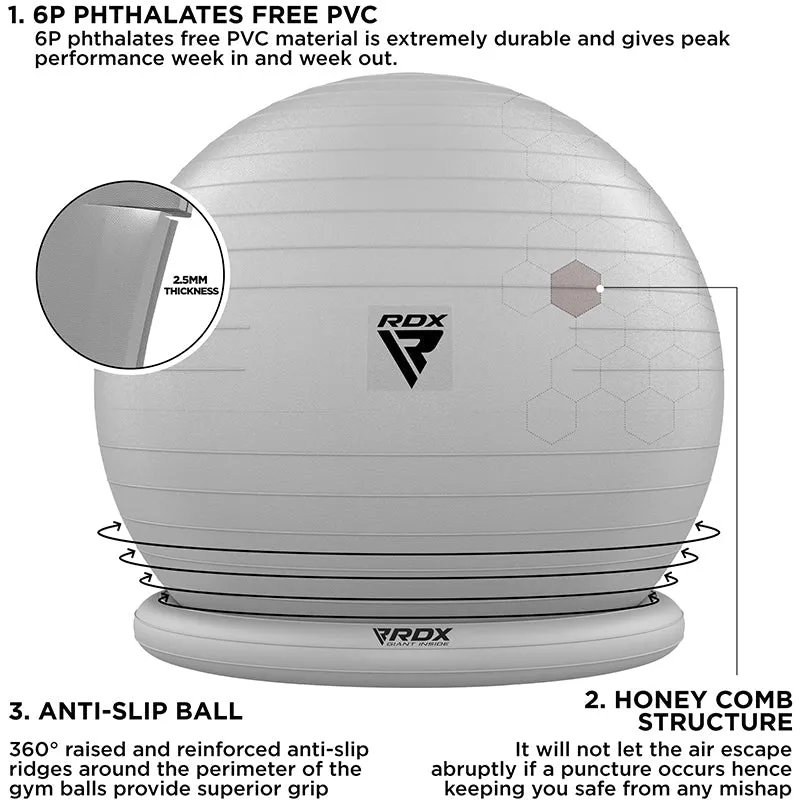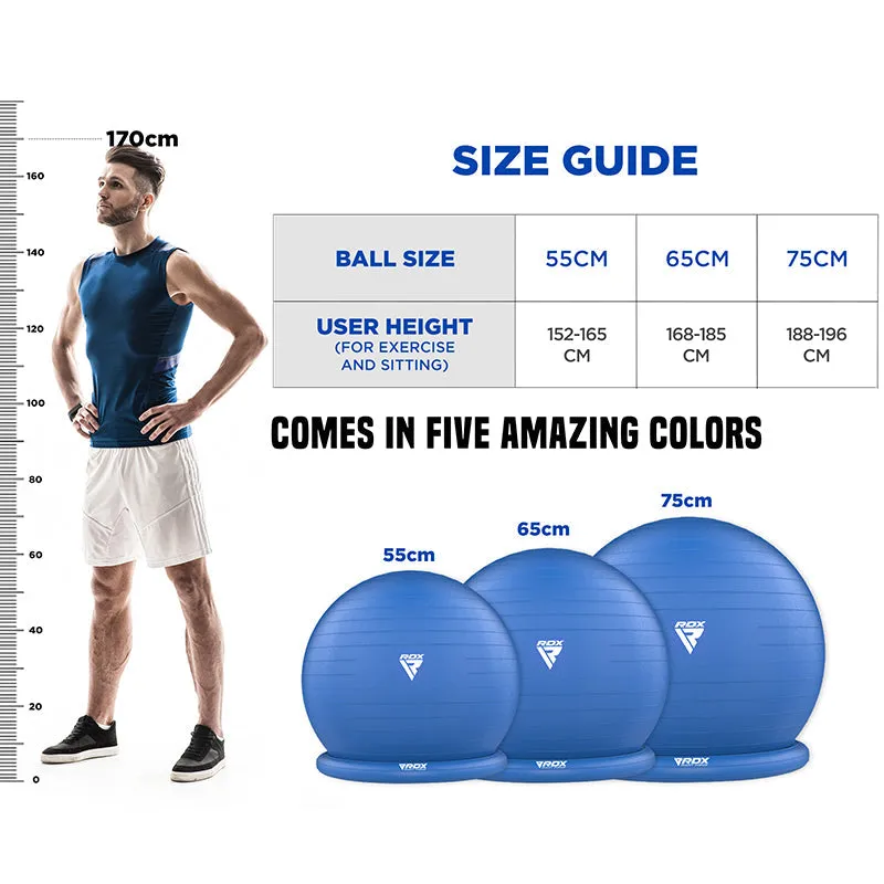 Give your exercises an equally creative and functional makeover by adding the fitness ball with base into your workouts. Step up your calisthenics, yoga, cardio and even strength training routines with RDX's yoga ball and Balance Ring Base. Manufactured from anti-burst, premium quality PVC to sustain weight (up to 250kg) while retaining smooth elasticity and slowly deflate when punctured instead of exploding into pieces. Water-resistant and free from toxins to provide a wholesome workout experience. The yoga ball base ring provides superb control and stability for exercises that require strenuous exertion or even relaxed poses. The removable inflatable ring base (weighing 800g) allows you to perform ball-only routines “ including aerobics, yoga and physio ball exercises. Soft, anti-slip surface with 360° slip-resistant lines pattern deliver superior grip to prevent unwanted slipping and sliding of the gym ball. Ideal fitness ball for home gym to achieve whole body exercises, improve balance and relieve pain. Recommended for use during pregnancy by providing a comfortable sitting surface for correcting posture and relieving pressure off the spine. Great for birthing exercises to prepare for delivery.Easy to inflate stability ball and base set includes a quick inflation Foot Pump, 2 Air Stopper, 1 Stopper Remover, comprehensive exercise manual and resistance tubes set for an immediate upper body and core-strengthening workouts. Available in 5 different colours including red, blue, grey, pink and purple. Choose from 3 sizes “ 55cm (900g), 65cm (1100g), 75cm (1300g) for the perfect yoga ball and base set according to your height.