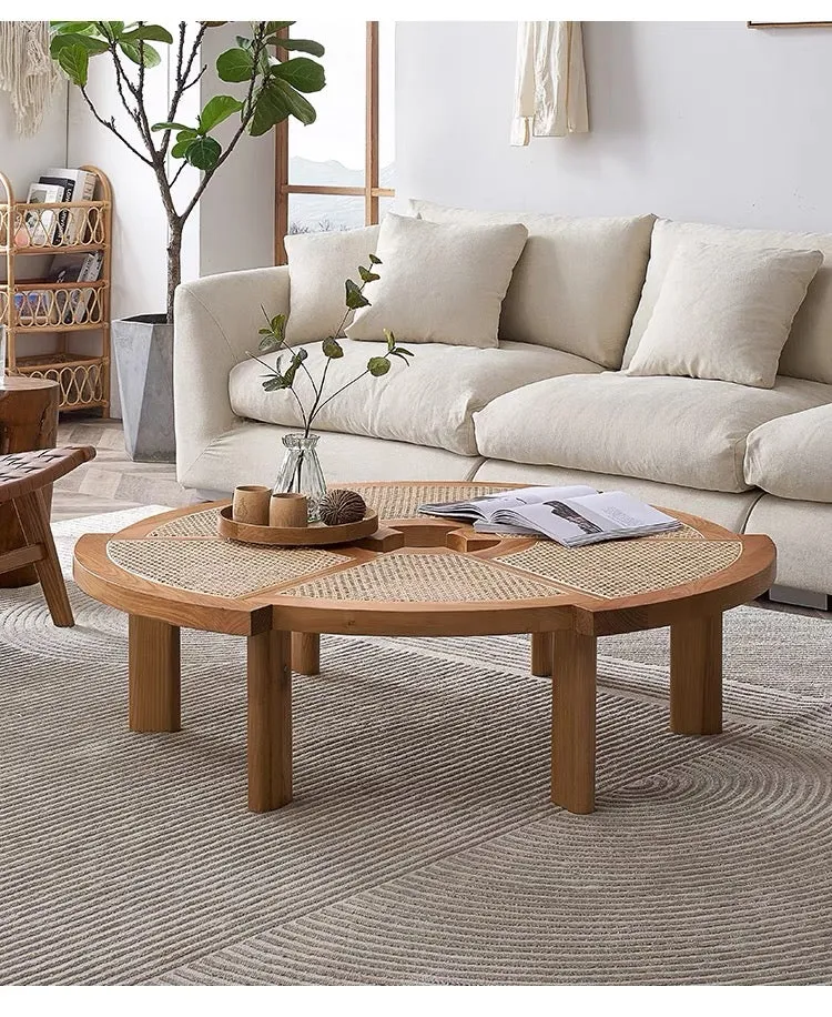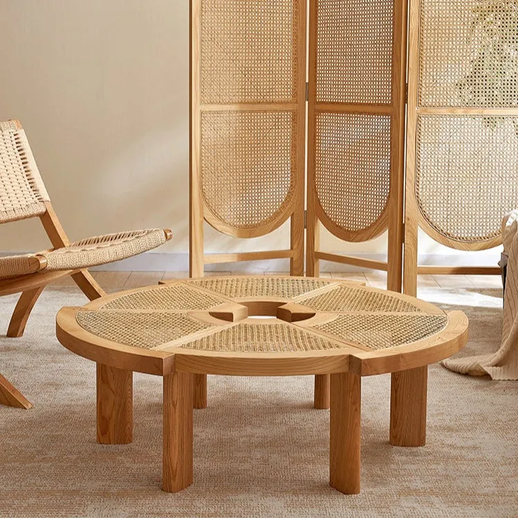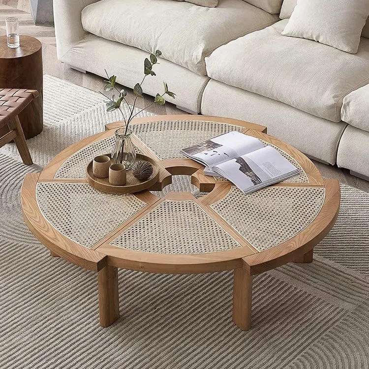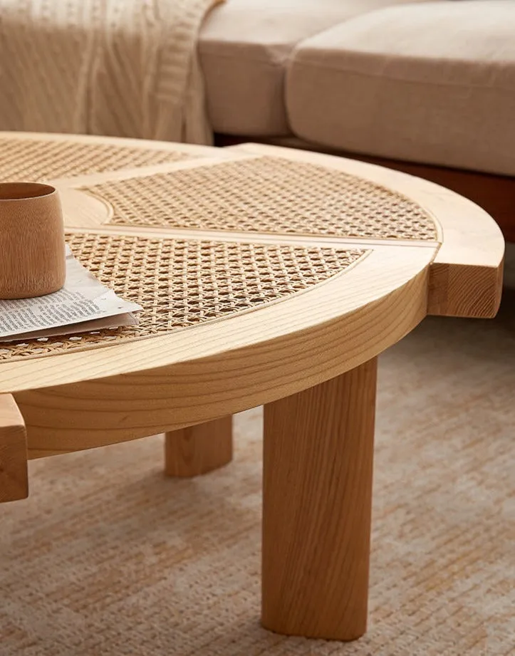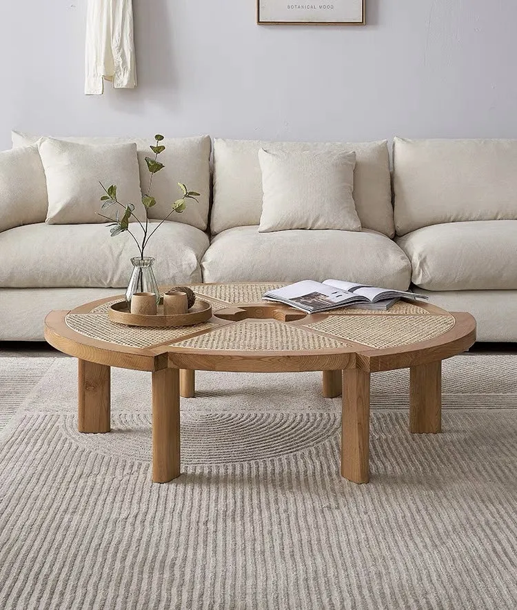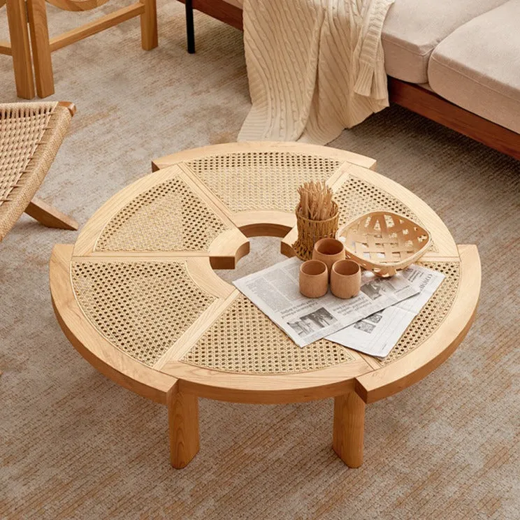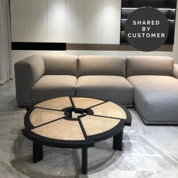 Originally designed by Charlotte Perriand, a French architect and designer, in 1962. This Replica Rio Low Table's unusual design, combined with its functionality, elevates it to the status of a masterpiece. This round coffee table is made of solid ash wood with a transparent matt finish and a rattan cane mesh top. The six non-aligned sections that make up the table top with a hole in the centre come in three different colours - natural, walnut or black.