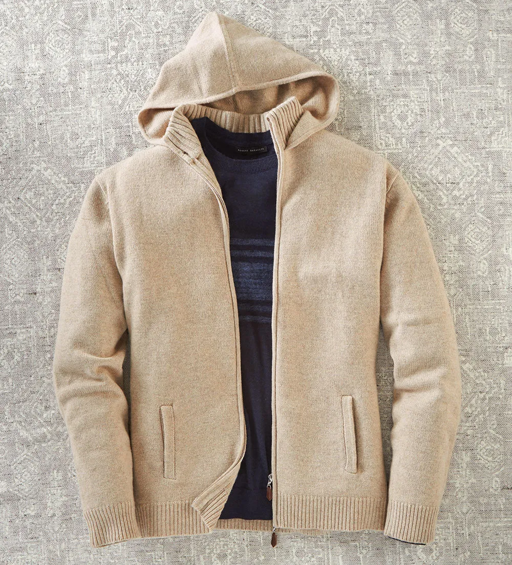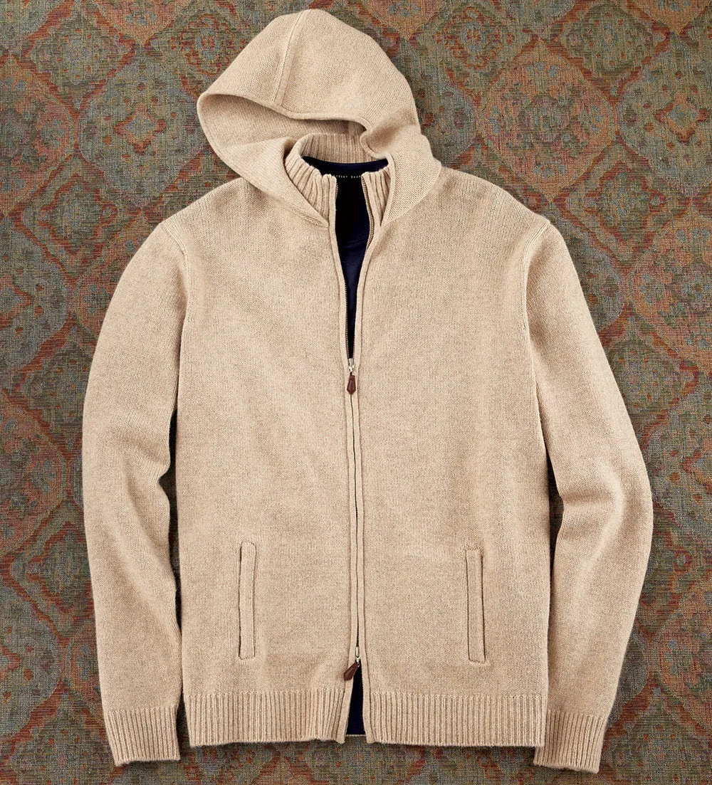 Luxuriously light, soft and warm in 100% cashmere. Attached drawstring hood, welt pockets, self elbow patches, ribbed mock collar, cuffs and waist. Hand wash or dry clean. Imported.