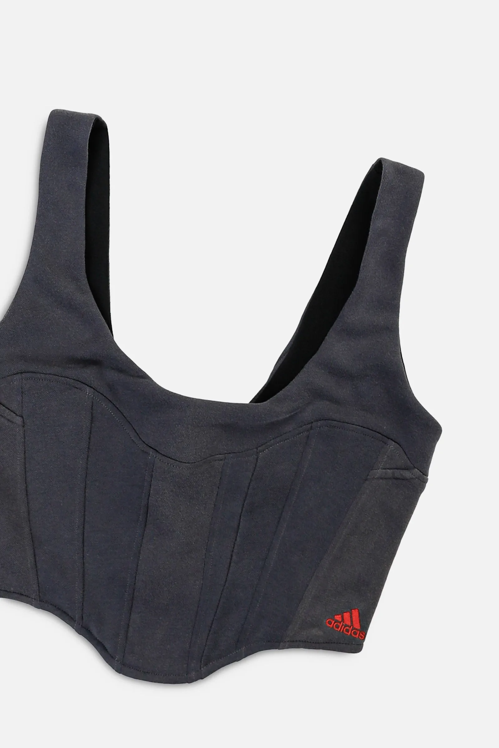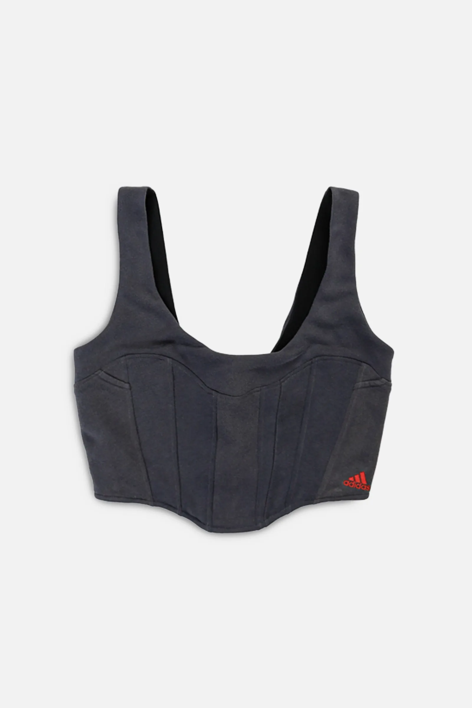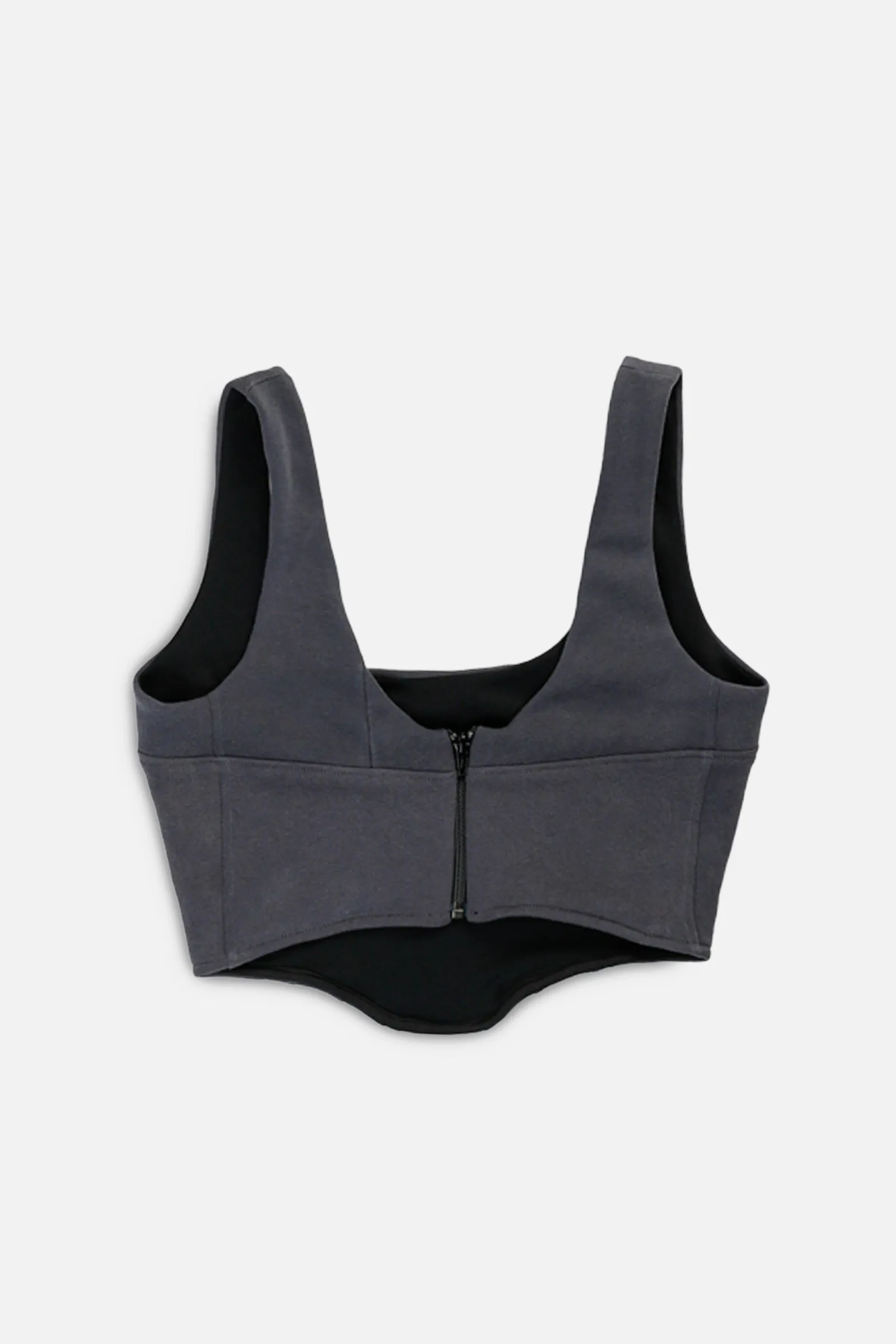 Panelled bustier tank featuring a curved style line throughout the bust, upcycled from a vintage sweater. Lined in stretch spandex for extra comfort & support. Exposed back zipper closure.