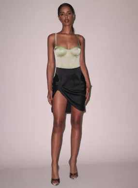 Panelled bustier tank featuring a curved style line throughout the bust, upcycled from a vintage sweater. Lined in stretch spandex for extra comfort & support. Exposed back zipper closure.