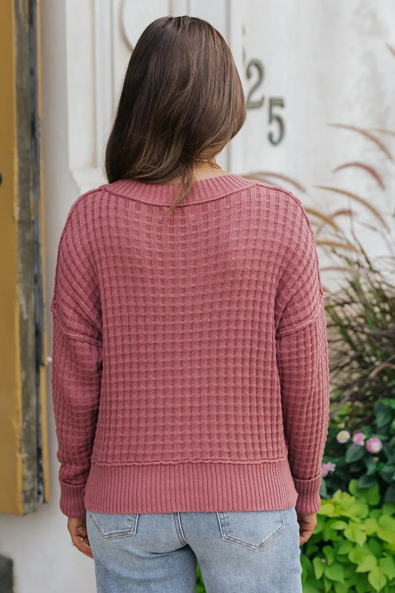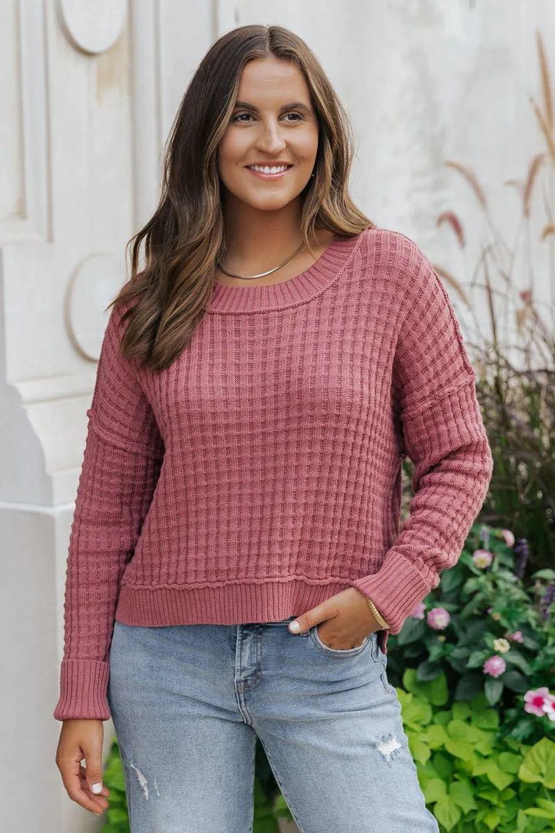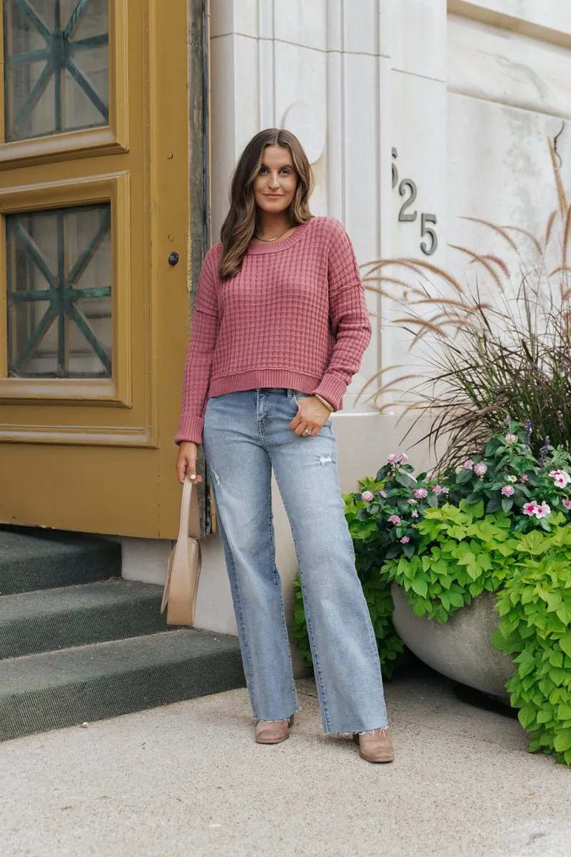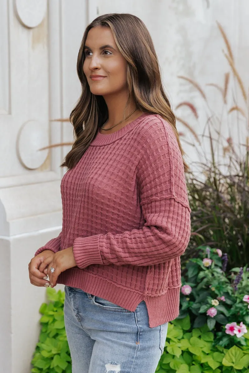 This Ruby Crew Neck Waffle Knit Pullover Sweater features a classic design and ribbed detailing, perfect for adding both warmth and style to your wardrobe. With long sleeves and side slits for added comfort, this sweater is a must-have for any fashion-forward individual! Style it with , , and simple gold to complete the look.