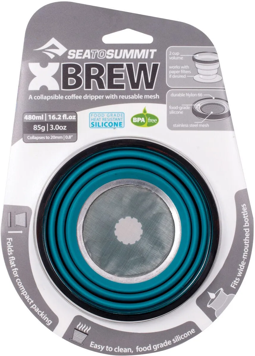 Ideal for the travelling barista, the Sea to Summit X-Brew Coffee Dripper is a collapsible coffee dripper with a reusable mesh filter. Its compact size and two cup capacity is the perfect accessory for any trip. Fits on wide-mouthed water bottles for coffee on the go. Simply pour boiling water into the coffee-filled X-brew, let it drip into the cup below and enjoy!