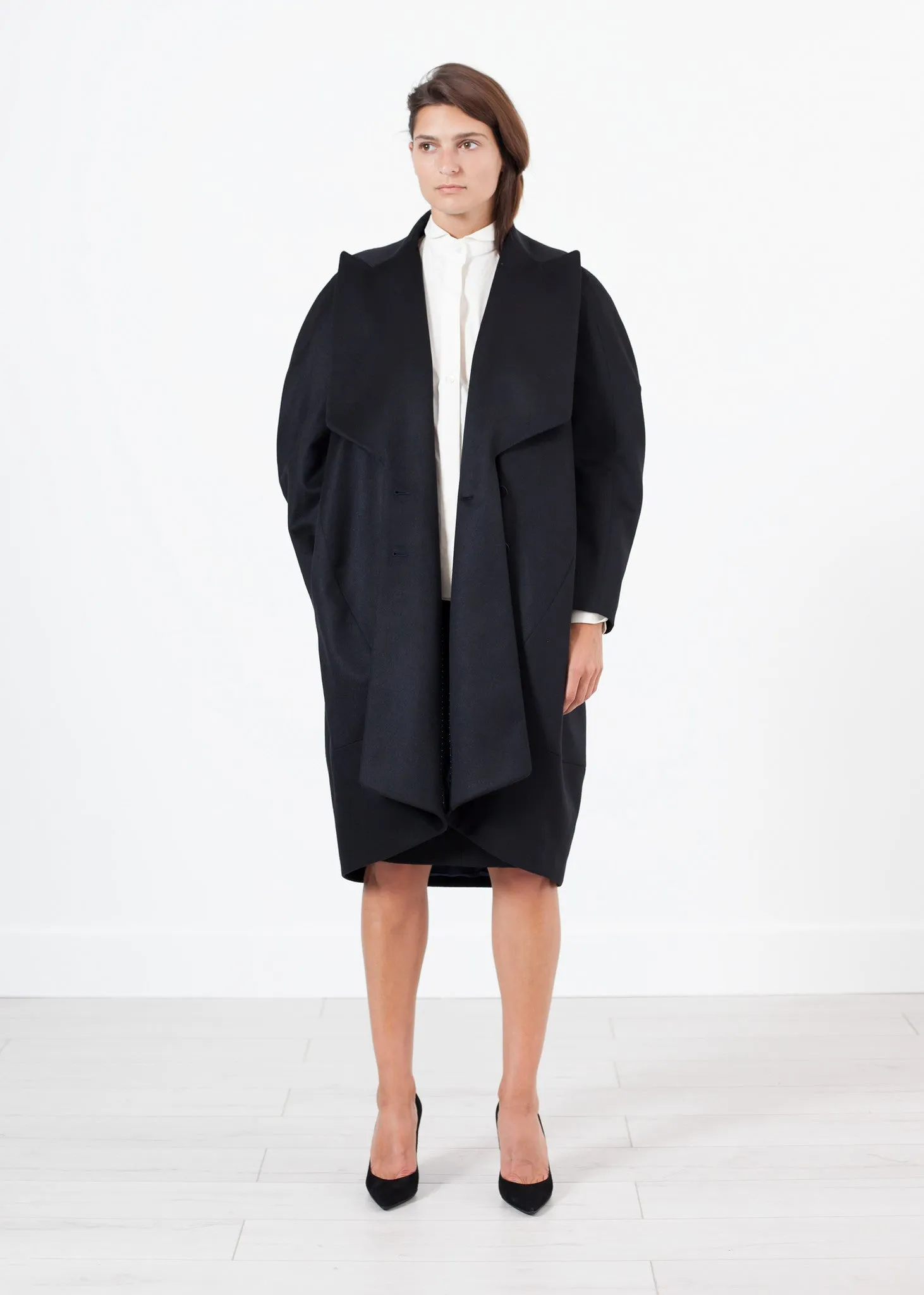 The oversized cocoon shape of this weighty and elegant coat is polish personified with crisp-notched lapels and generous sleeves. Finished with a concealed two-button closure and slit pockets that fall at the waist. Gianfranco Scotti. Color Black. 100% Shahmina wool, Lining 100% Silk.