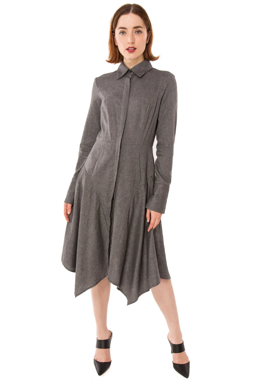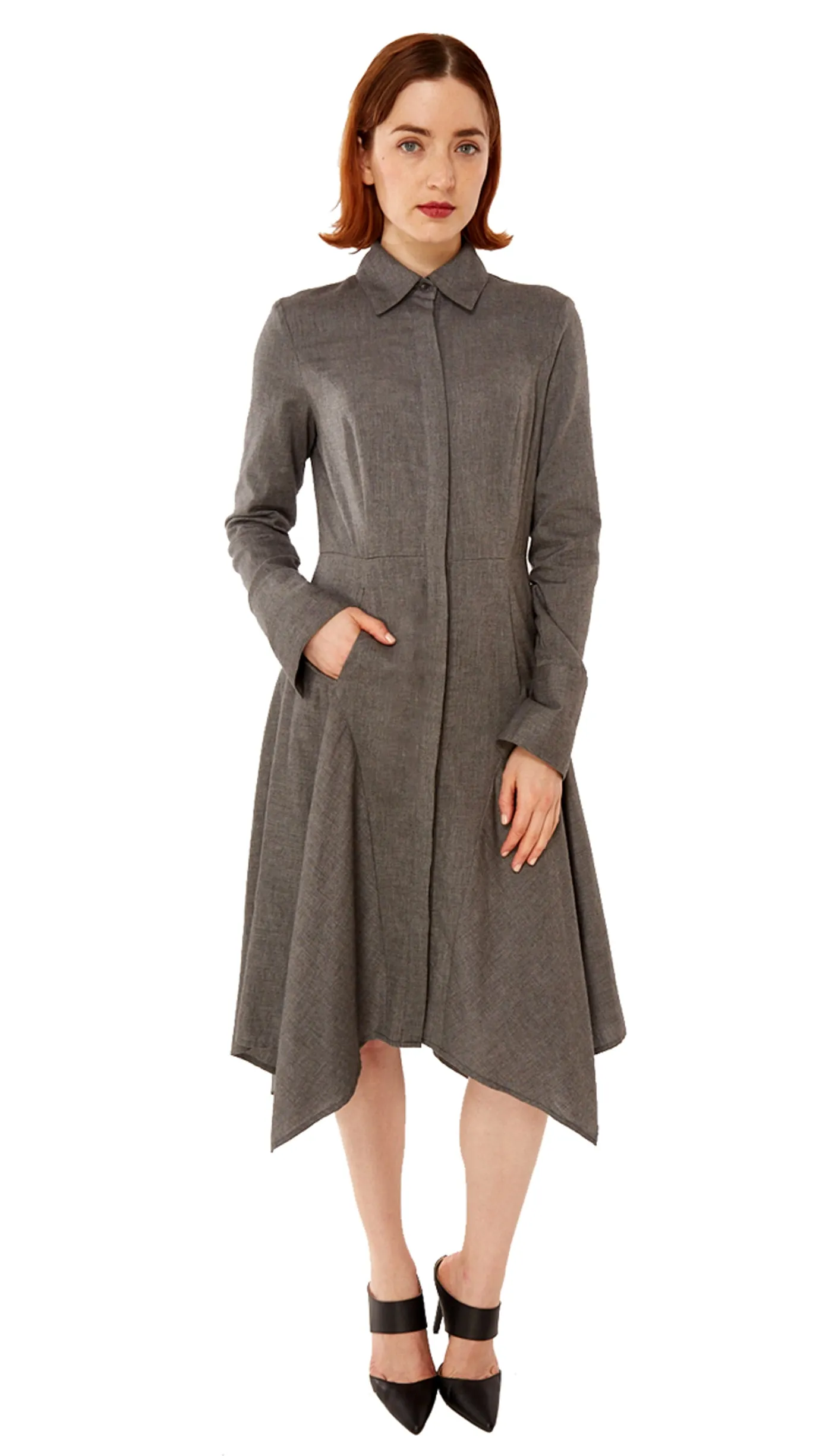 A shirtdress is like an amazing long term relationship. Always there for you when you need it, all seasons of the year, from day into night. Wear it to the office or add a belt & heel out to a cocktail party. Tailored classic fit through the body & flares out with bias insets from the low hip to hem.