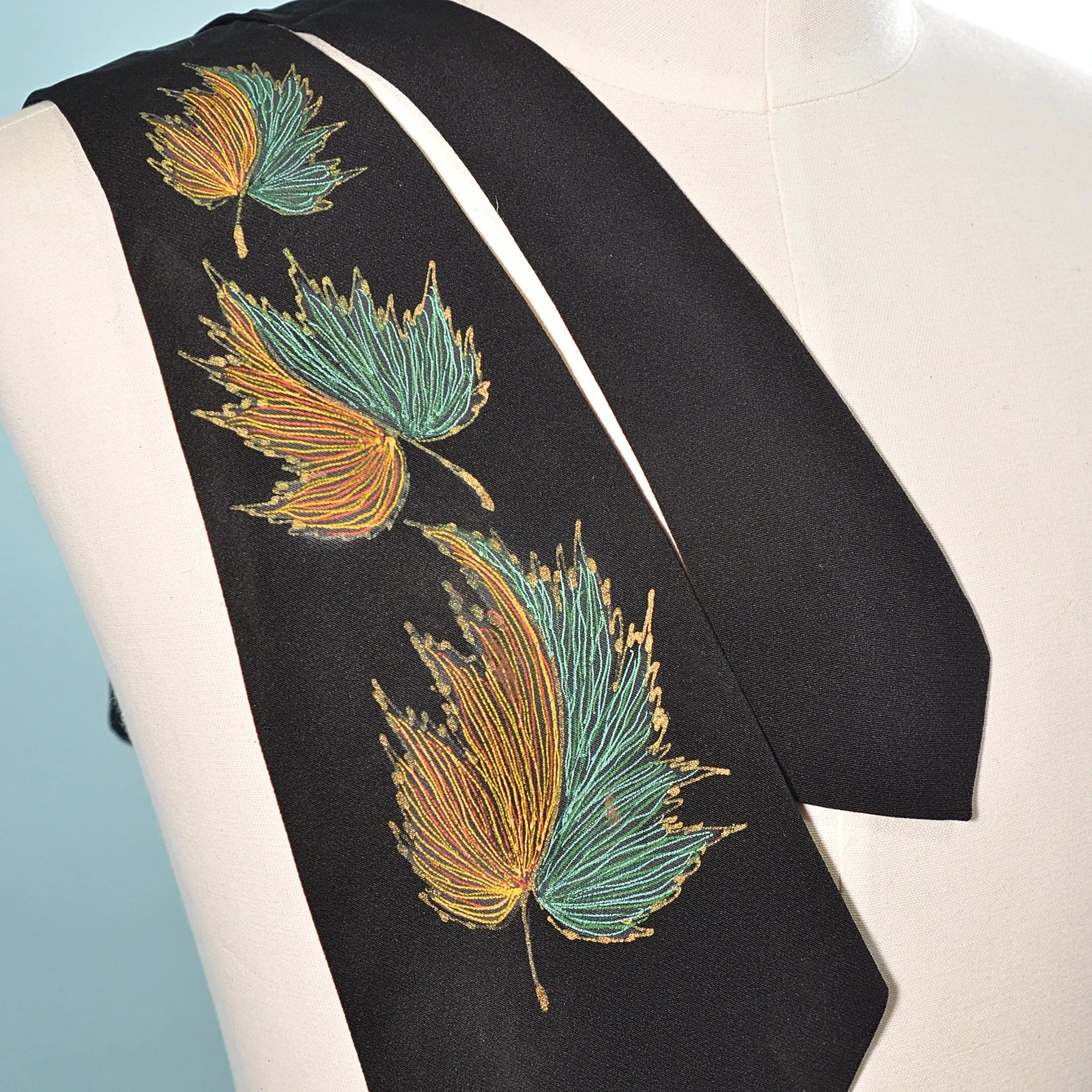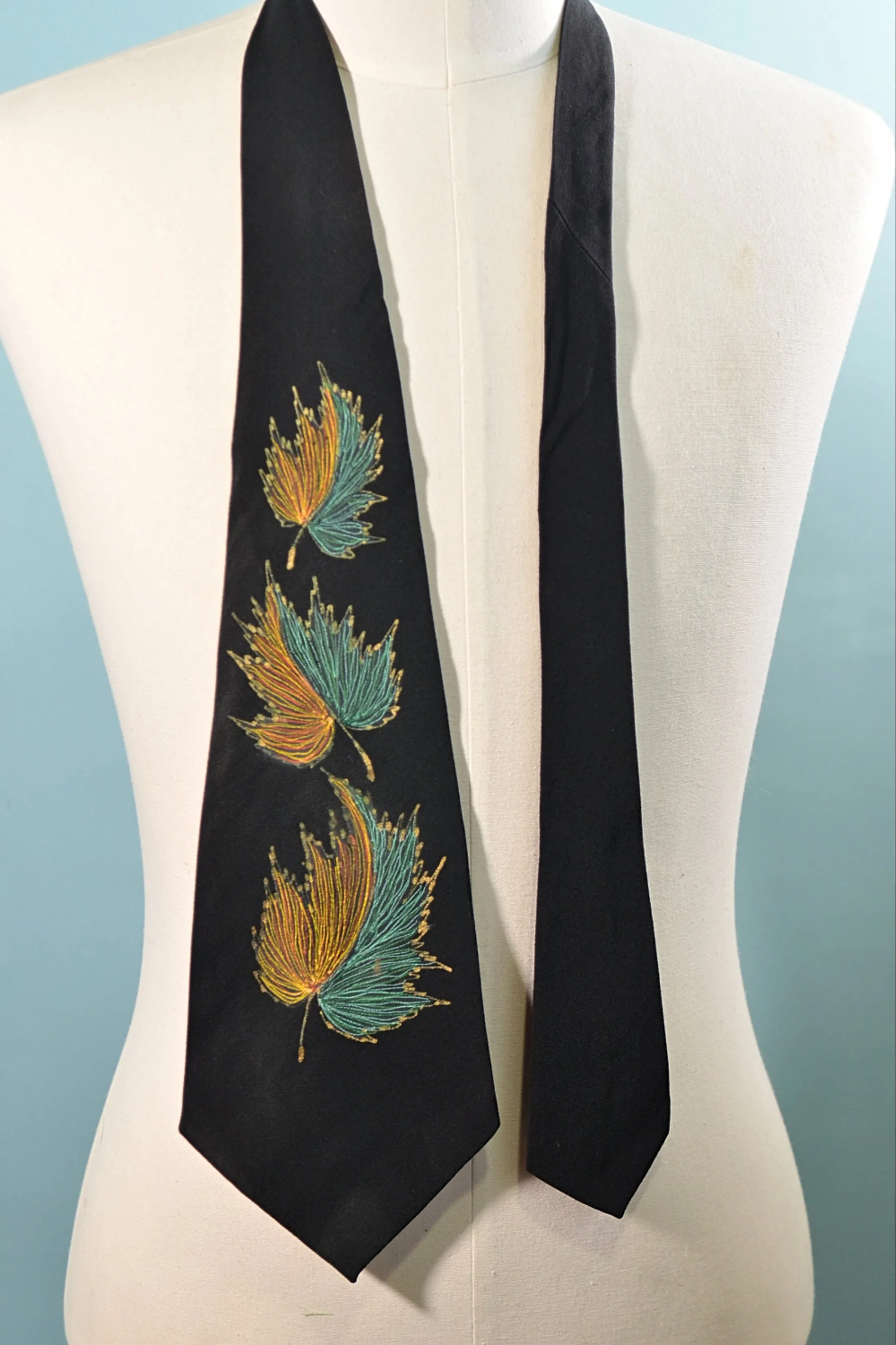 Vintage 40/50s men's black hand-painted tie. MCM leaf pattern.