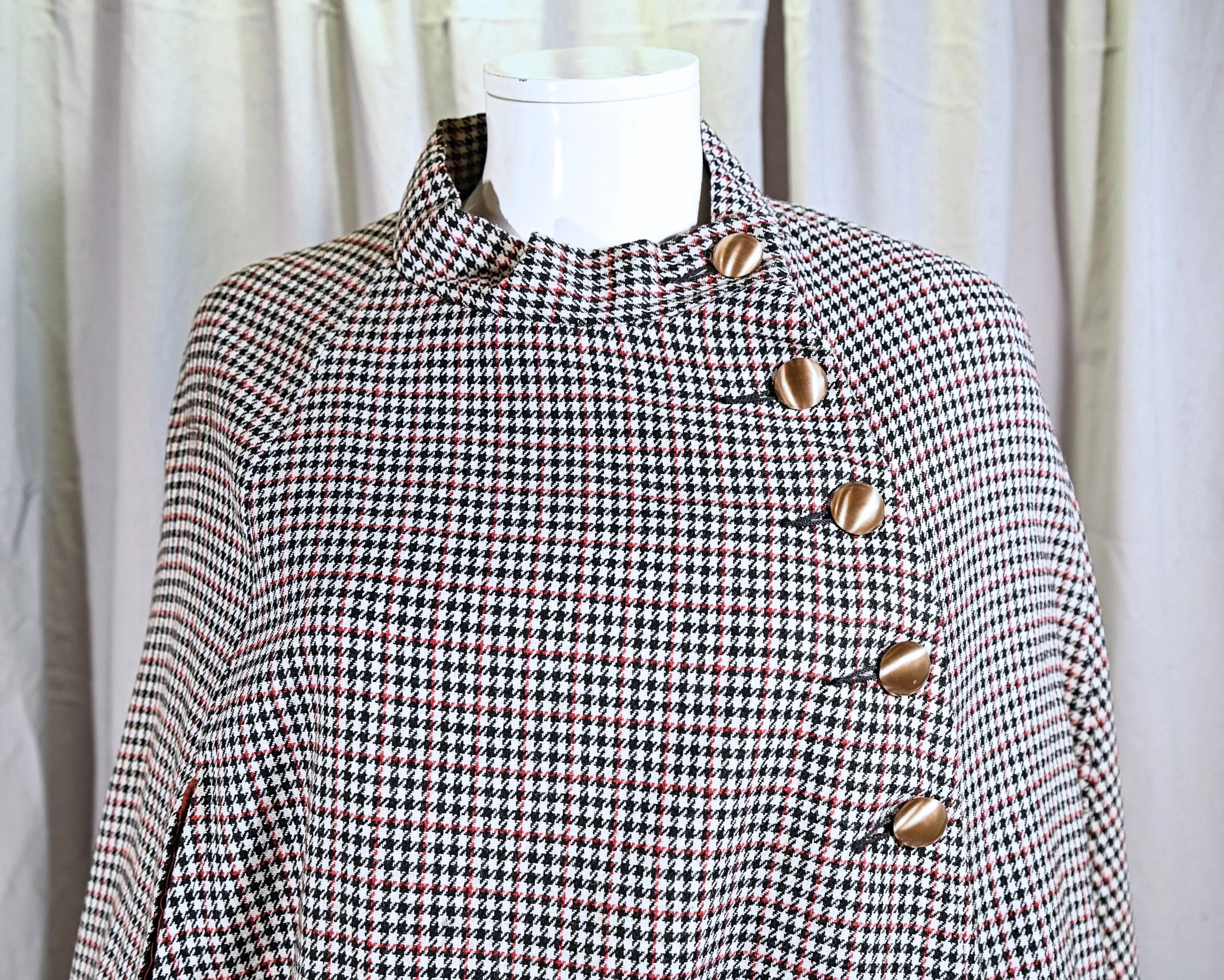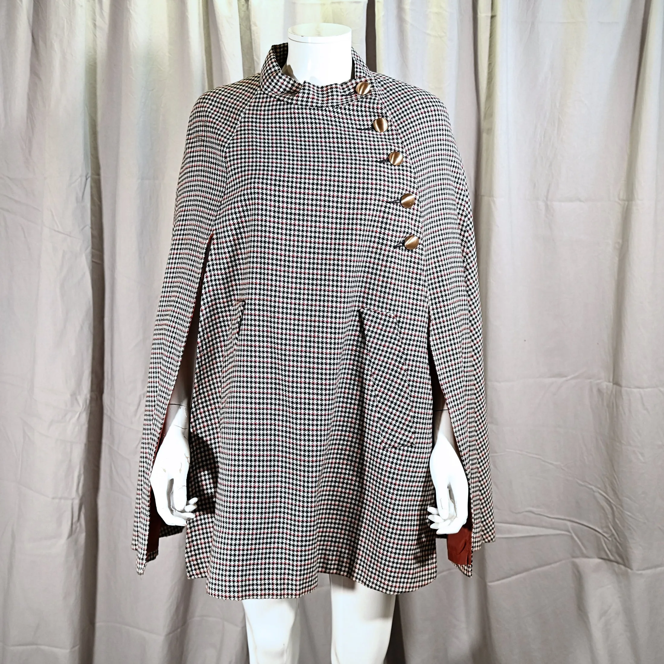 Vintage 60s houndstooth cape with open slits on the front and buttons up the side.