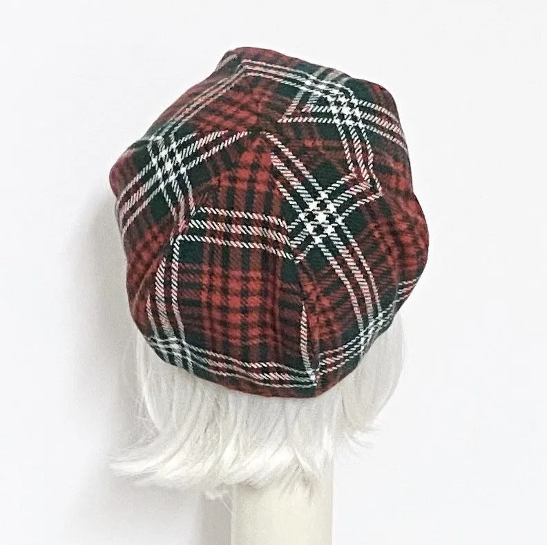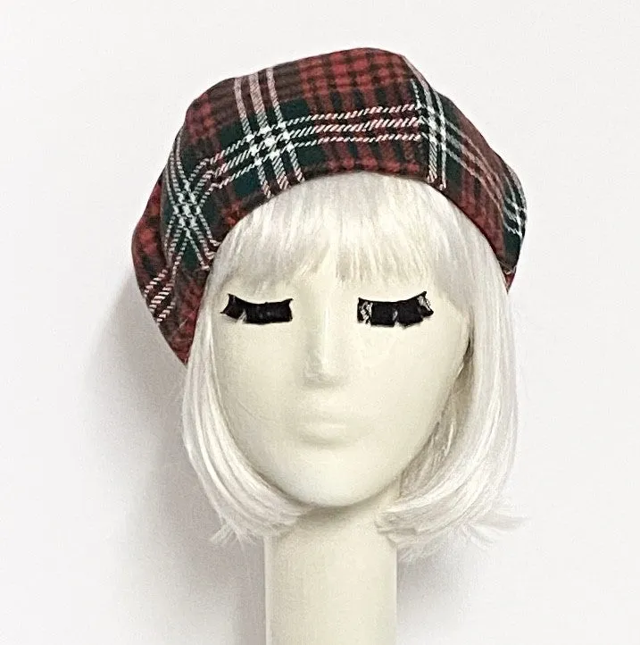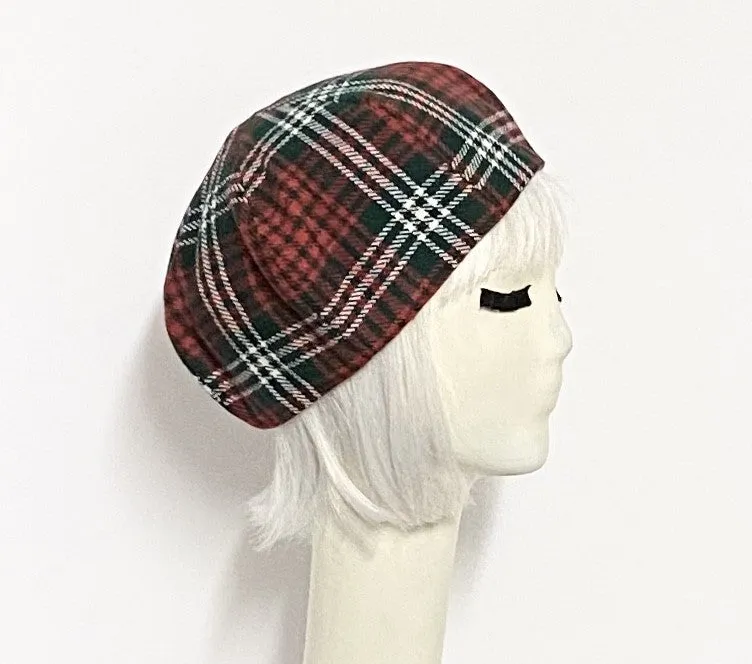 Red, forest green & white plaid tartan vintage wool beret hat, lined in rayon print, the top of the hat is made up of 6 section crown, wool bias 1" fitted band and !' soft elastic band inside.