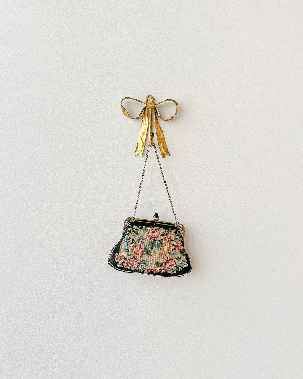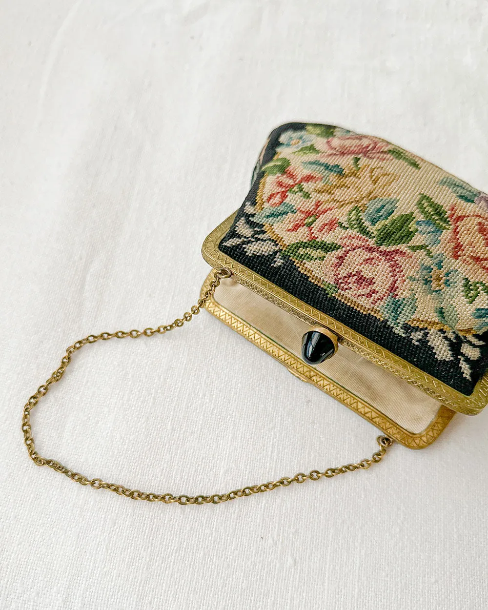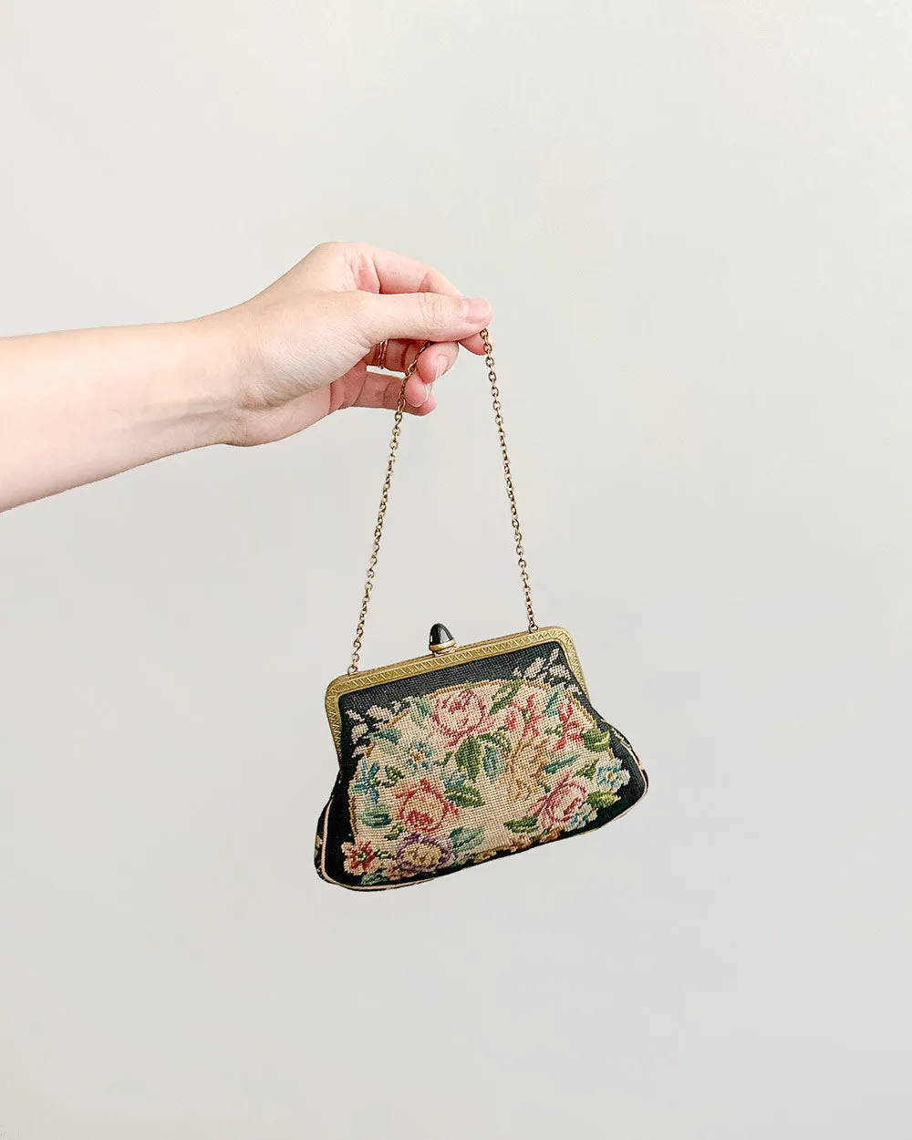 Beautiful and sweet as can be vintage 1930s petite tapestry evening purse featuring large rose design on front and back against an inky black backdrop. This vintage 30s floral bag features kiss lock closure with jet black bead accent and single chain handle. Lined.