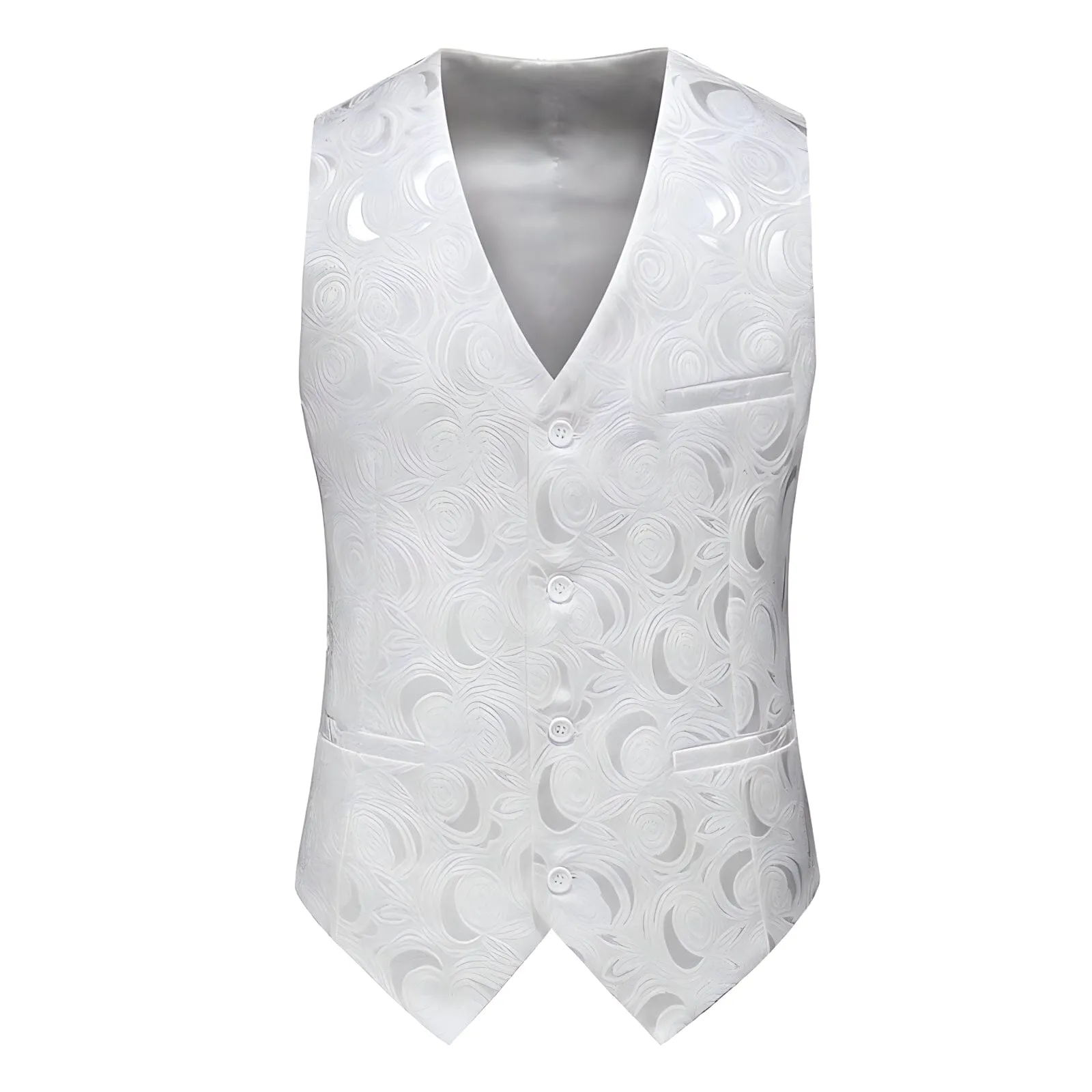 Fall in love with the luxurious detail and styling on this gorgeous tuxedo vest. Features a tasteful jacquard exterior, sleek modern fit, and detailed construction throughout. You're going to love the way you look in this piece.