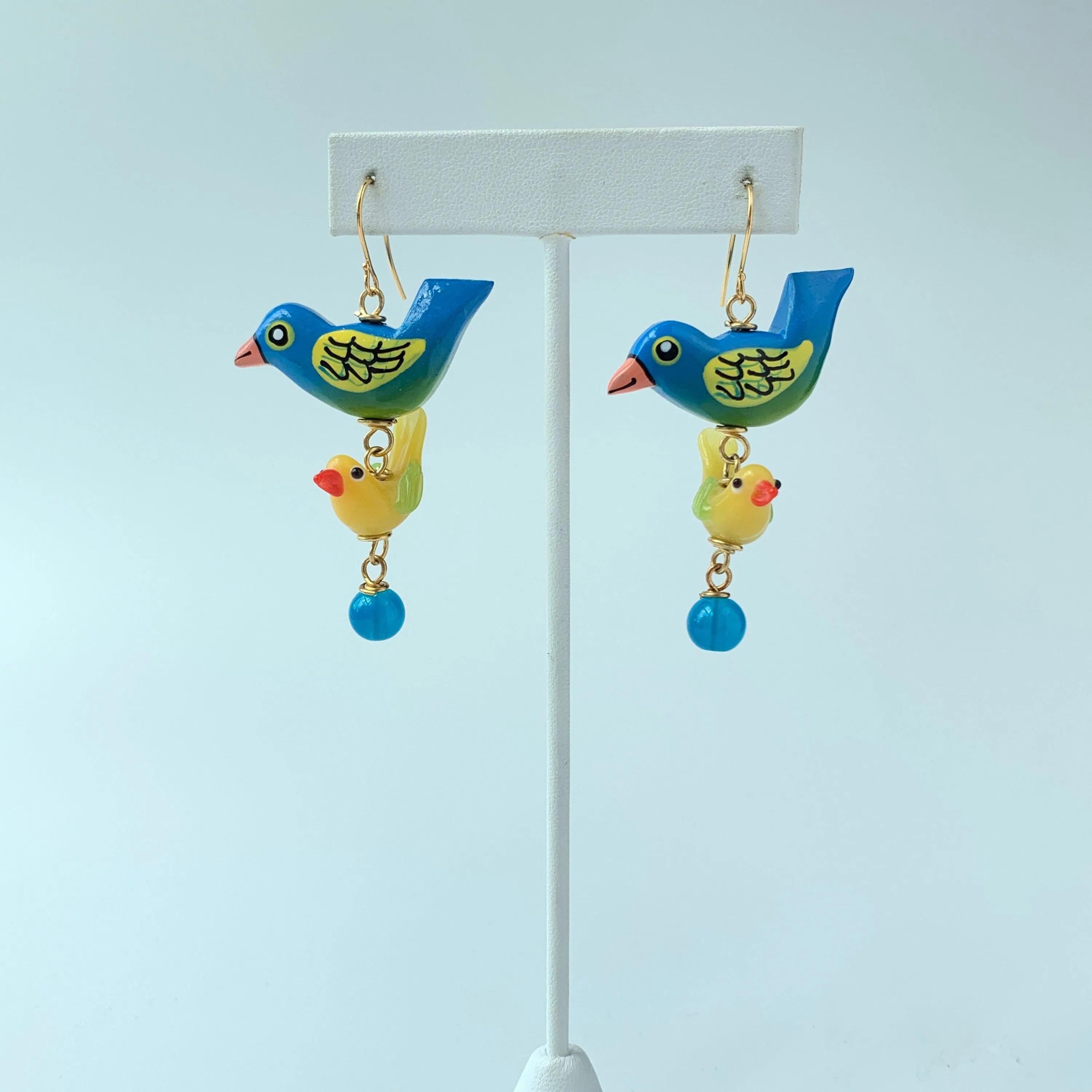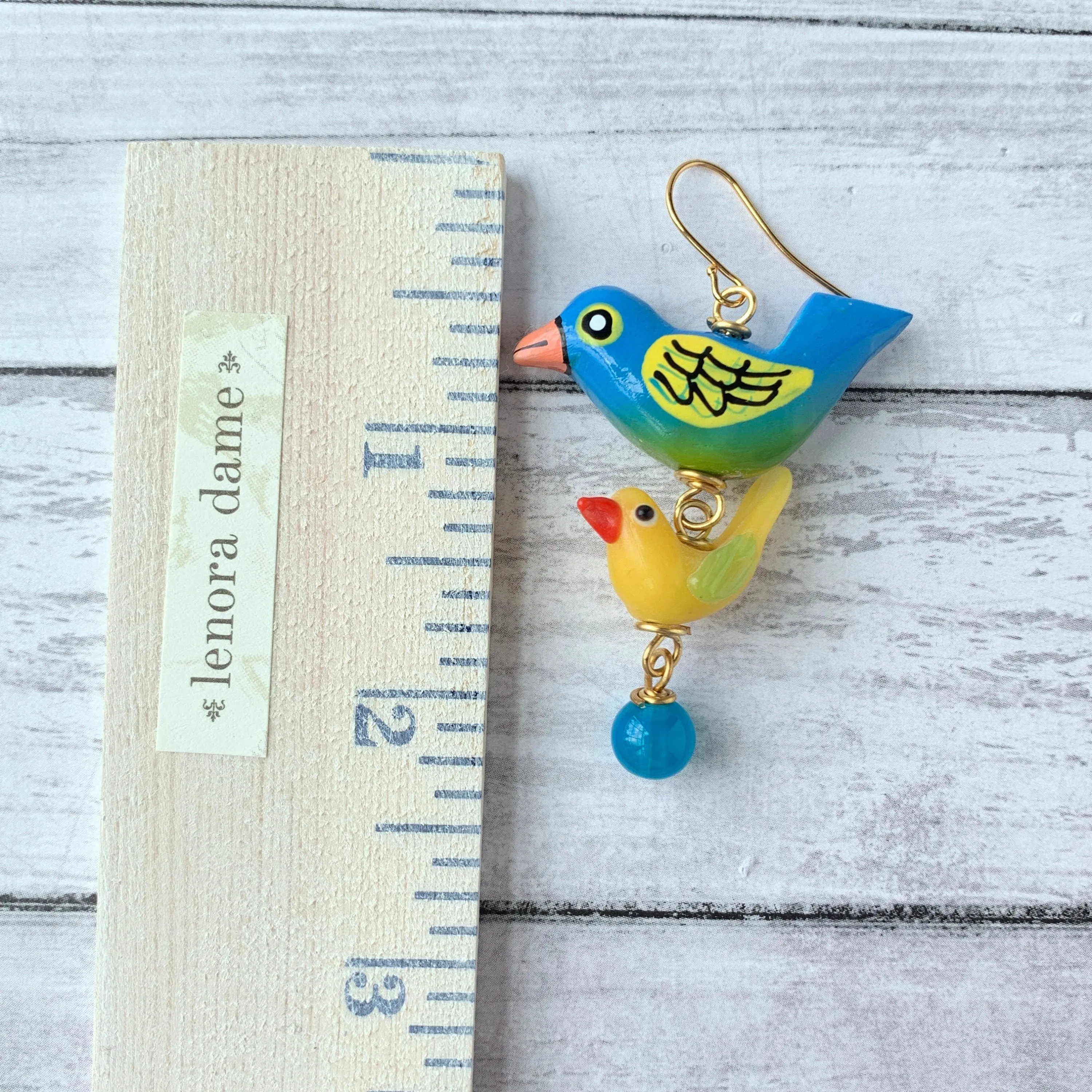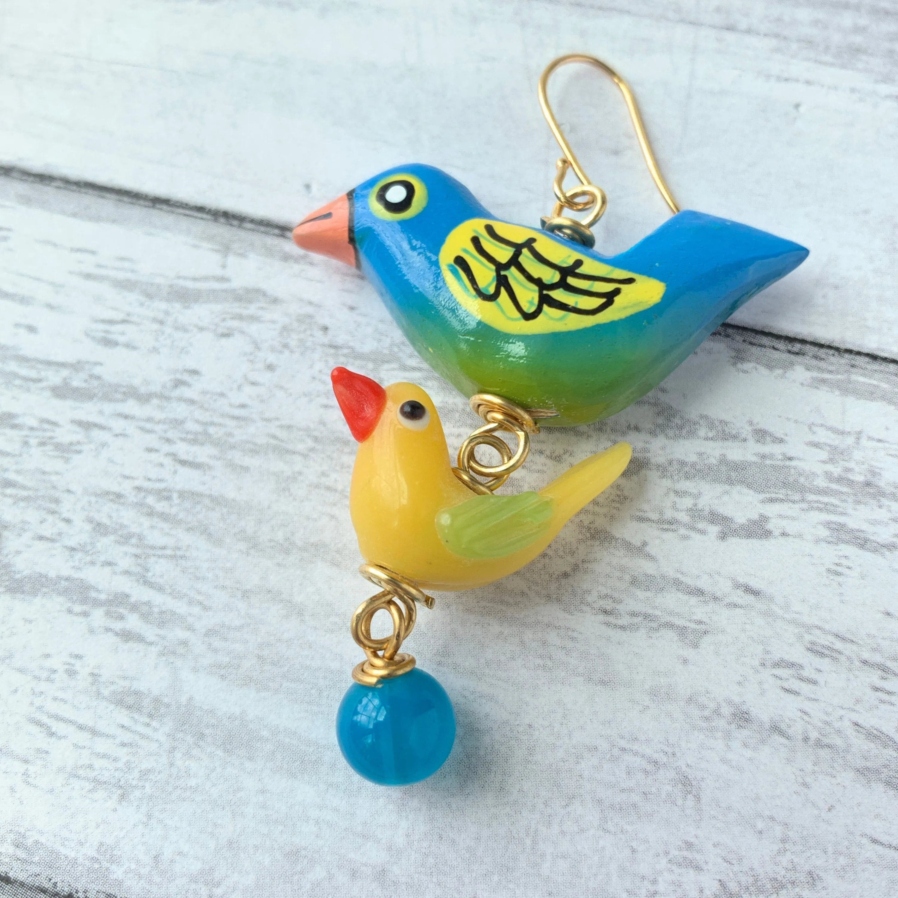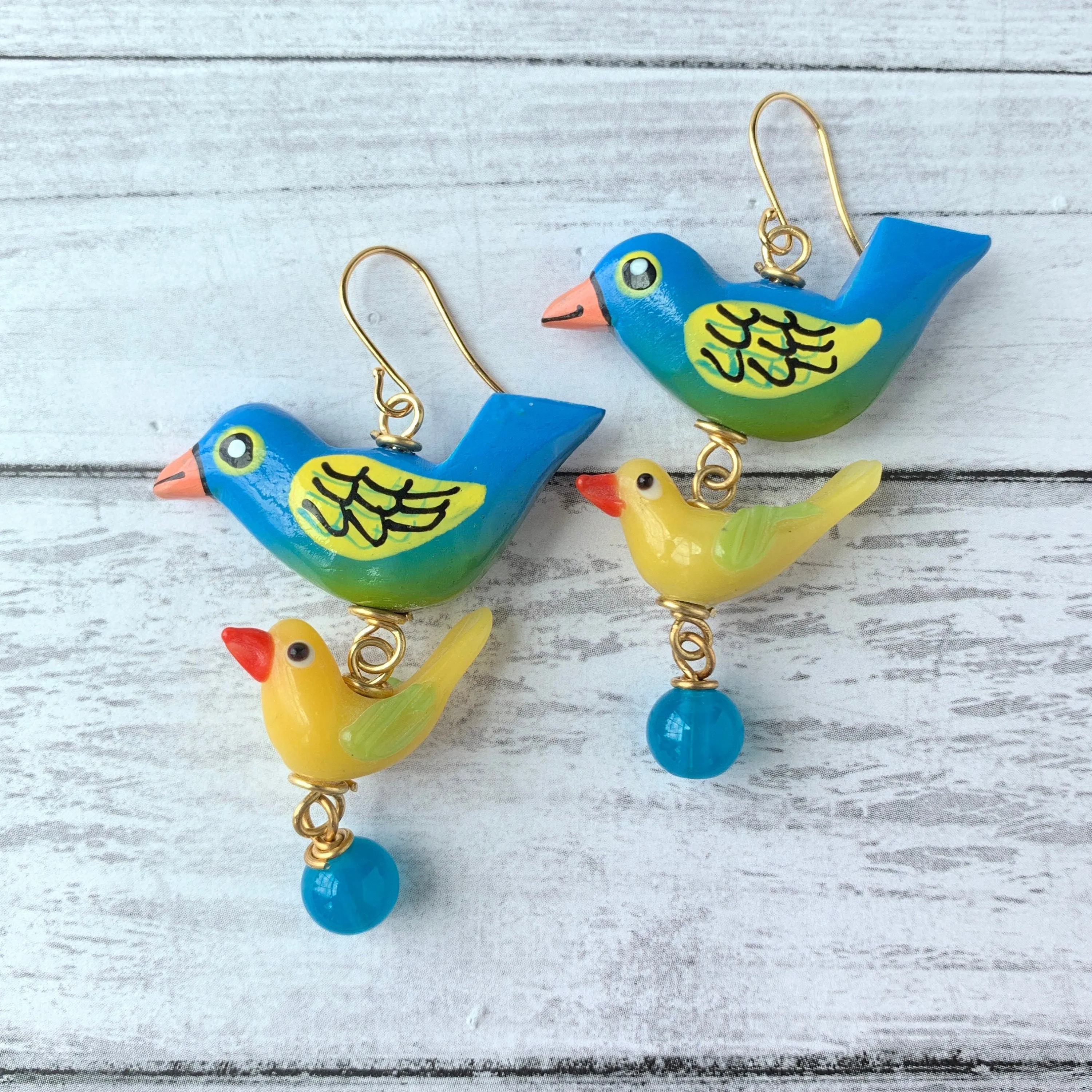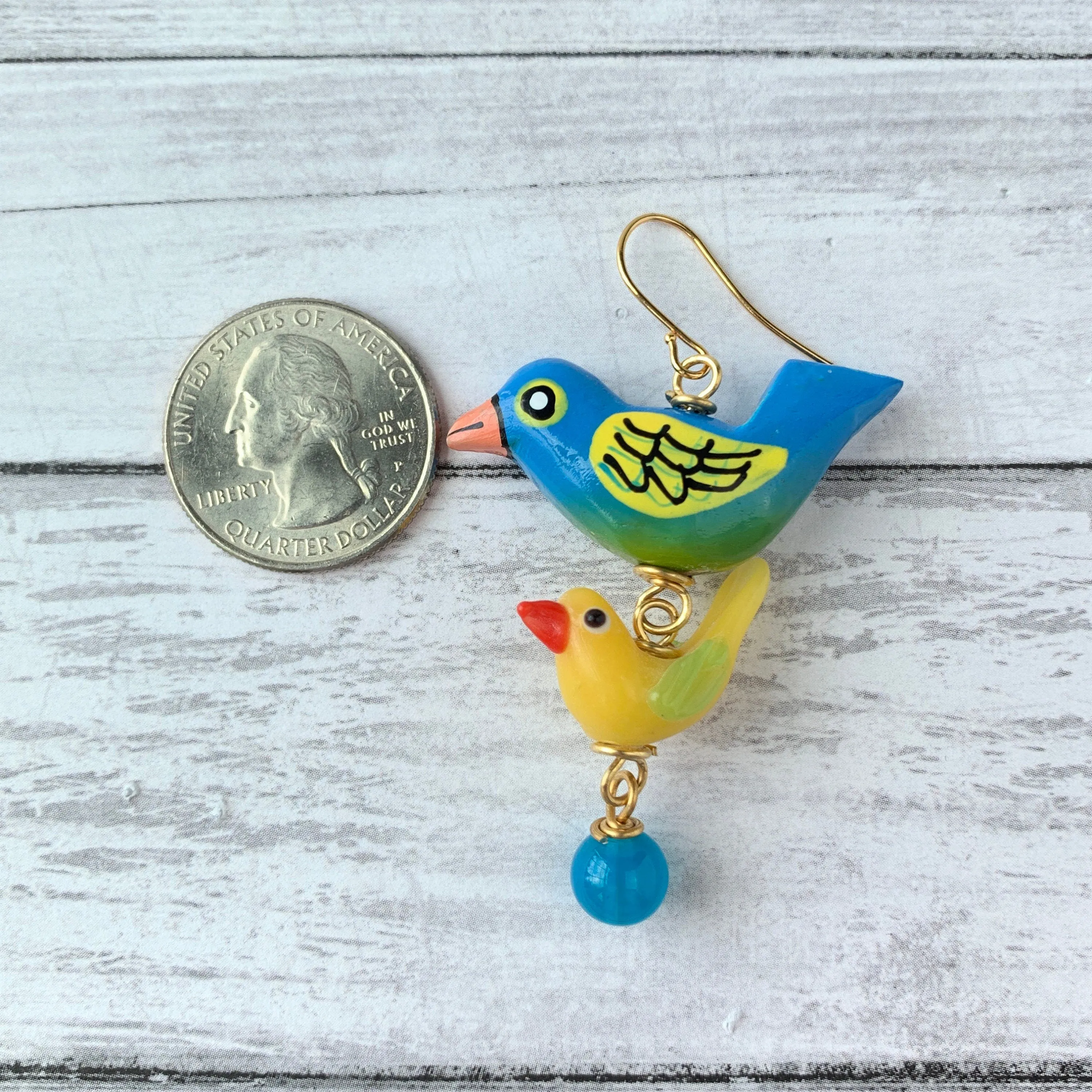 Colorful hand-painted wooden tropical bird in a deep sky blue with yellow wings along with a miniature detailed yellow with green wings glass lampworked bird dangling together with a translucent deep sky blue bead as the finishing touch on these tropical bird-themed statement earrings. Super fun earrings to complete that tropical beach outfit for your next Hawaiian Luau party, or to complete your beach vacation ensemble. Ear wires are gold-plated and nickel free. Lightweight! These are a perfect gift for tropical bird lovers or treat yourself for your next island vacation outfit! Thanks for looking!
