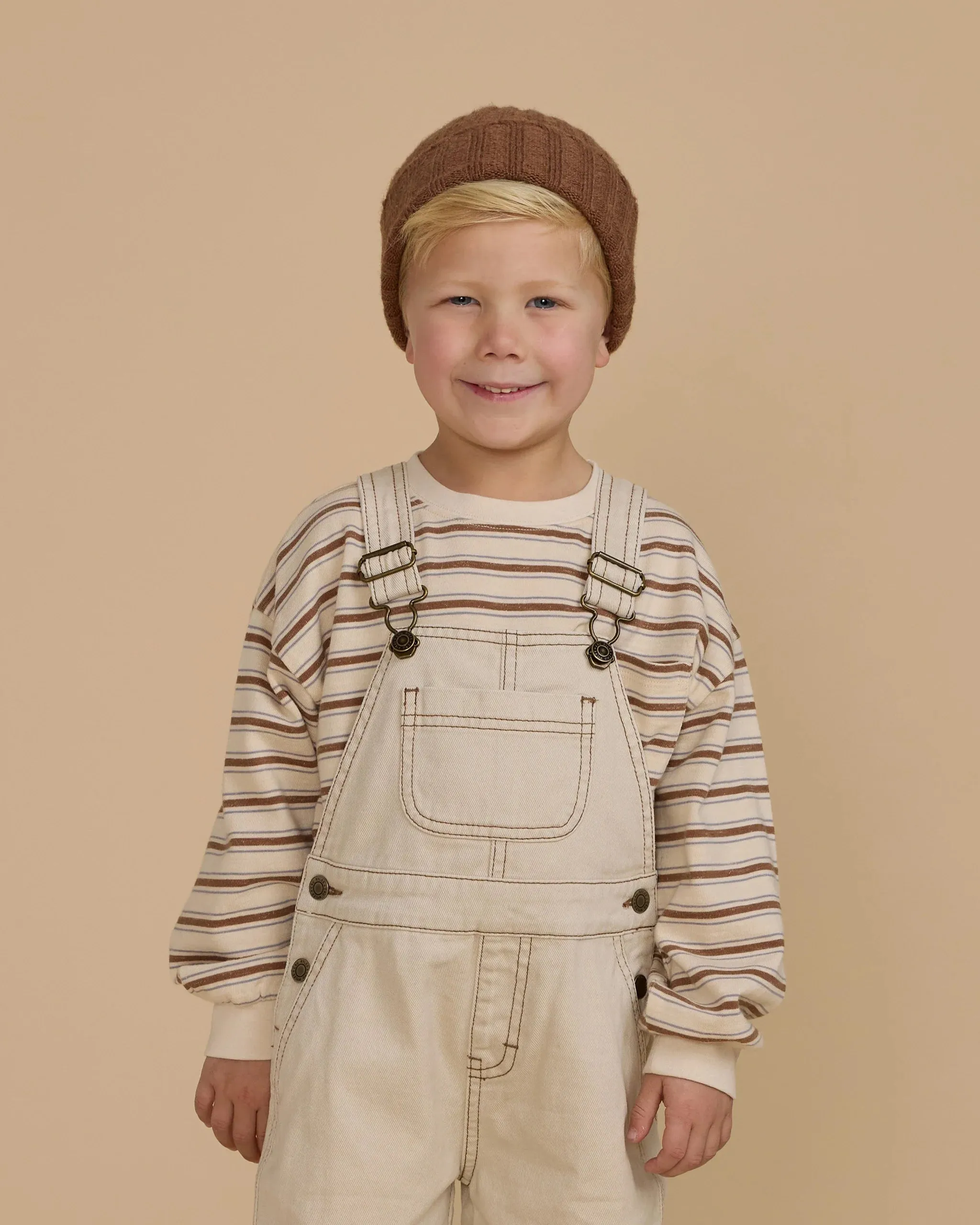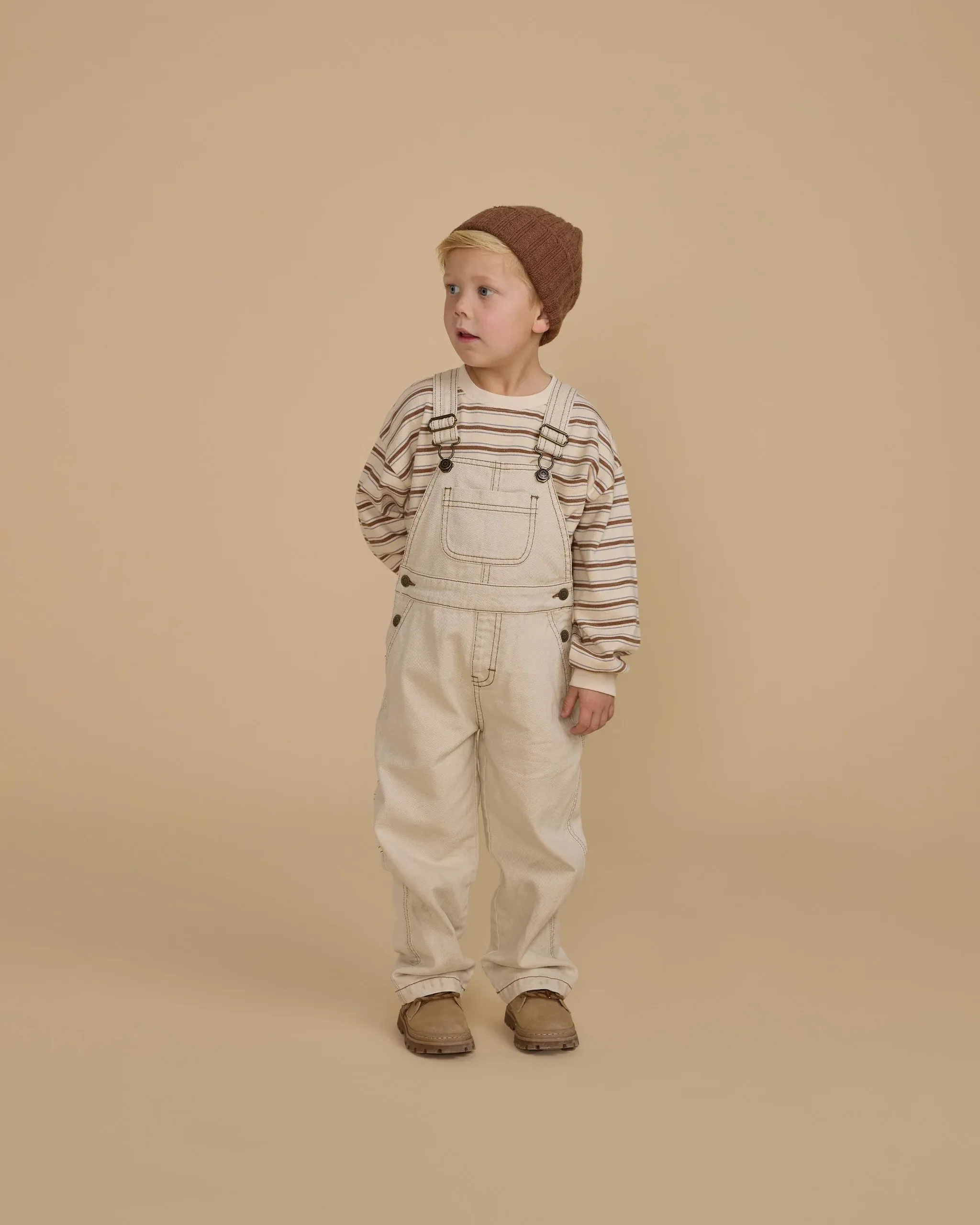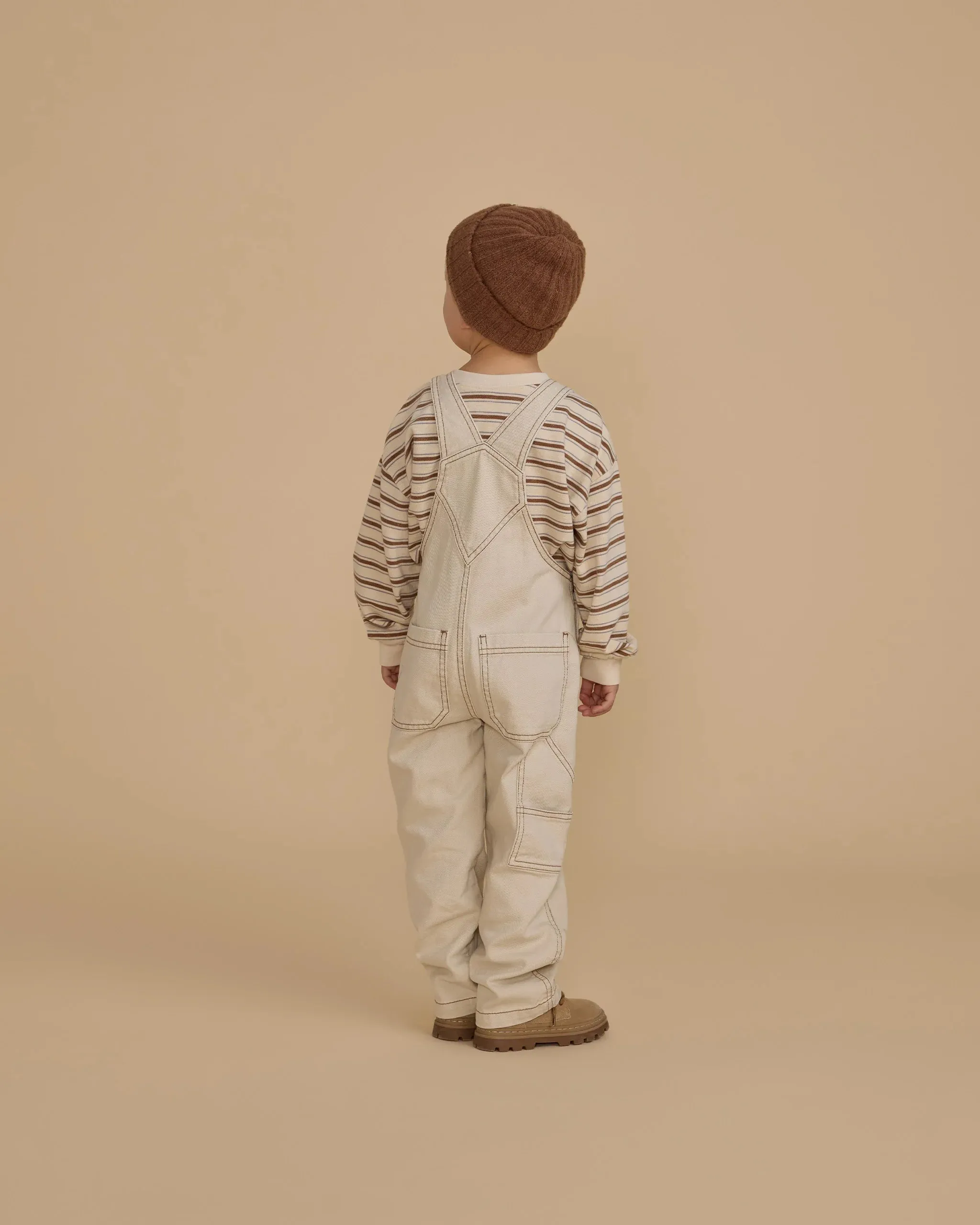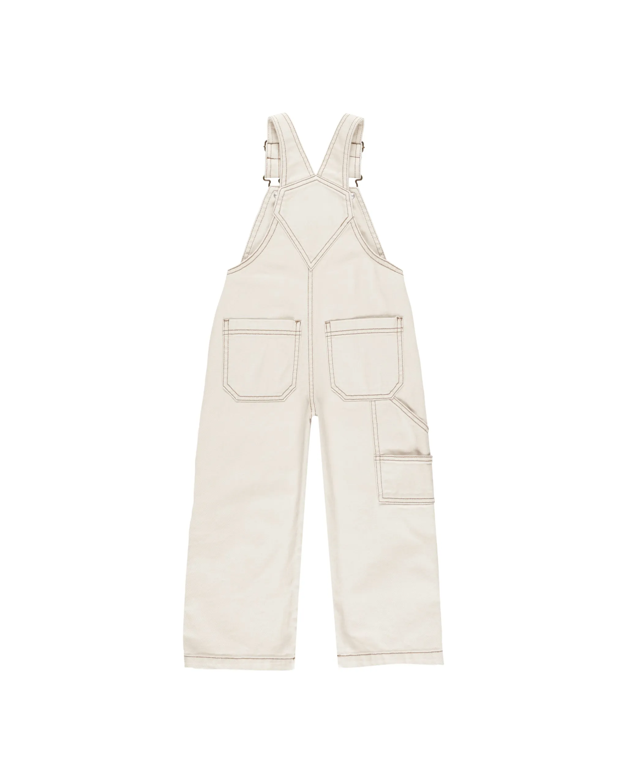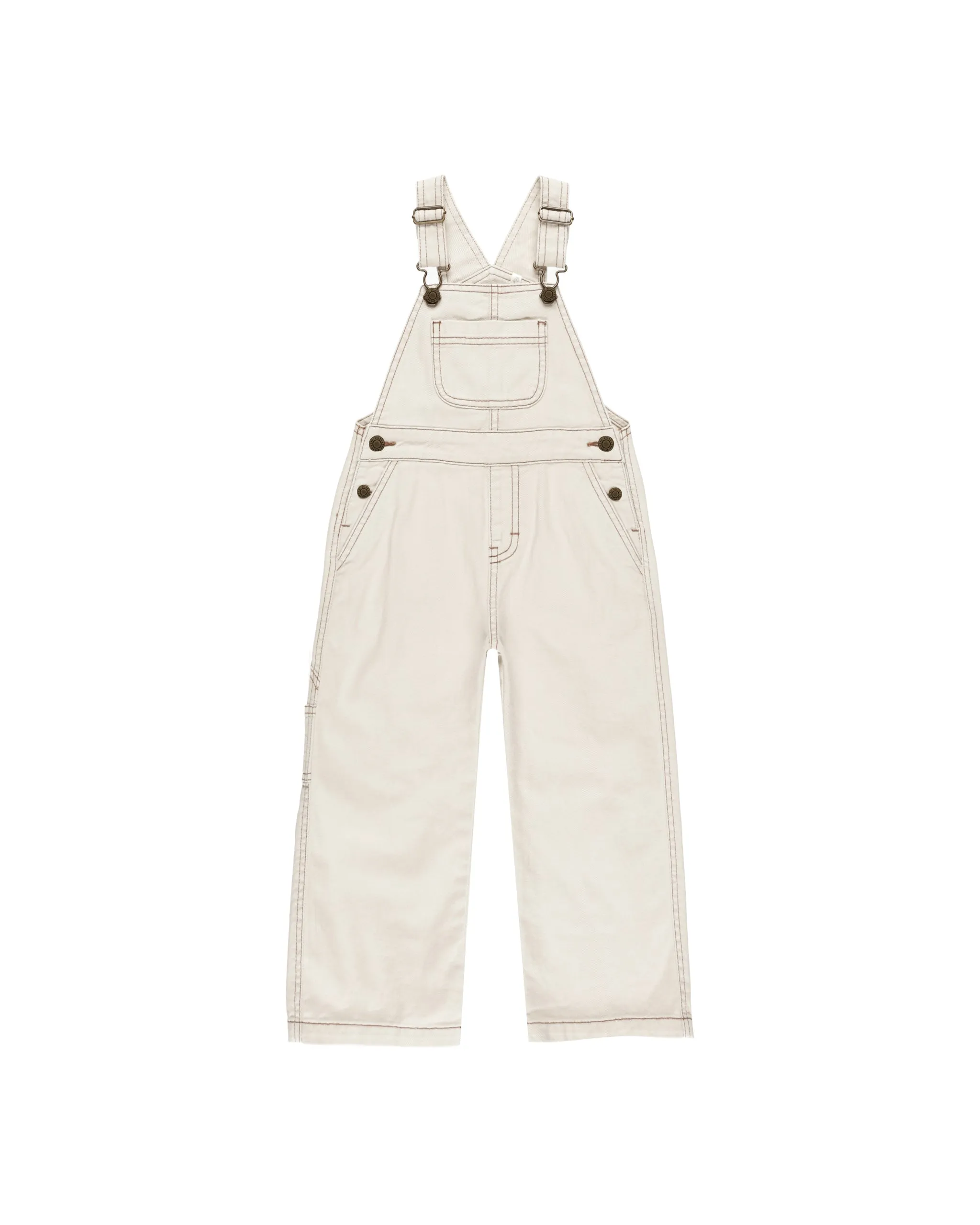 Our utility overalls have adjustable straps with metal buttons, an open bib pocket, and metal buttons at the sides. It also has back pockets!