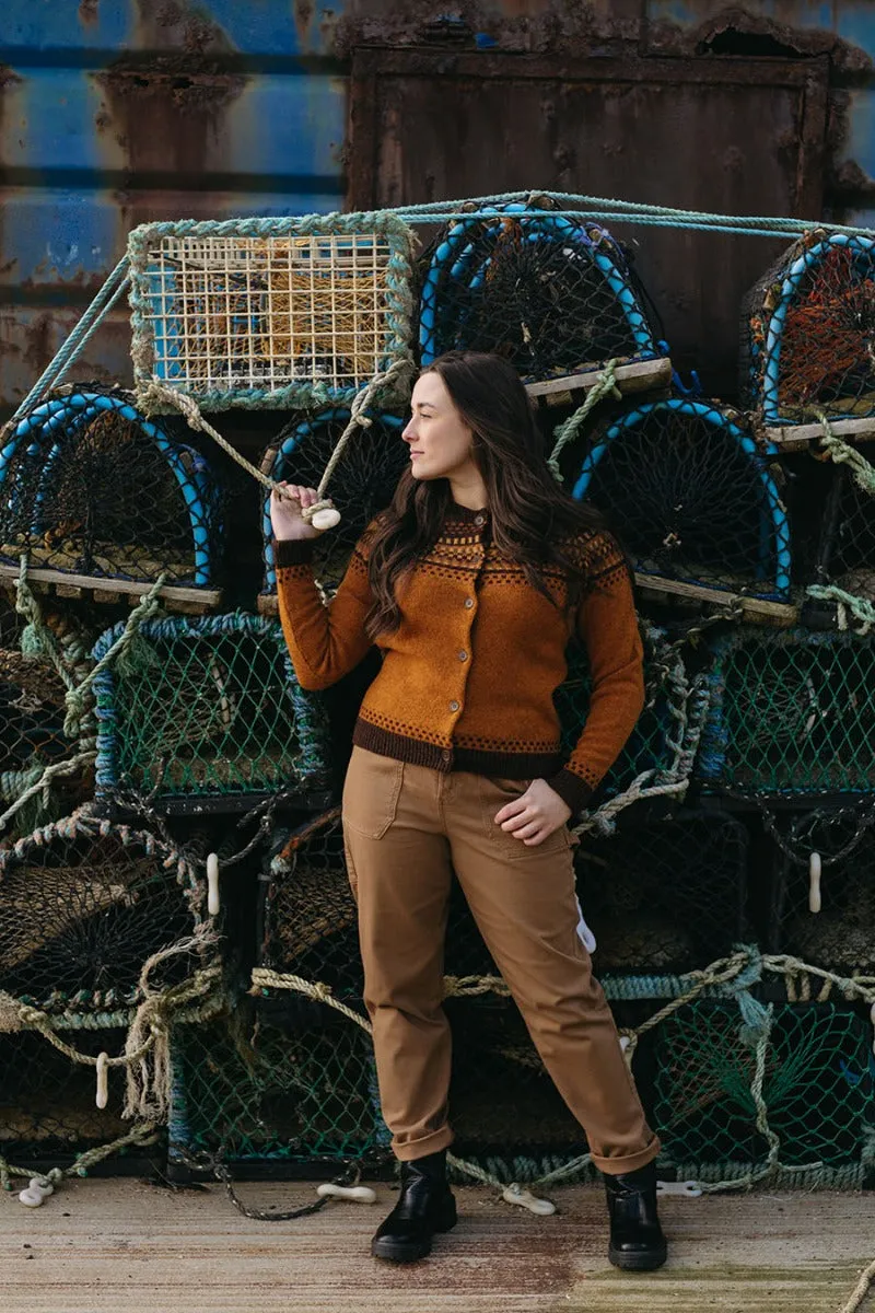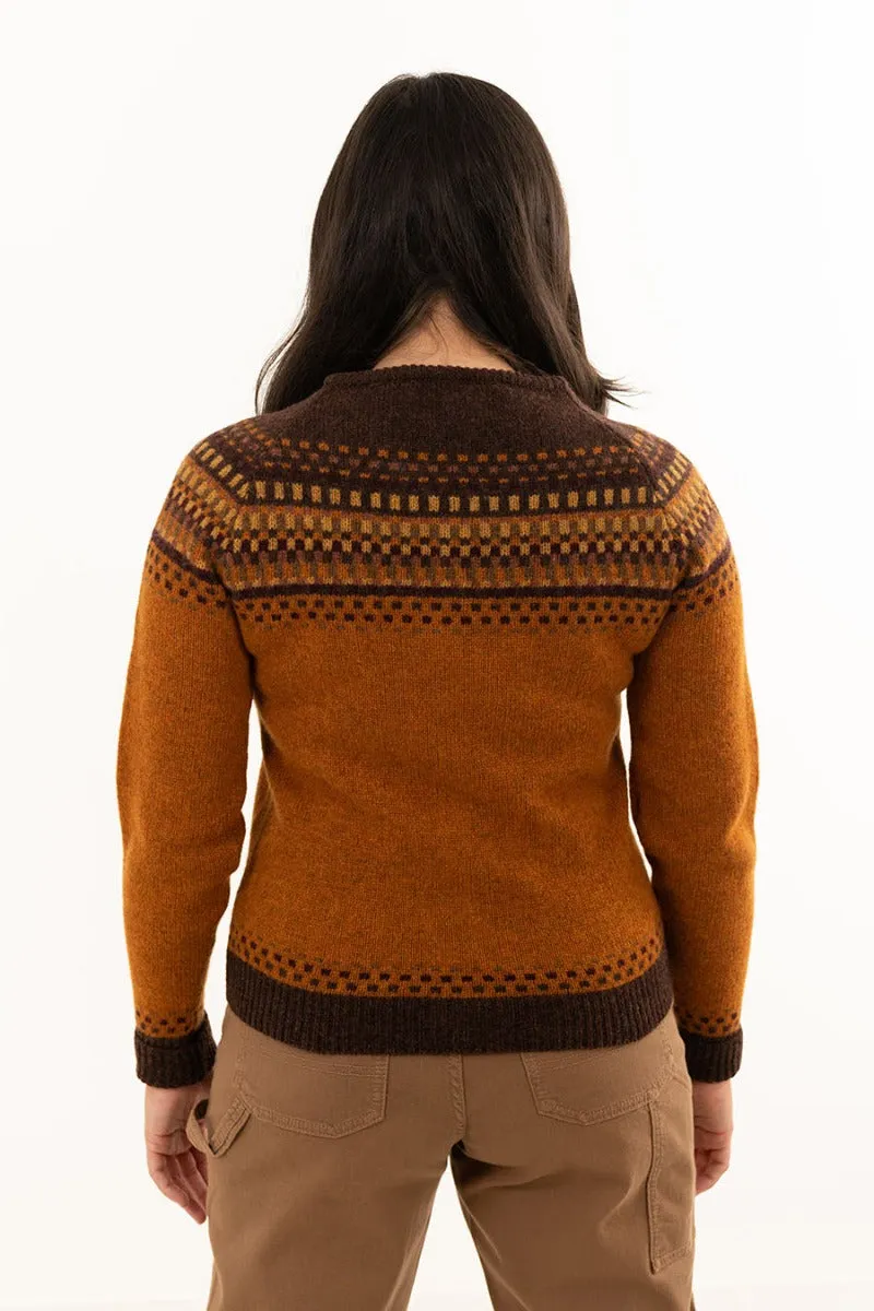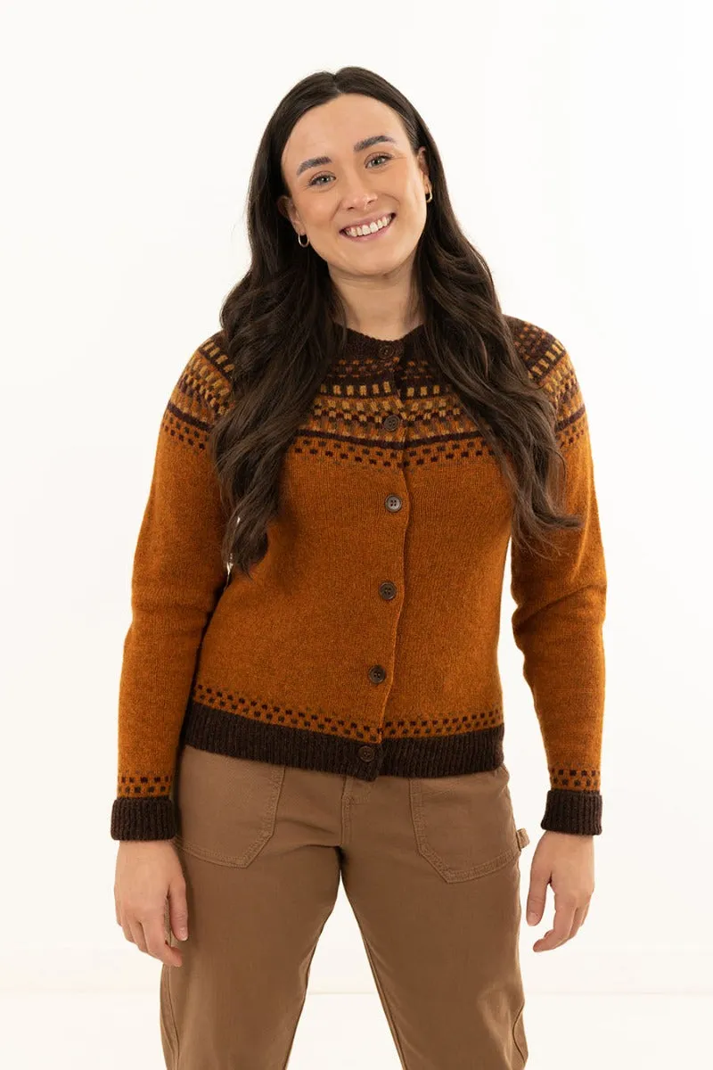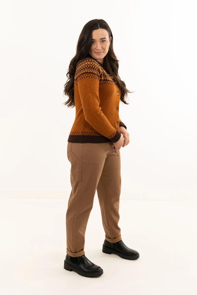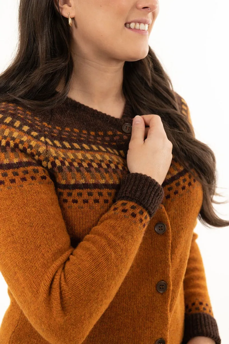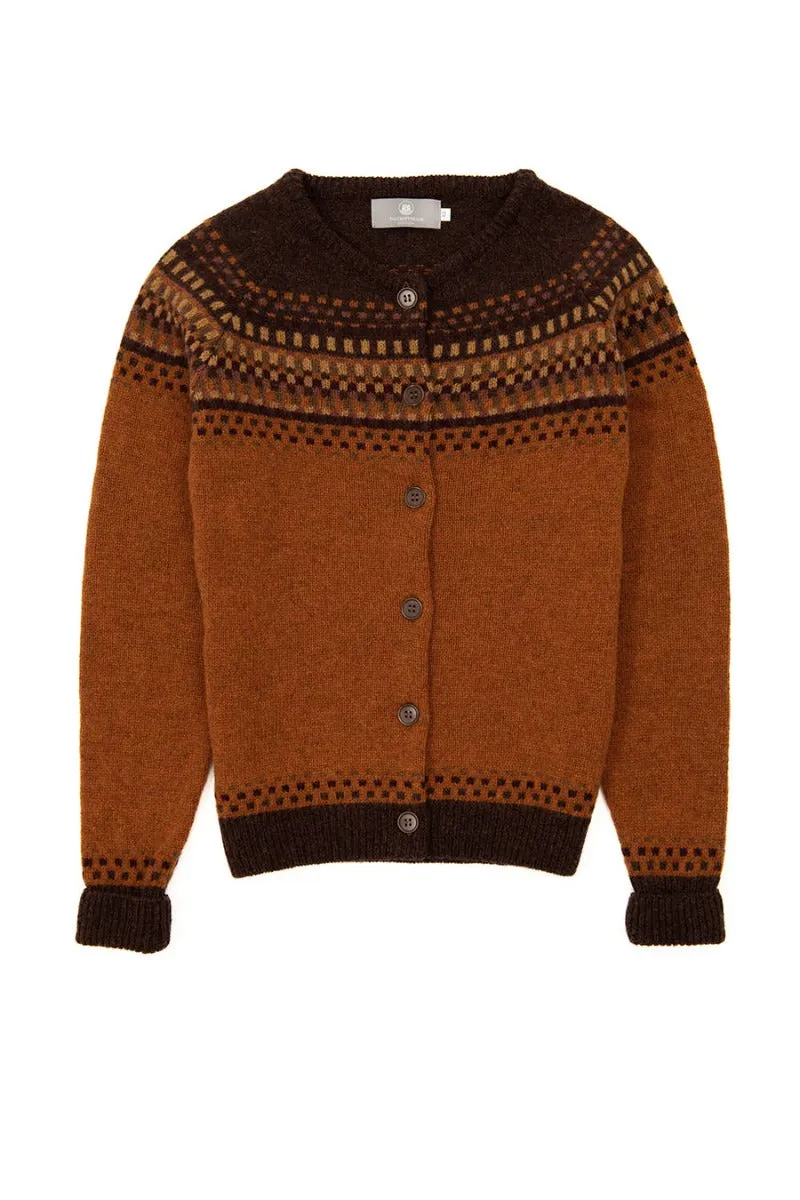 A modern, graphic pattern gives this womens cardigan a contemporary look. Despite its geometric design, it was created using the normal principles of fair isle design and as a nod to its heritage uses Shetland-character wool which is spun in Aberdeenshire. Fastened with environmentally friendly "corozo" buttons. Ribbed crew neck, hem and turn-back cuffs. Vintage Orange colourway is a muted yellow-orange with patterns in warm browns and rich autumnal tones.