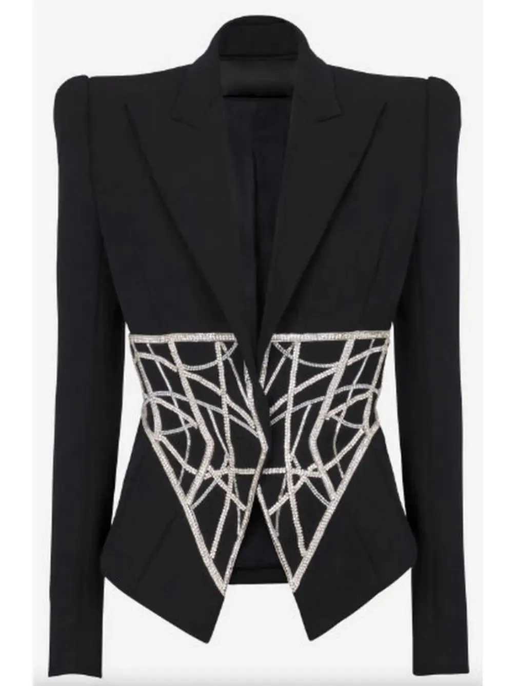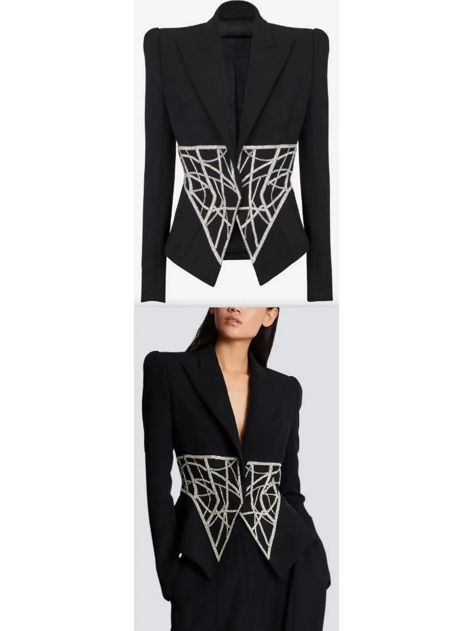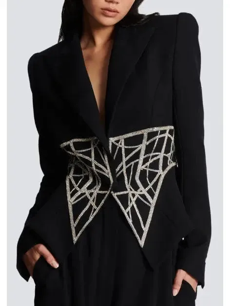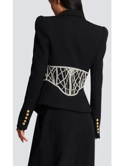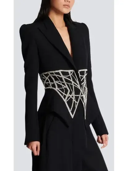 Enhance your professional wardrobe with our Crystal Corseted Belt-Effect Blazer. The built-in corset cinches your waist in all the right places, giving you a sleek and elegant silhouette. The crystal detailing adds a touch of glamor to this timeless piece. Enrich your style and confidence with our blazer.
