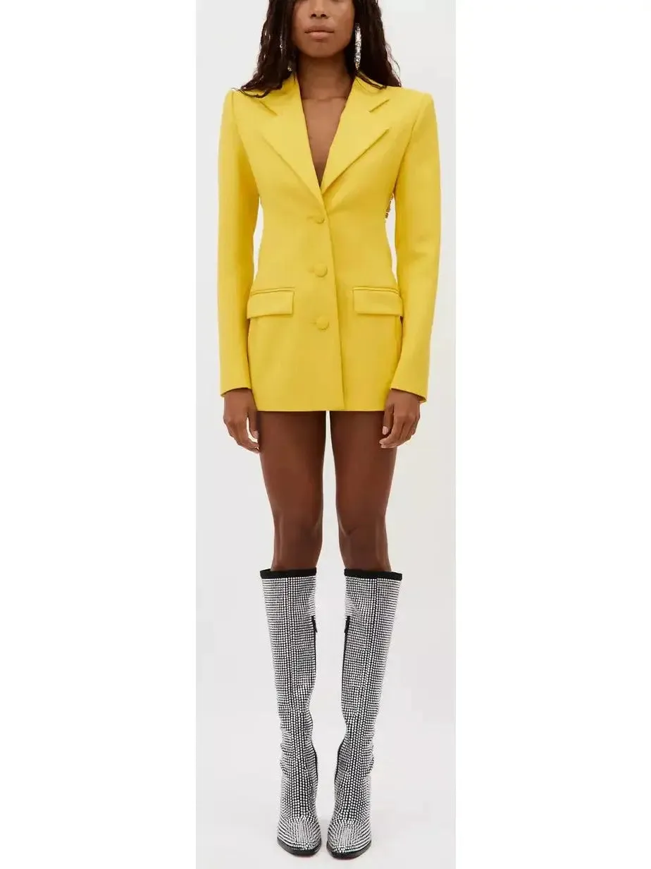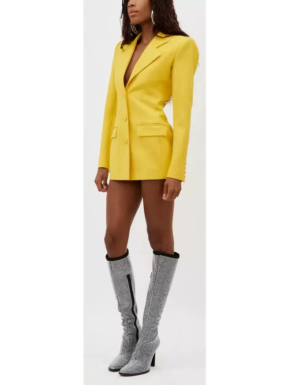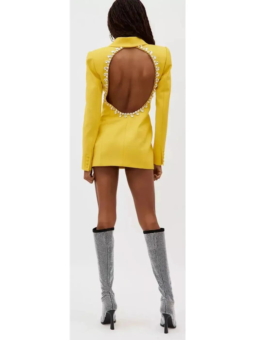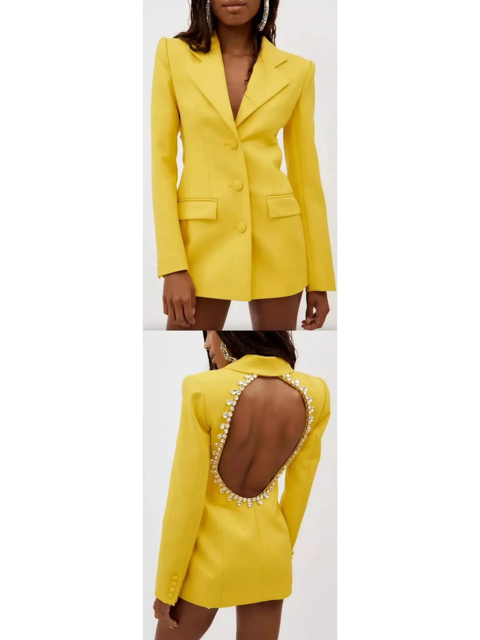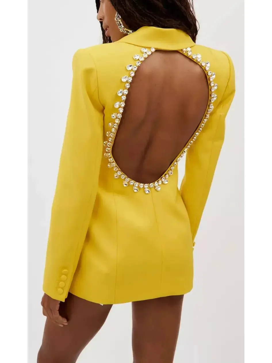 Step into the spotlight with our Crystal Open-Back Yellow Blazer/Dress. The elegant crystal detailing adds a touch of glamour, while the open-back design shows off some skin. This versatile piece can be worn as a blazer or a dress, making it a must-have for any wardrobe. Be the center of attention at any event or meeting in this stunning piece.